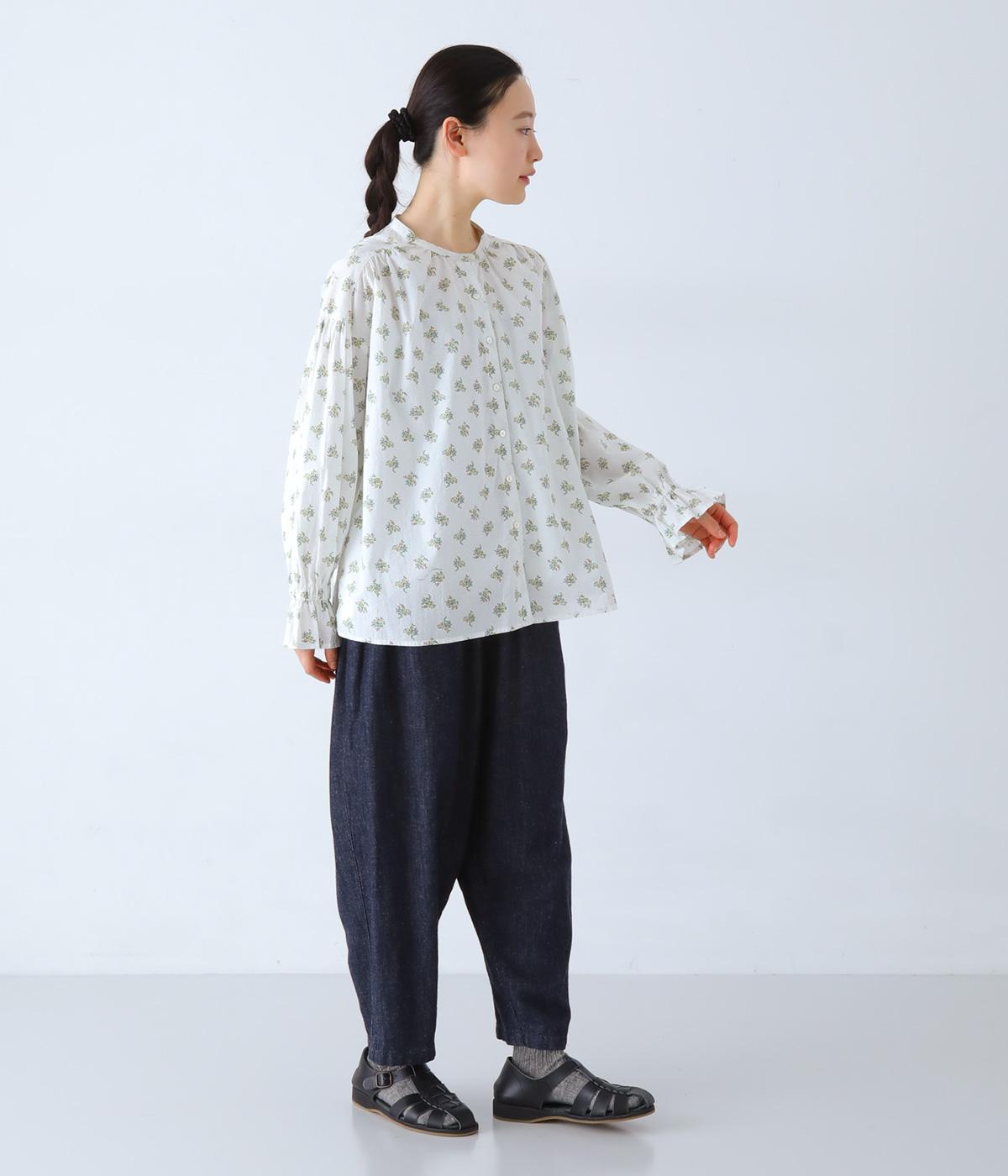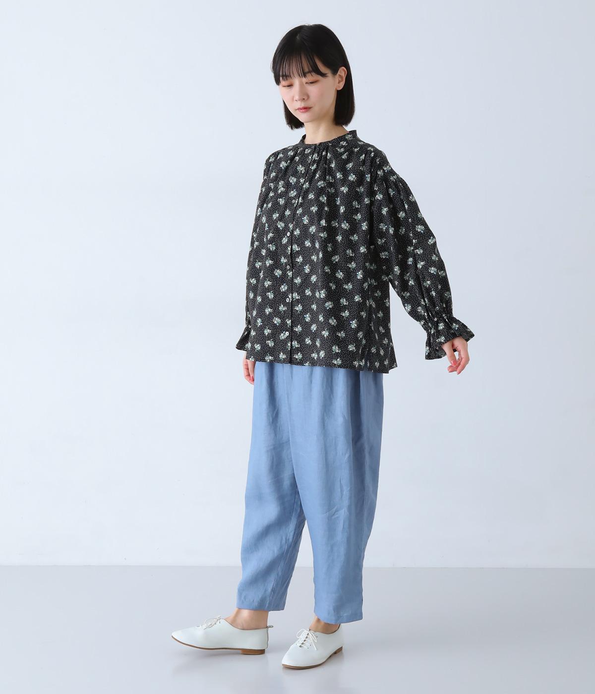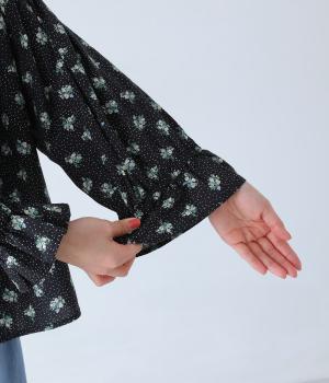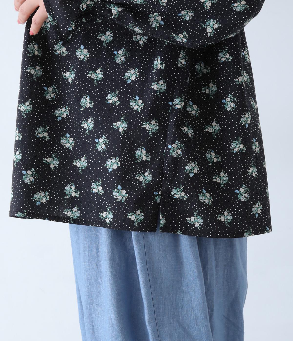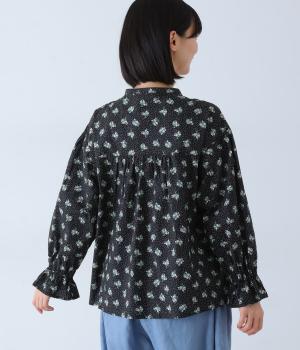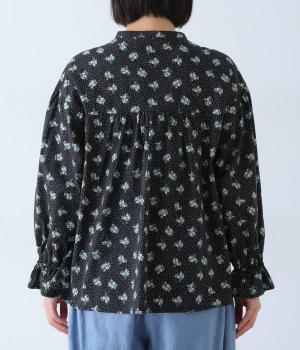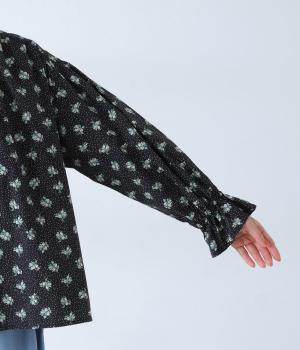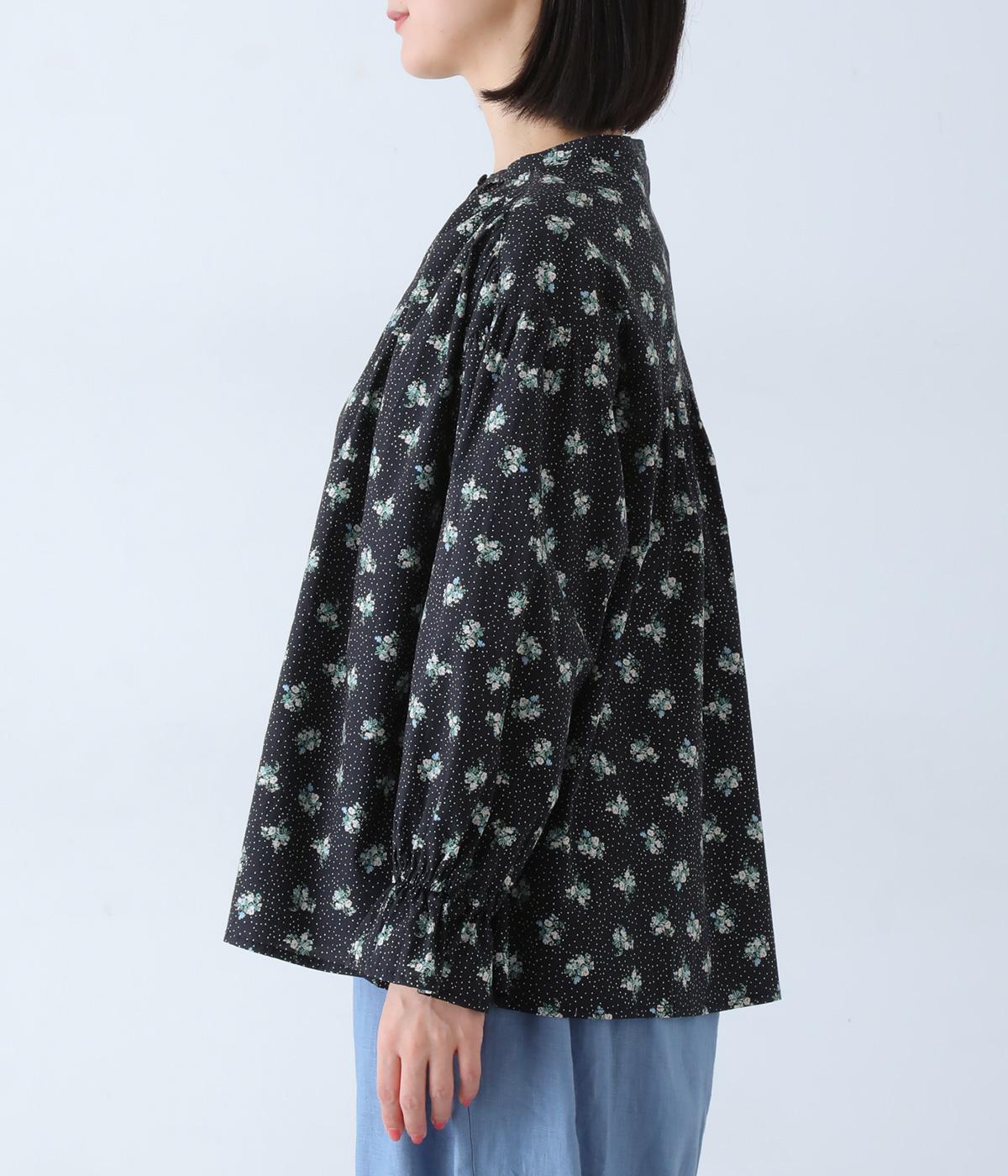 フラワー×ピンドット柄のナチュラルなプリントが特徴のブラウス。背面ヨークにはギャザーを施し、ゆったりと着用できるシルエットに。袖口のキャンディスリーブと第一ボタンのループ仕様が、さりげない可愛らしさをプラスしてくれます。