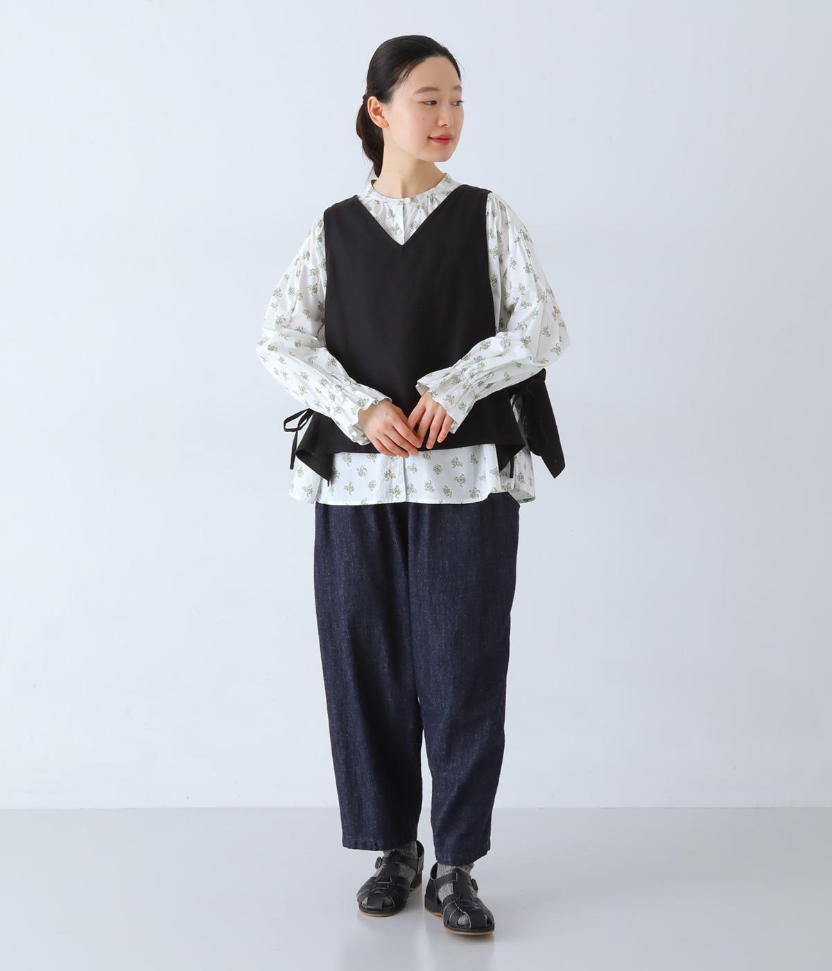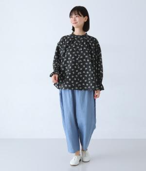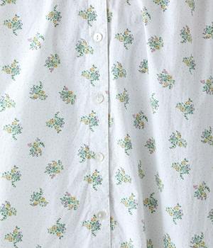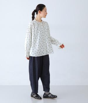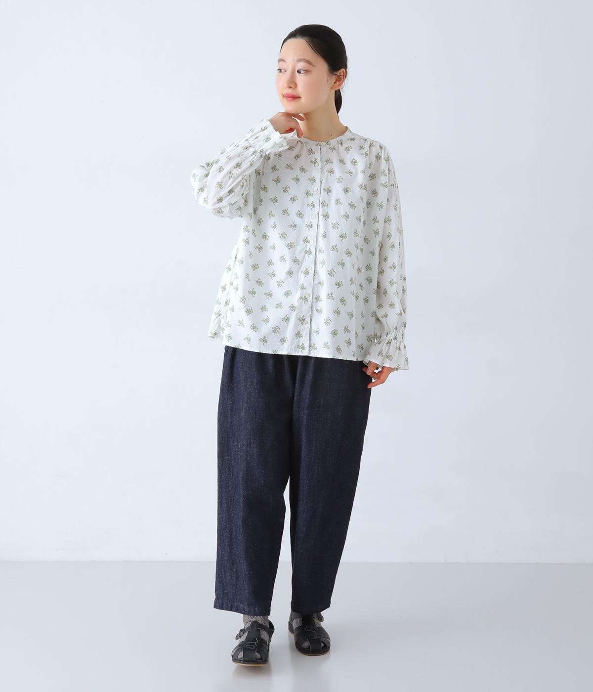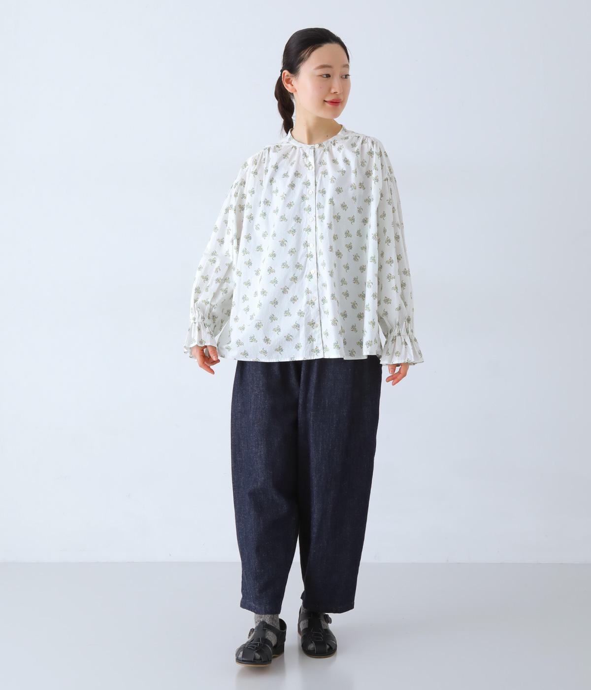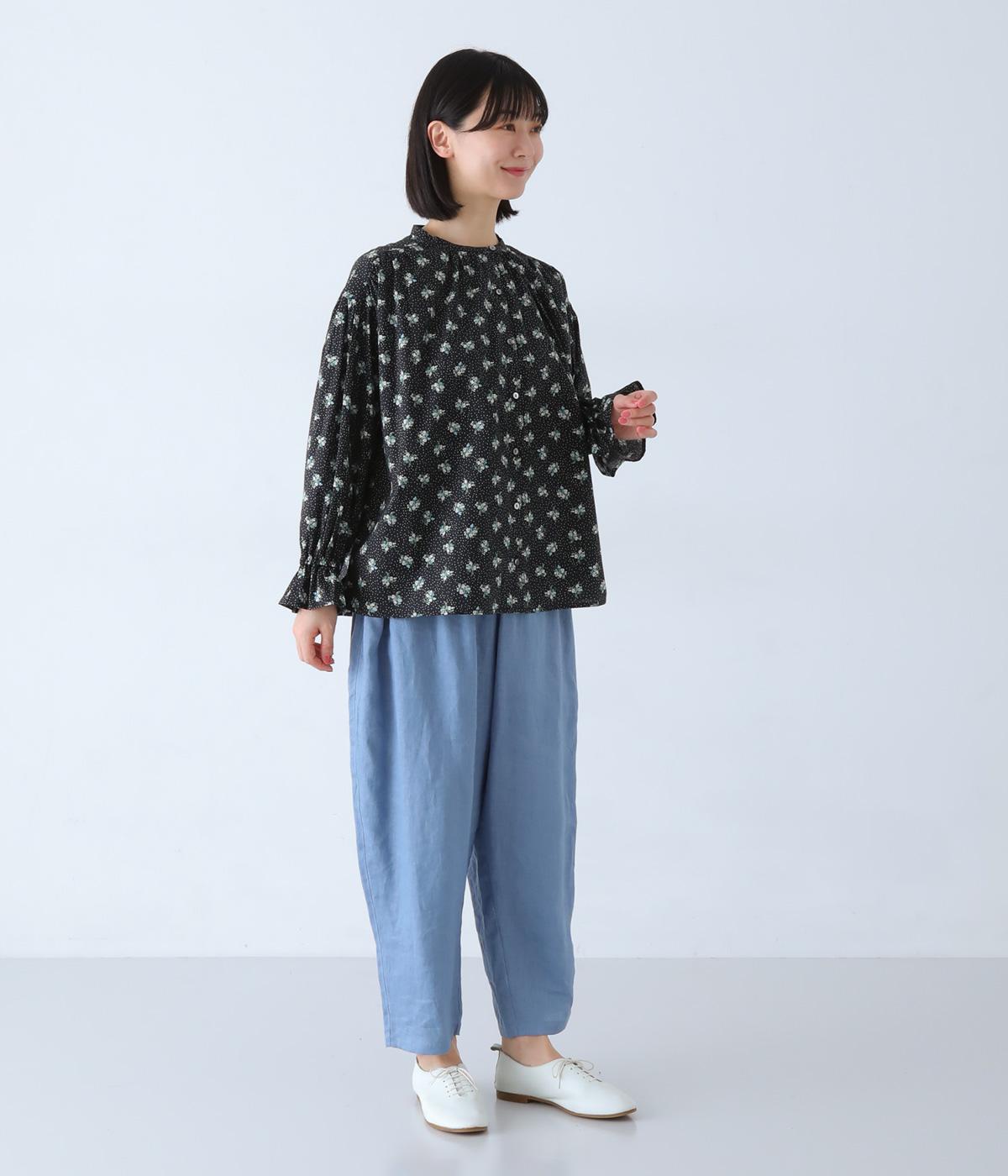 フラワー×ピンドット柄のナチュラルなプリントが特徴のブラウス。背面ヨークにはギャザーを施し、ゆったりと着用できるシルエットに。袖口のキャンディスリーブと第一ボタンのループ仕様が、さりげない可愛らしさをプラスしてくれます。