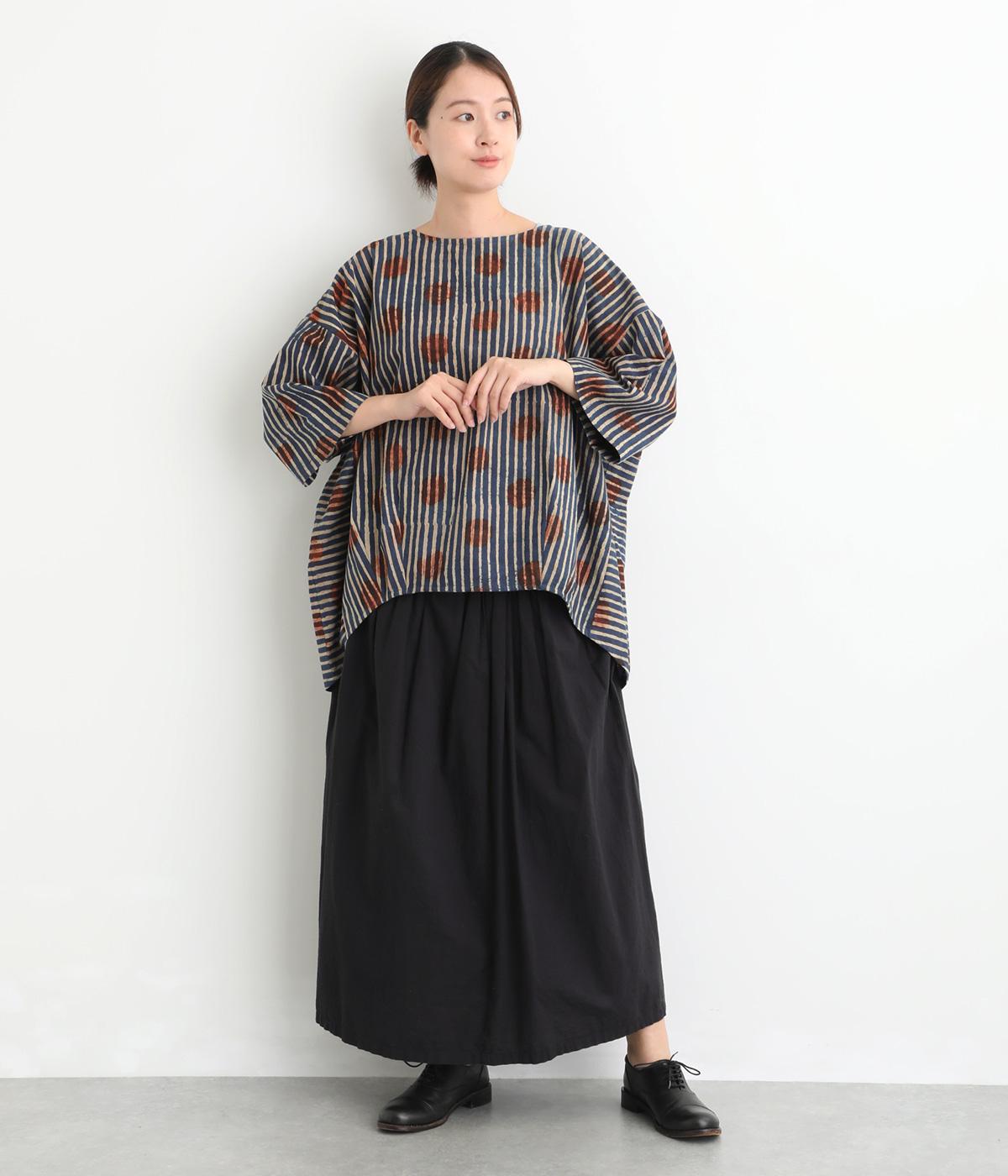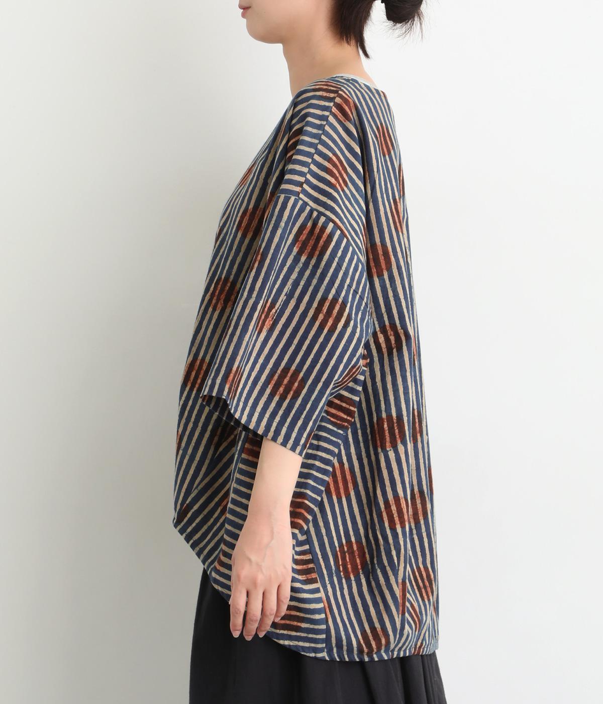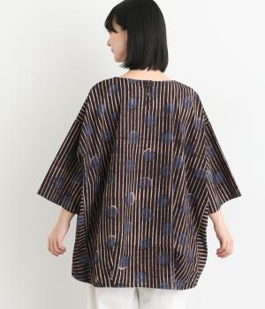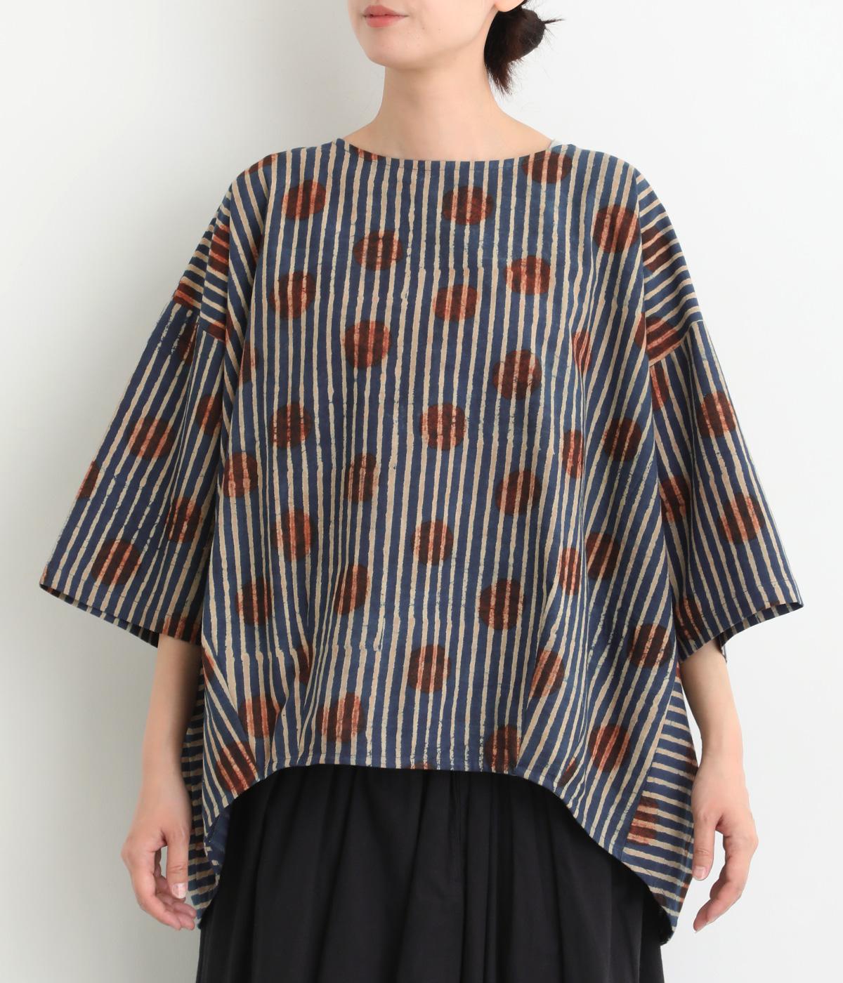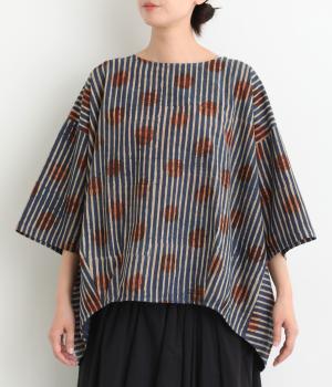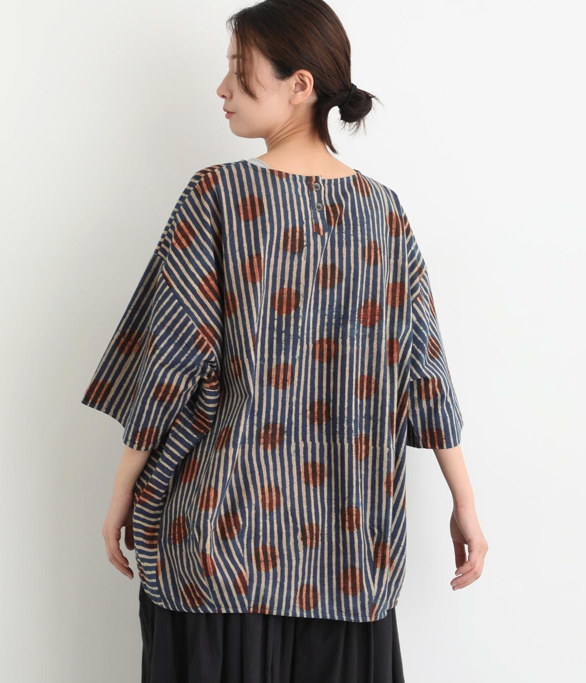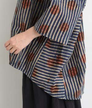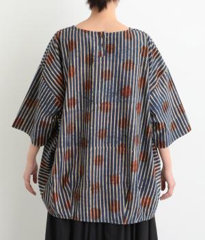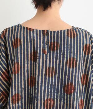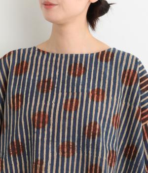 インドの伝統技法で仕立てたクラフト感のあるプルオーバーです。一色ずつ手作業で刷るブロックプリントでドットとストライプをあしらいました。ボクシーなシルエットに合わせてストライプの向きに変化を持たせ、リラックス感がありながらもすっきりとした見た目に仕上げました。