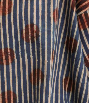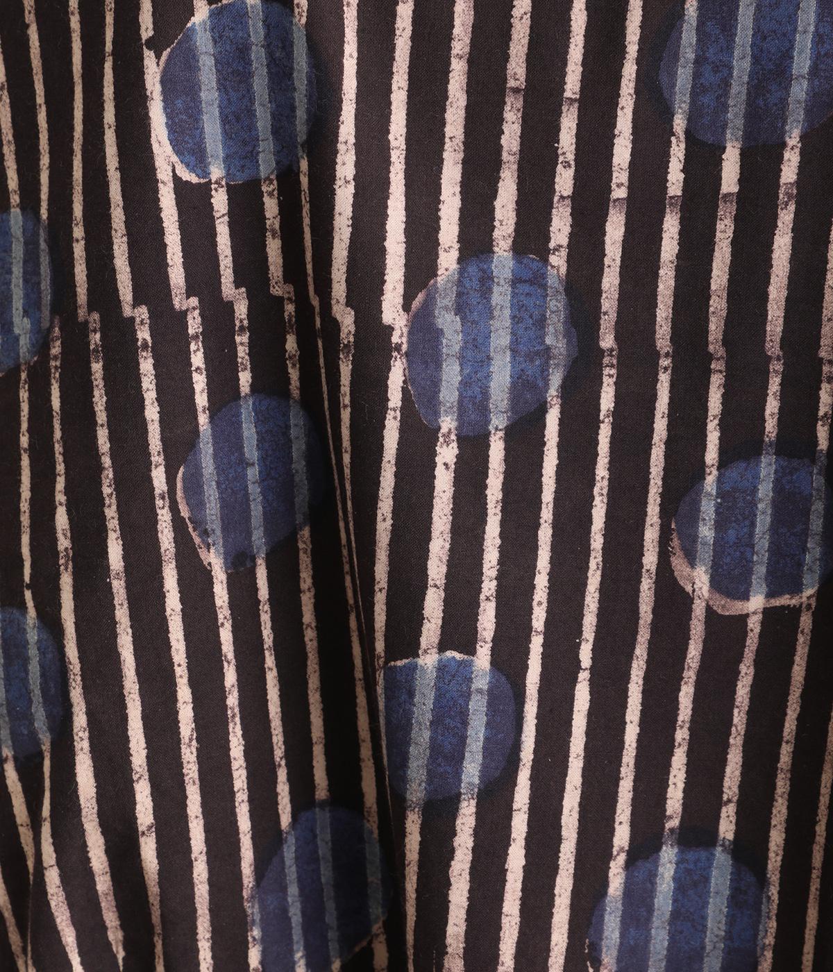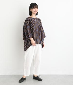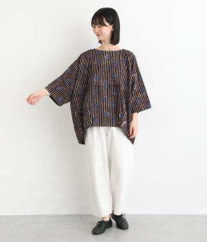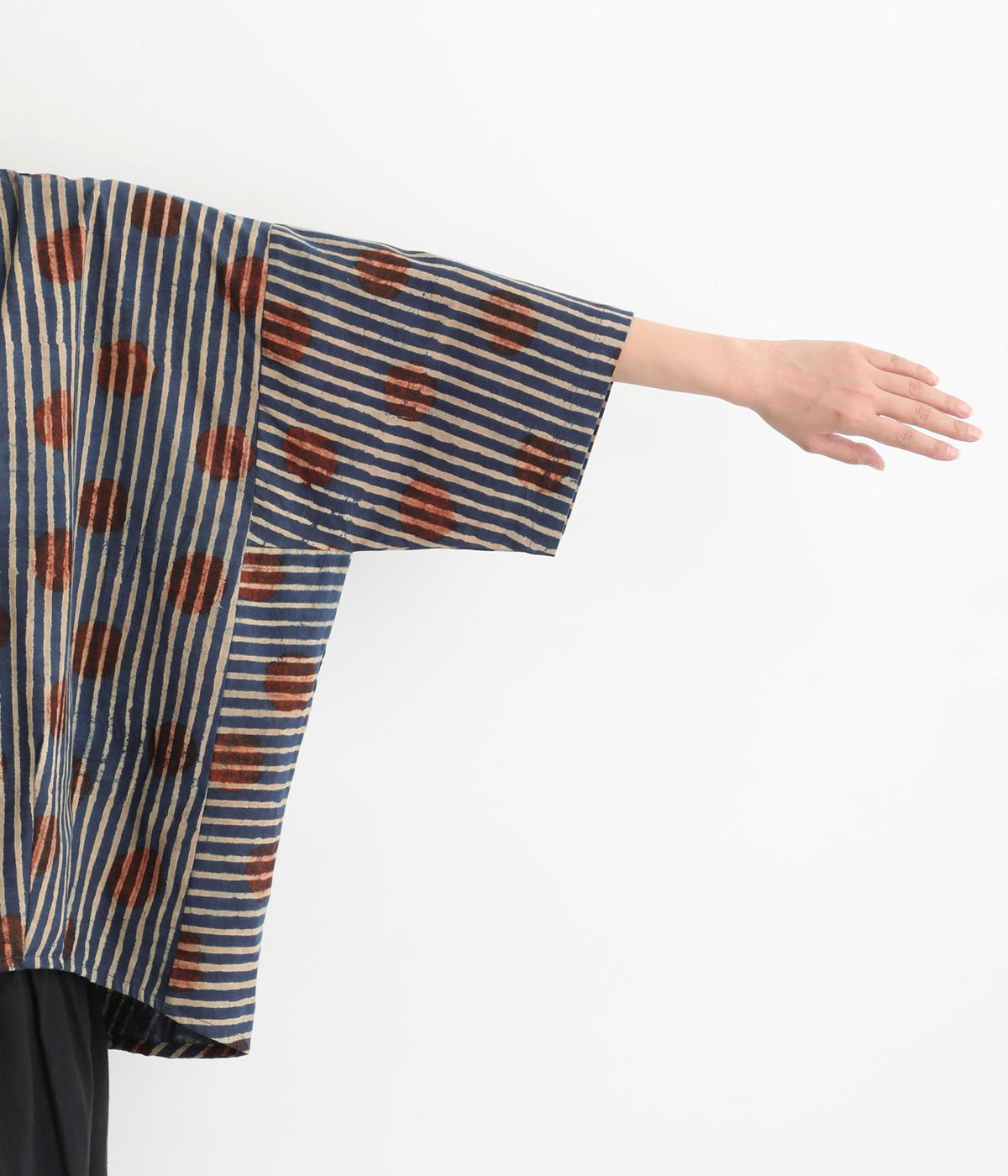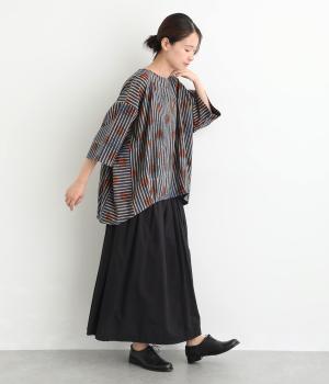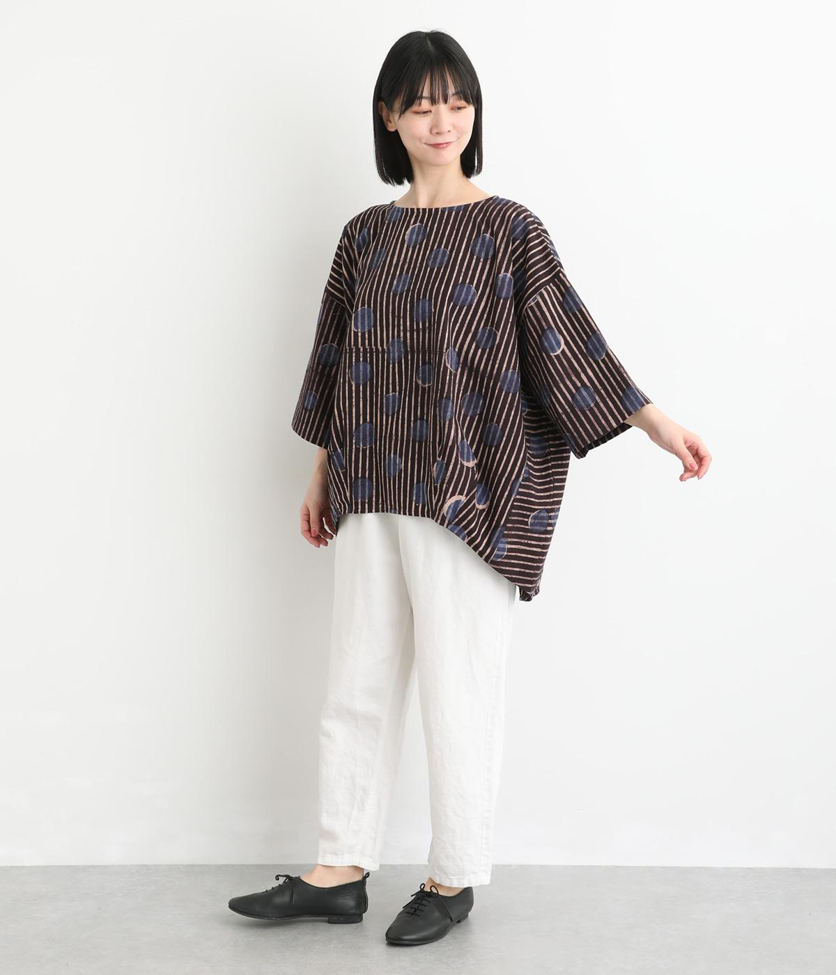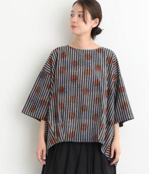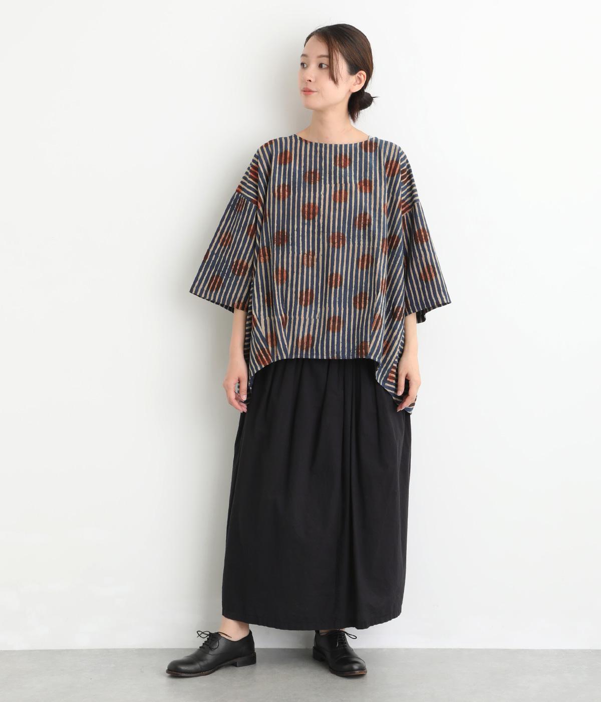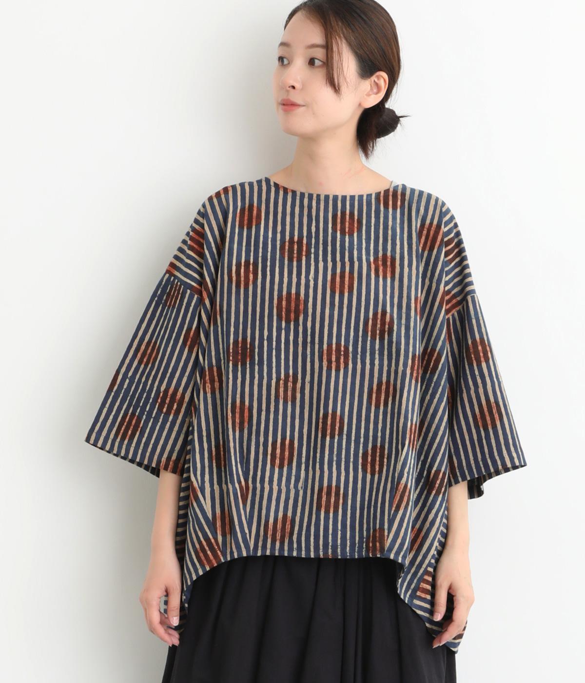インドの伝統技法で仕立てたクラフト感のあるプルオーバーです。一色ずつ手作業で刷るブロックプリントでドットとストライプをあしらいました。ボクシーなシルエットに合わせてストライプの向きに変化を持たせ、リラックス感がありながらもすっきりとした見た目に仕上げました。