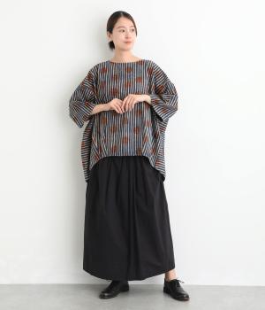 素肌にやさしいコットン生地をセレクトしました。ほどよい厚さでコシがあり、シルエットを美しく保ちます。手作業による、かすれやにじみのあるスタンプのような柄の風合いは、手しごとならではの温かみのある雰囲気です。