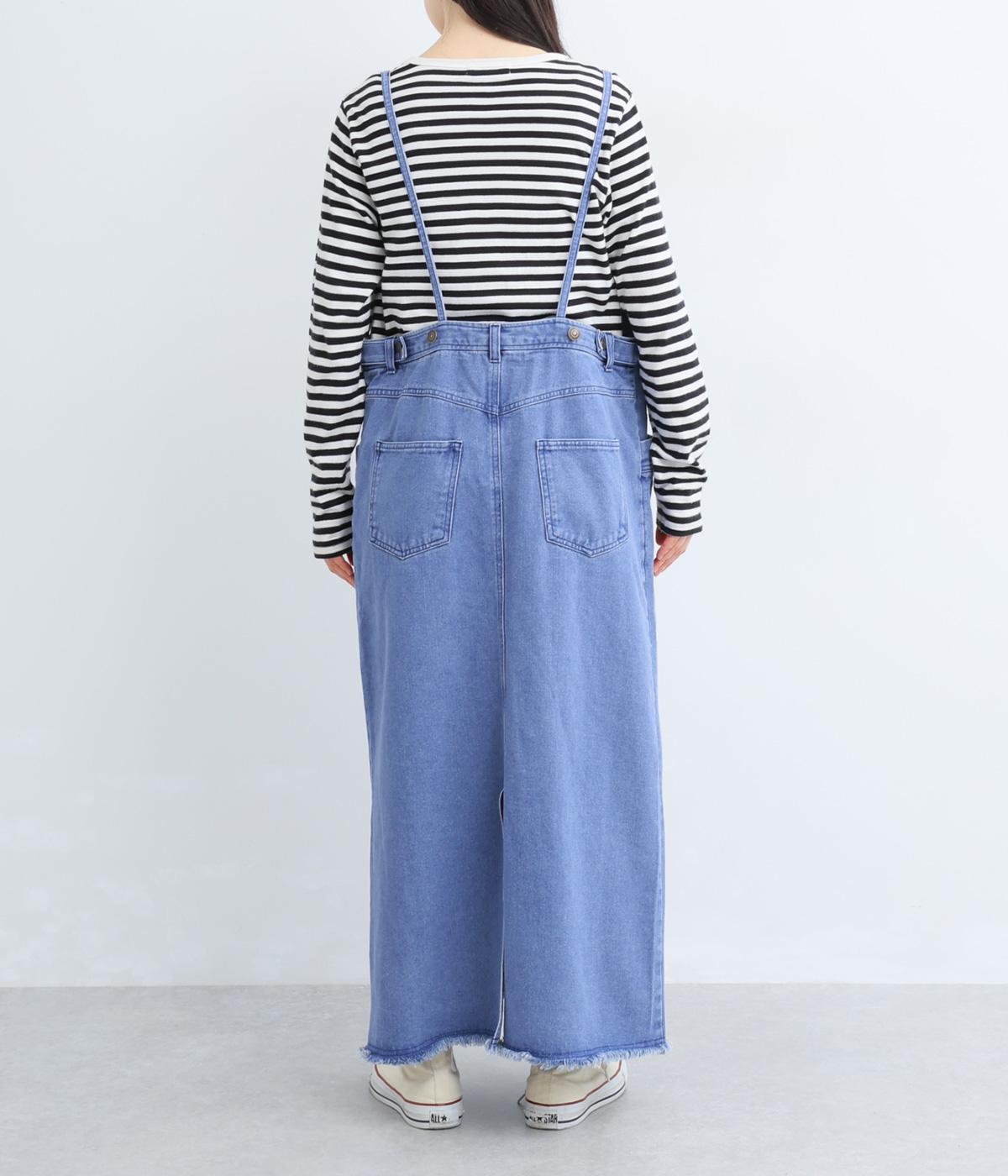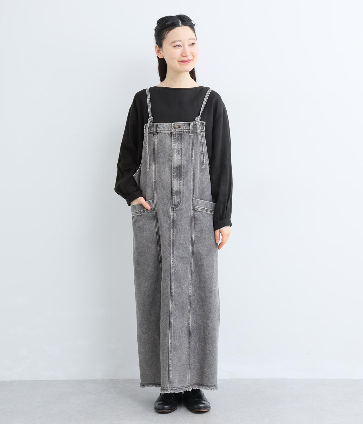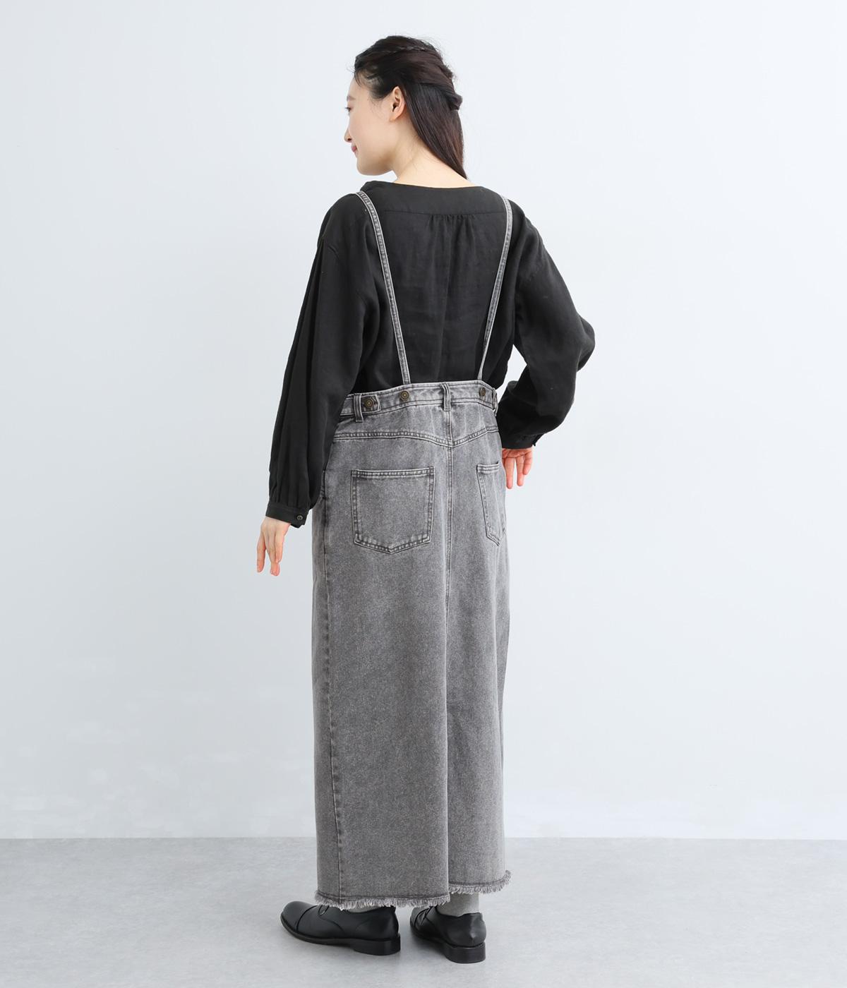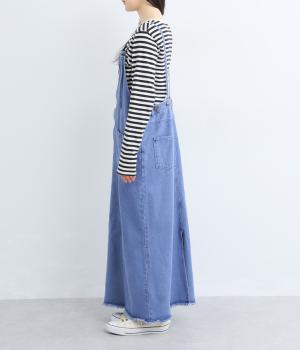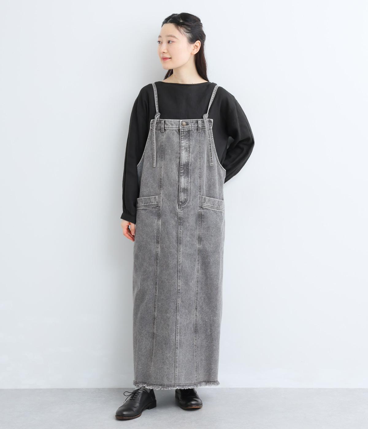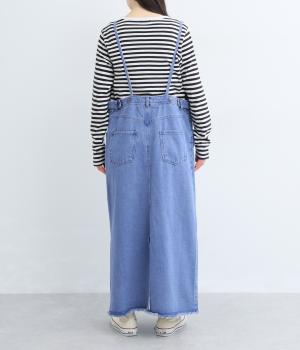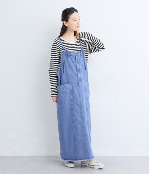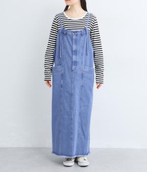 落ち感のある生地がストンと縦のラインを描くジャンパースカートです。ショルダーストラップは結んで長さを調整でき、ウエストはボタンとファスナー仕様で、サイドのボタンでサイズ調節も可能です。裾のフリンジが抜け感を添えています。