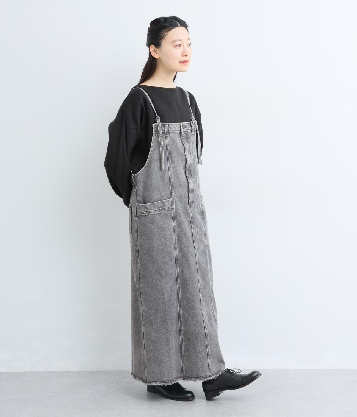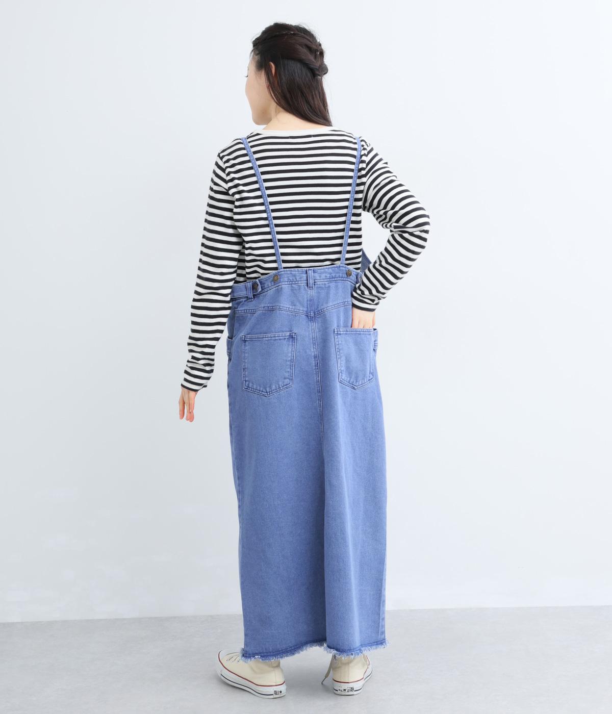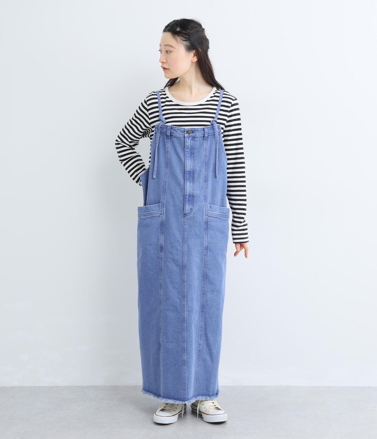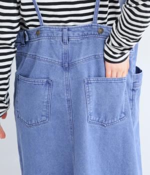 落ち感のある生地がストンと縦のラインを描くジャンパースカートです。ショルダーストラップは結んで長さを調整でき、ウエストはボタンとファスナー仕様で、サイドのボタンでサイズ調節も可能です。裾のフリンジが抜け感を添えています。