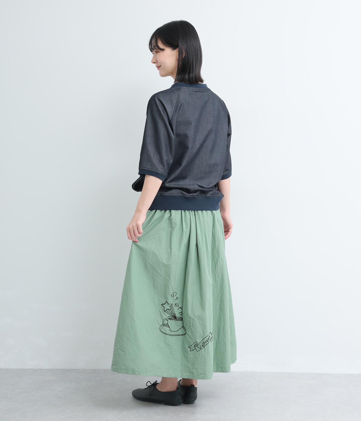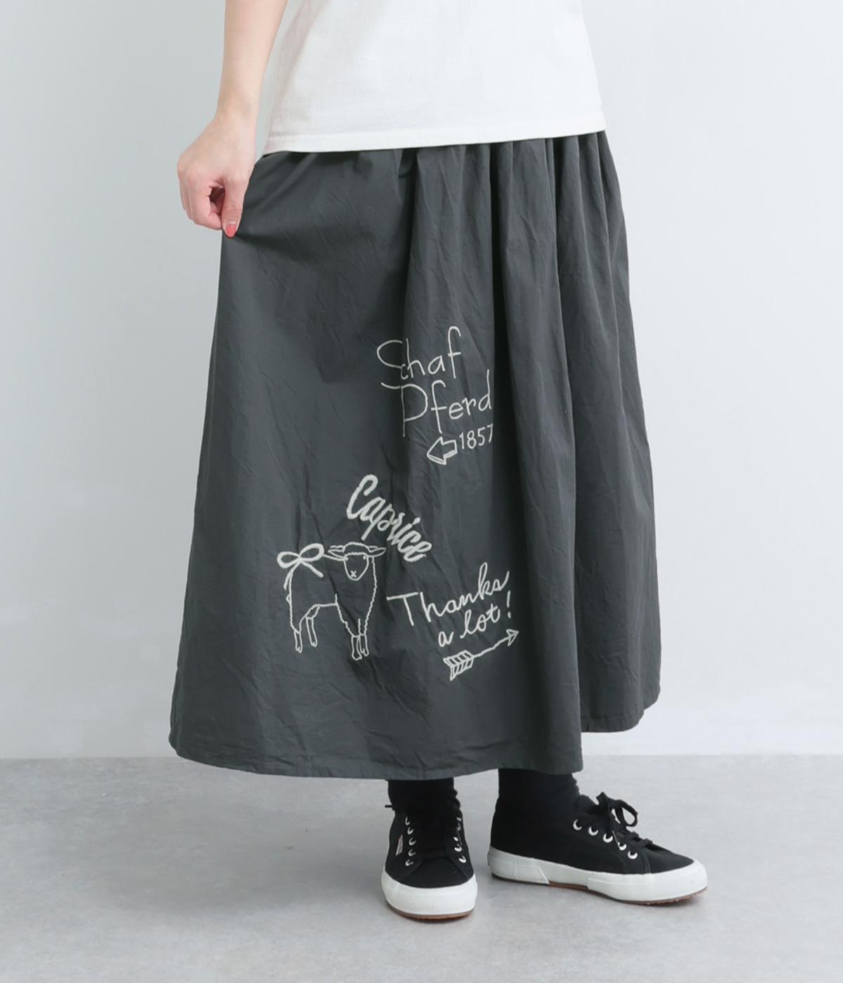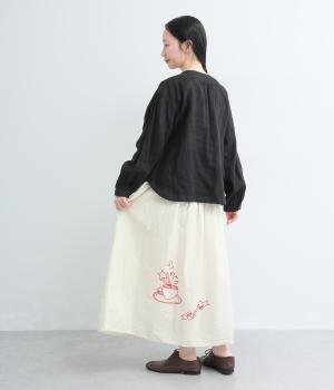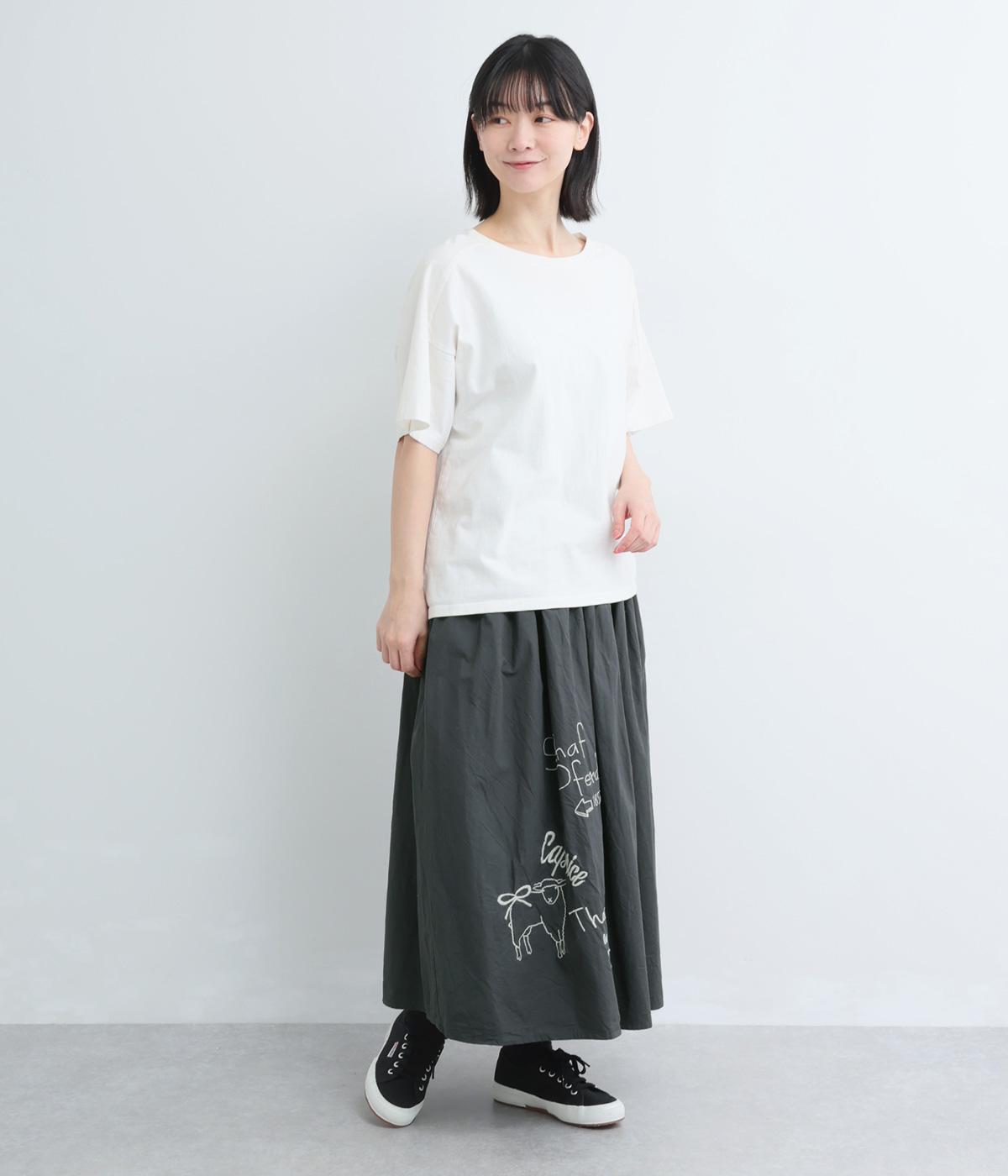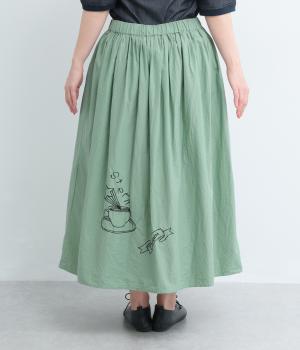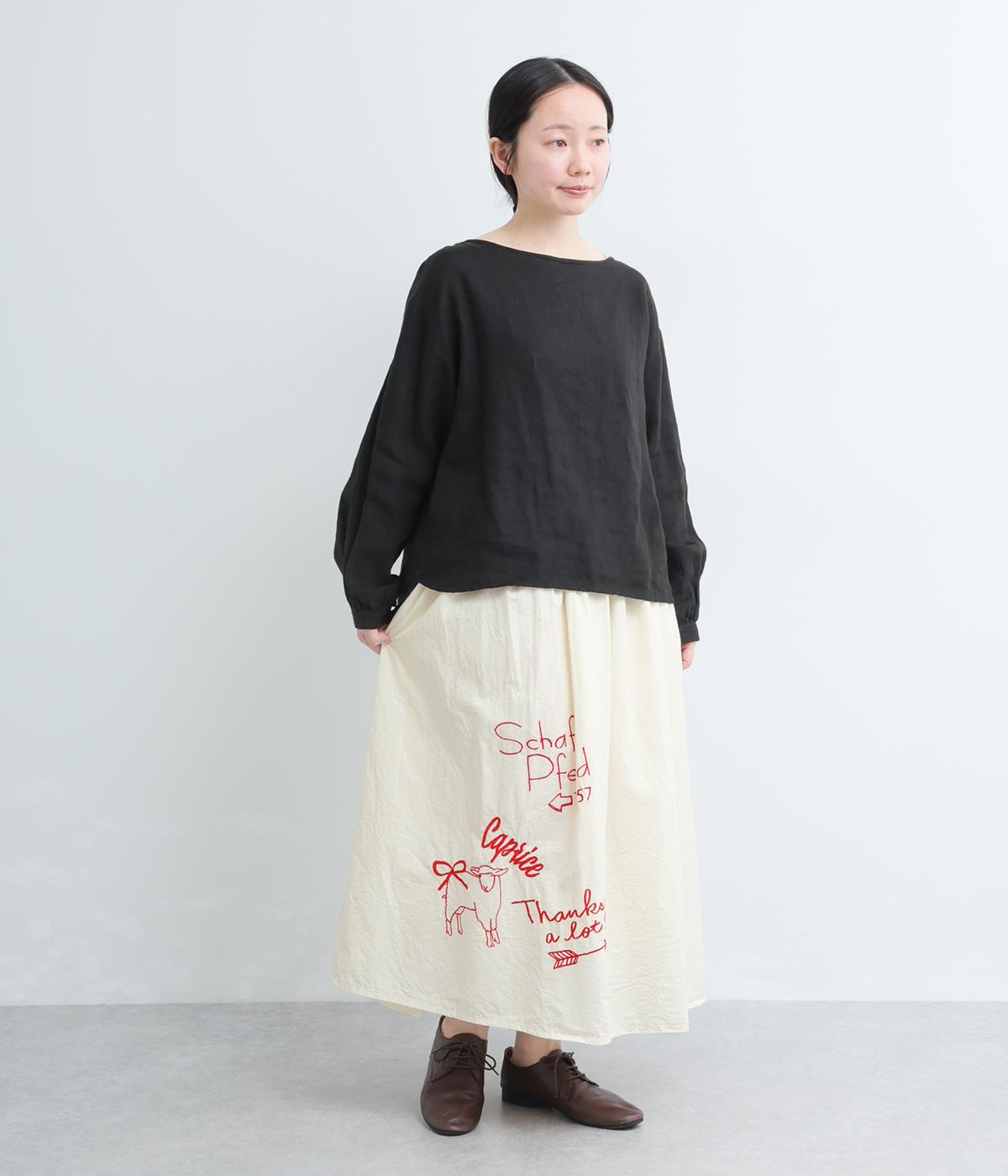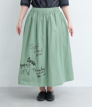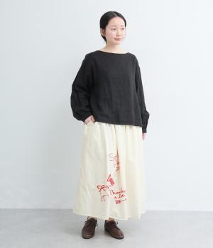 ギャザーをたっぷり寄せたフレアスカートに、遊び心ある刺しゅうをプラス。前後にワンポイントずつほどこしたアシンメトリーなデザインが、シンプルながらもインパクト抜群です。ウエストはフィット感のいい総ゴム&内紐入り。