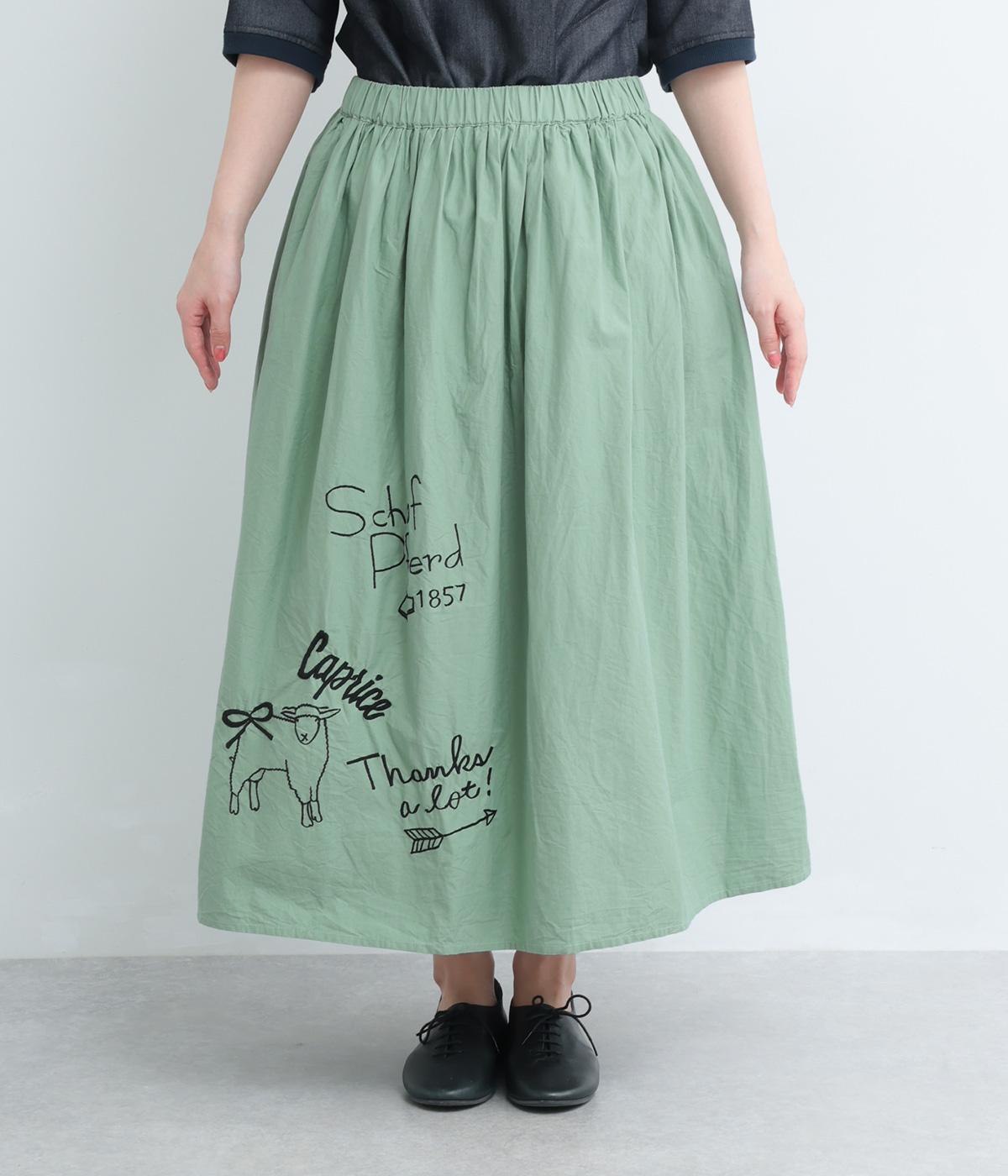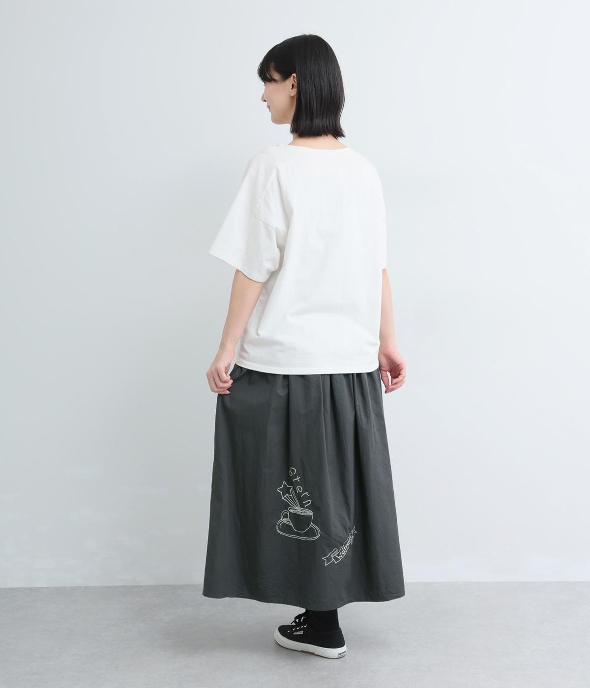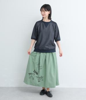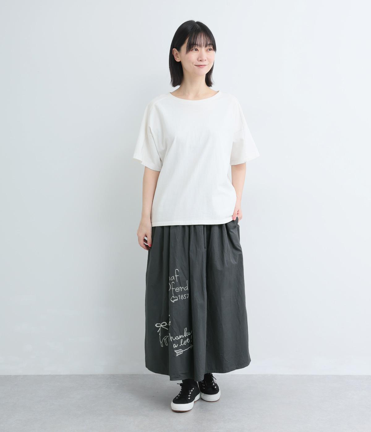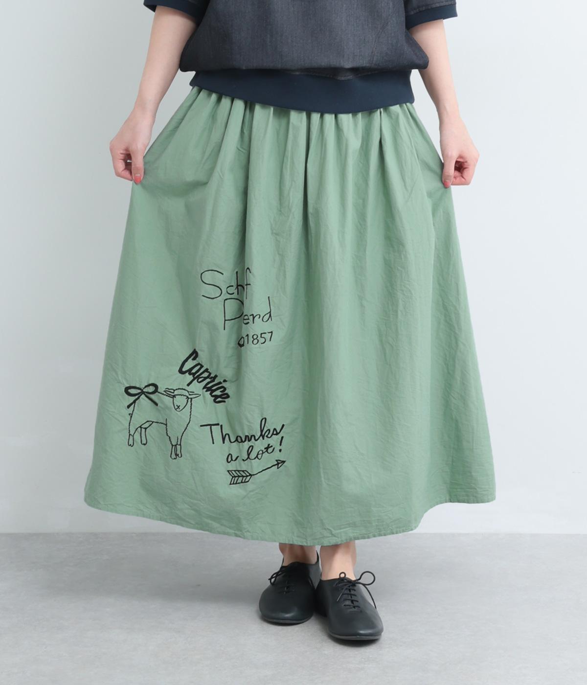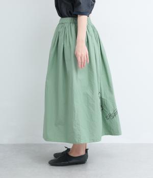 ギャザーをたっぷり寄せたフレアスカートに、遊び心ある刺しゅうをプラス。前後にワンポイントずつほどこしたアシンメトリーなデザインが、シンプルながらもインパクト抜群です。ウエストはフィット感のいい総ゴム&内紐入り。