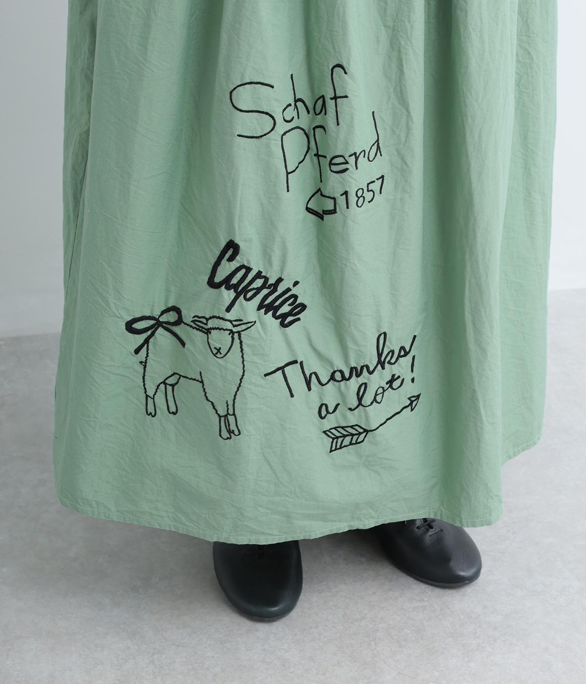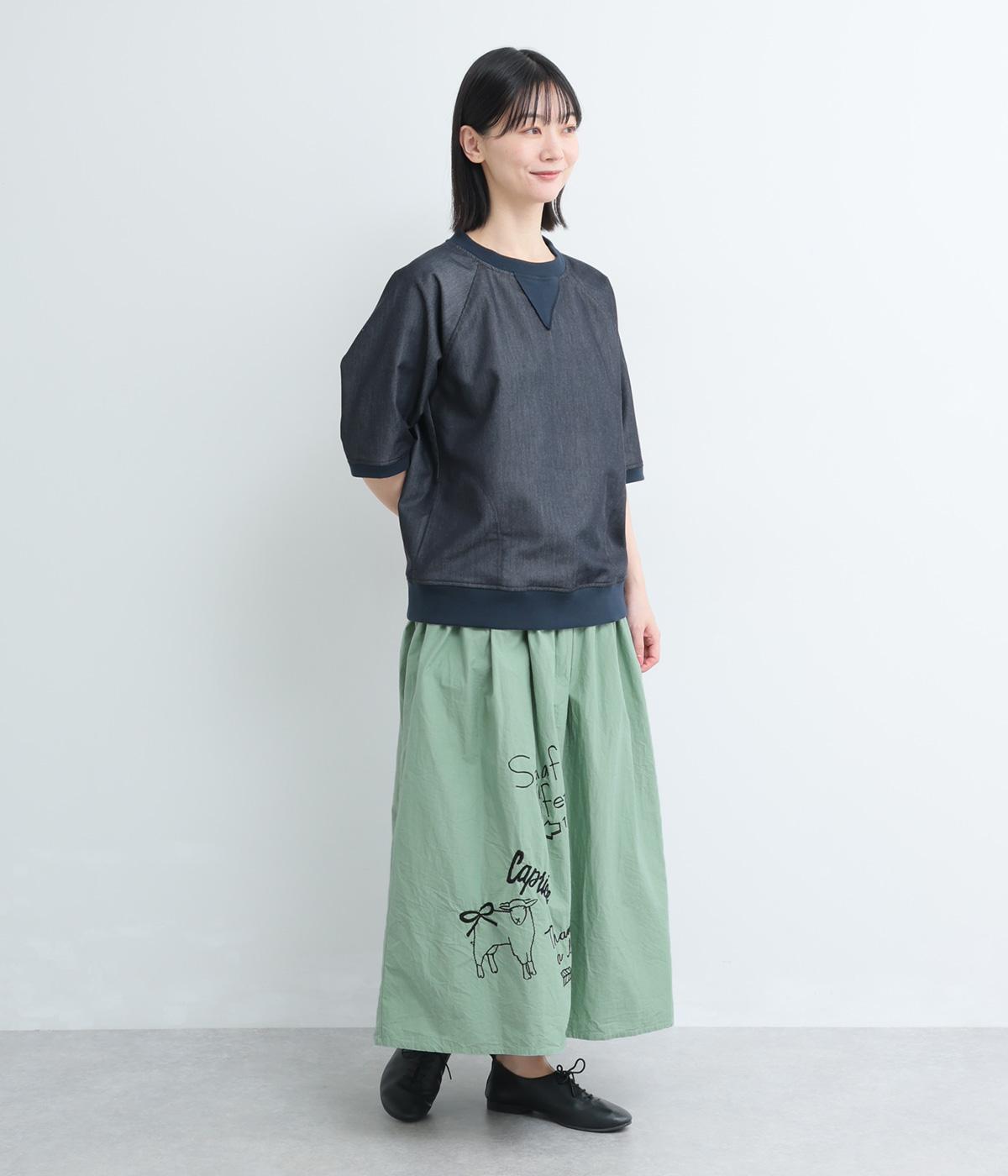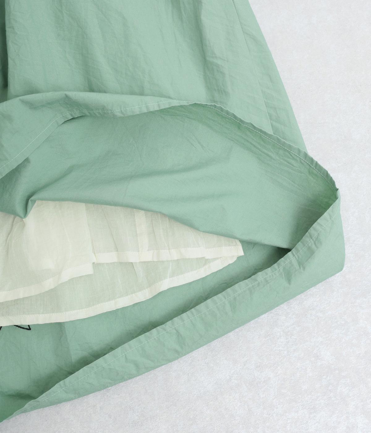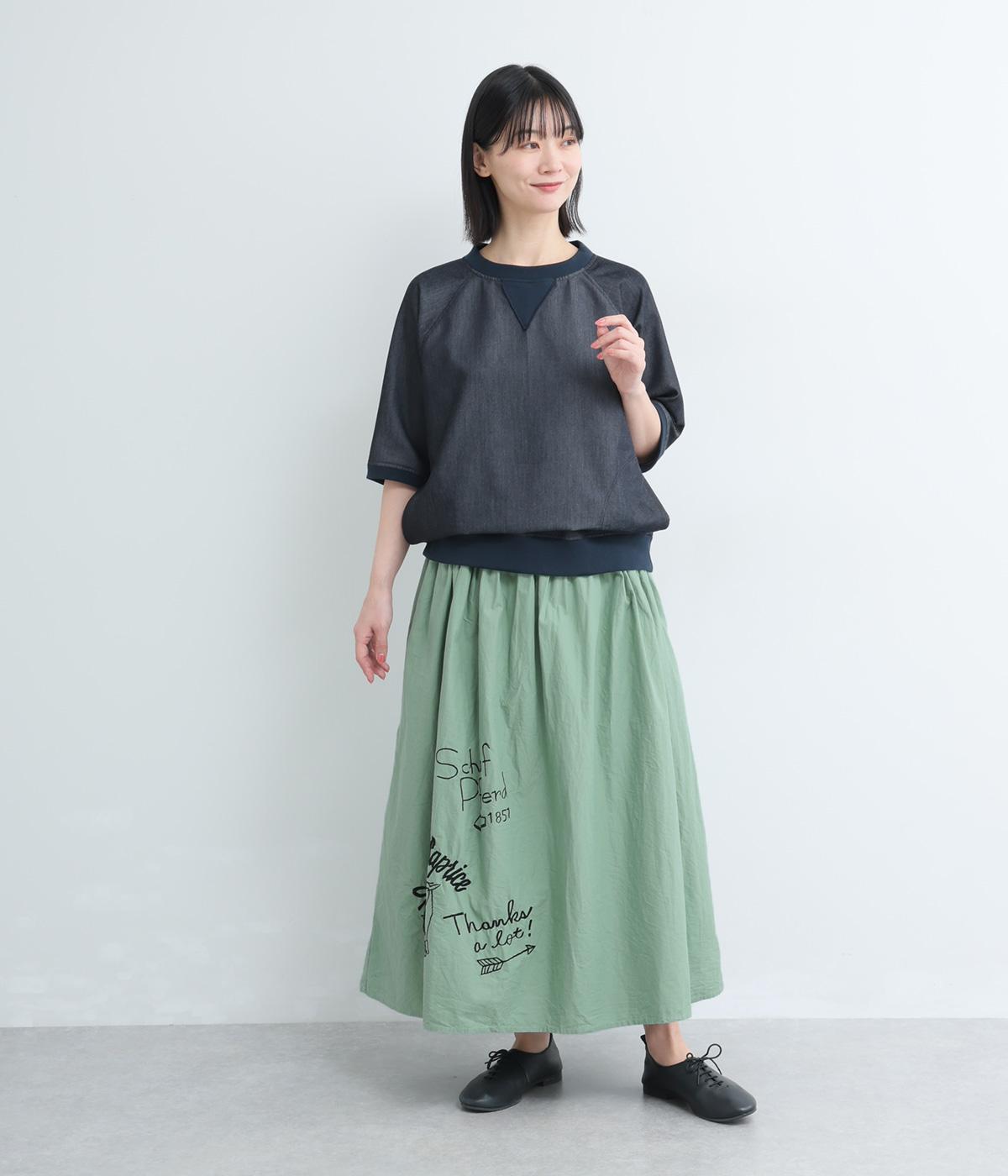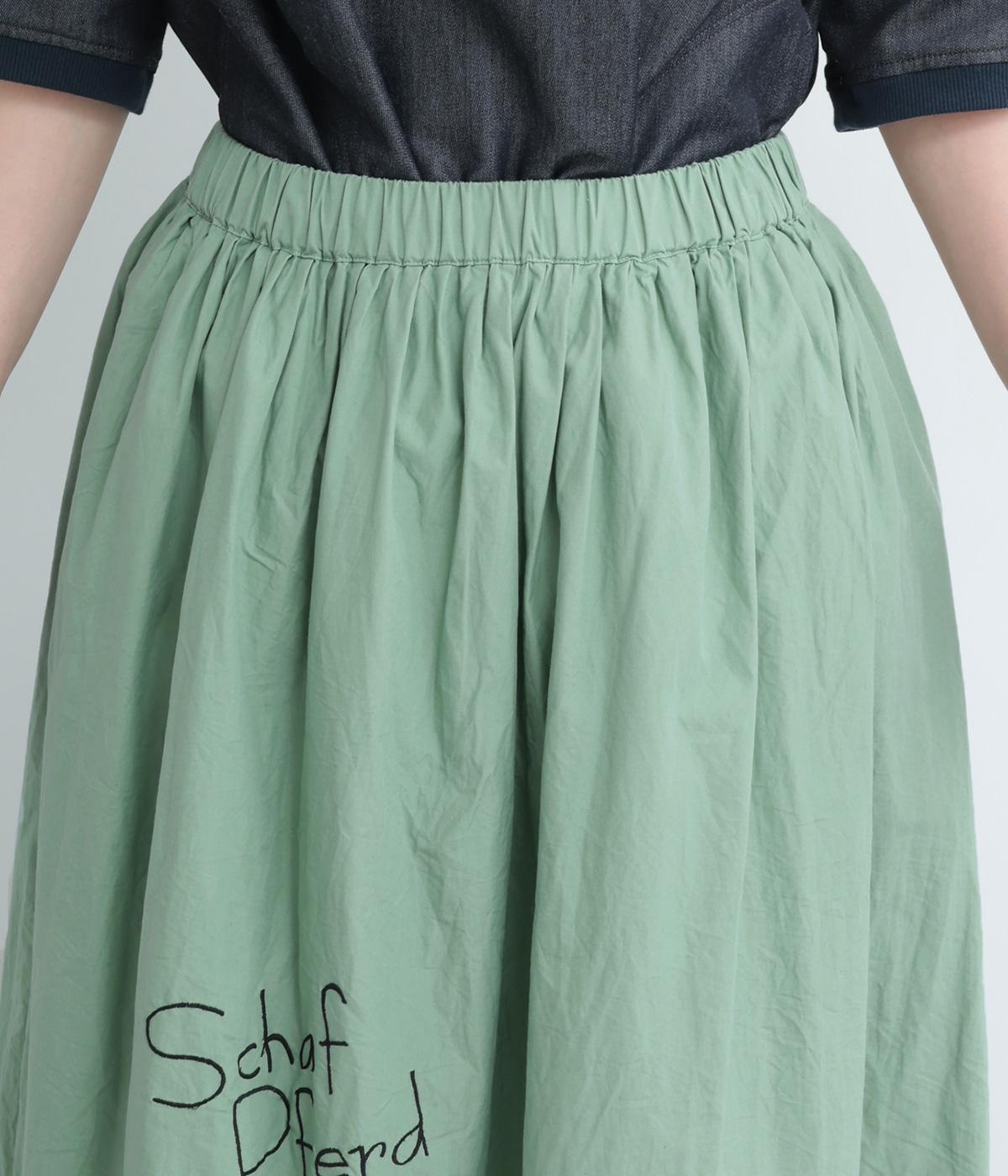 ギャザーをたっぷり寄せたフレアスカートに、遊び心ある刺しゅうをプラス。前後にワンポイントずつほどこしたアシンメトリーなデザインが、シンプルながらもインパクト抜群です。ウエストはフィット感のいい総ゴム&内紐入り。