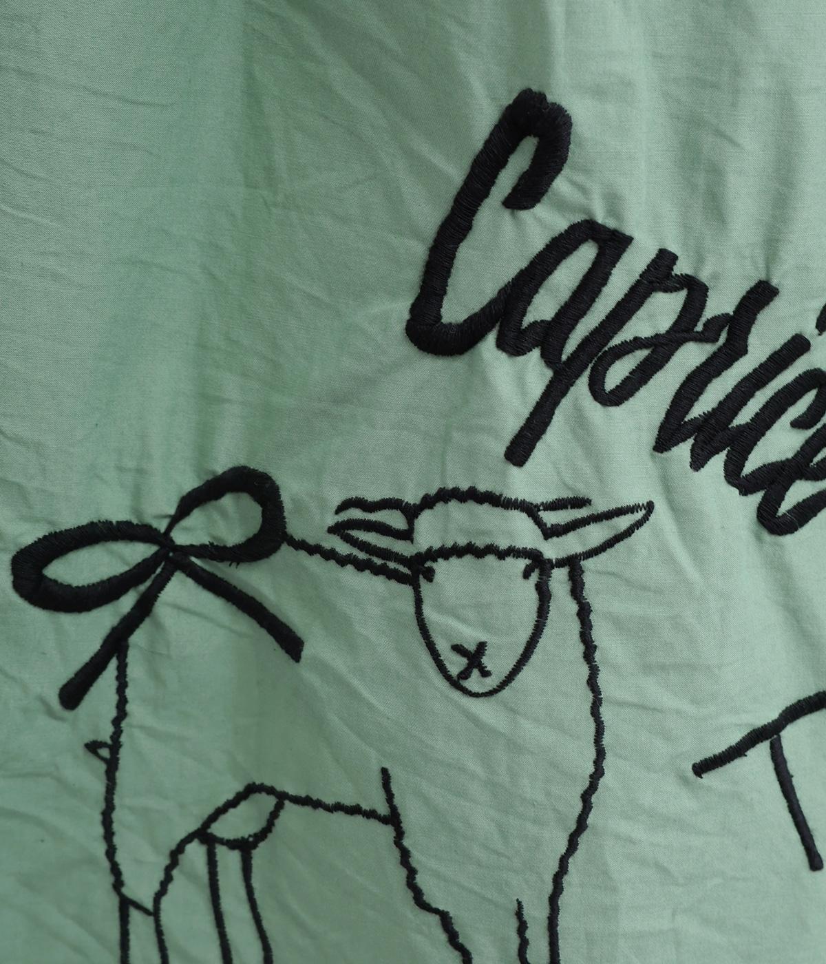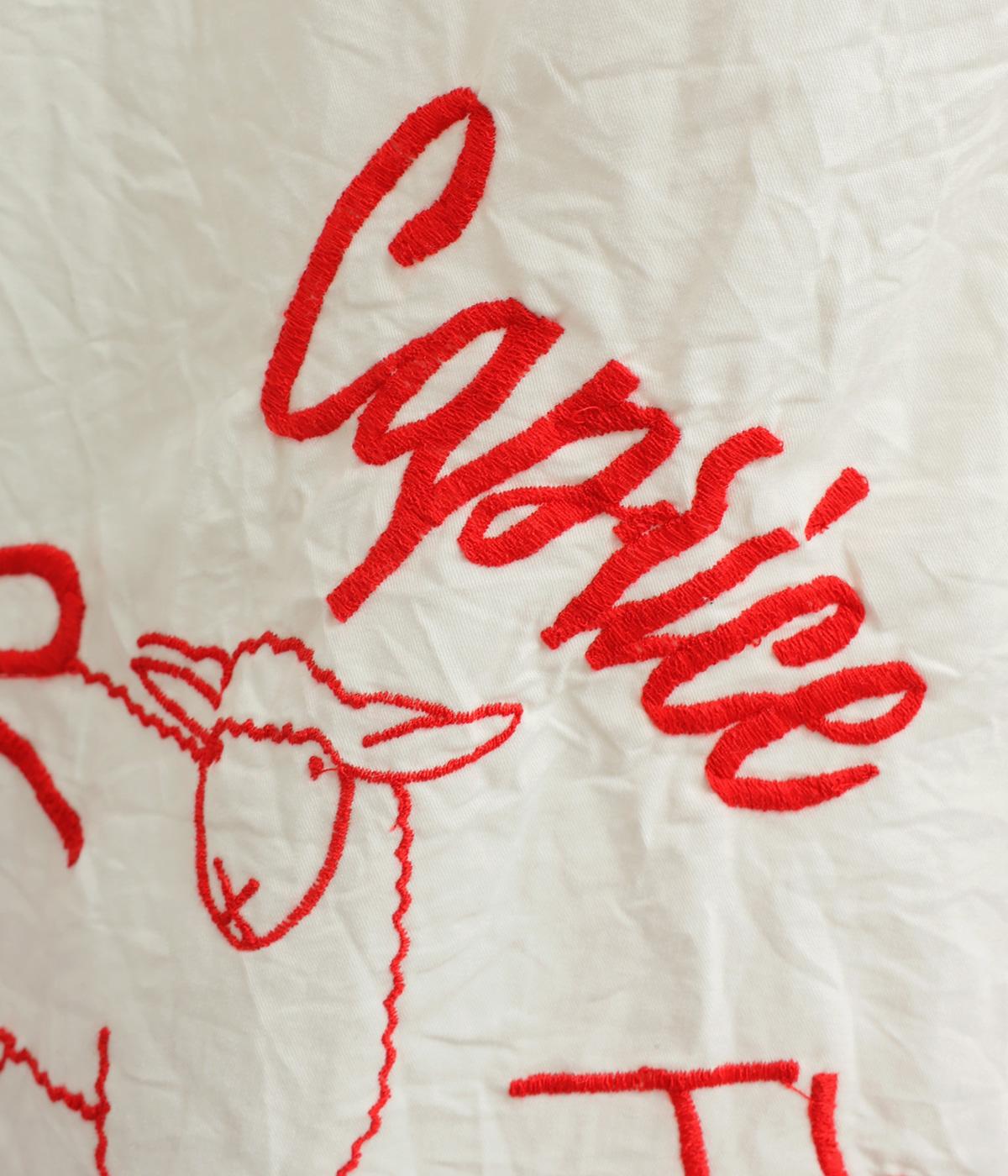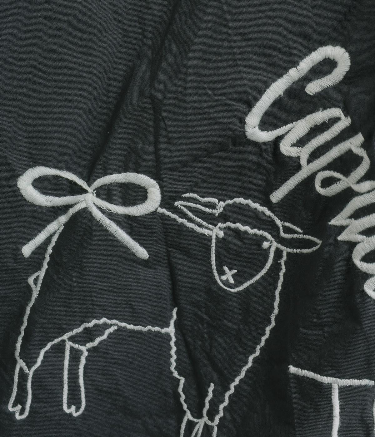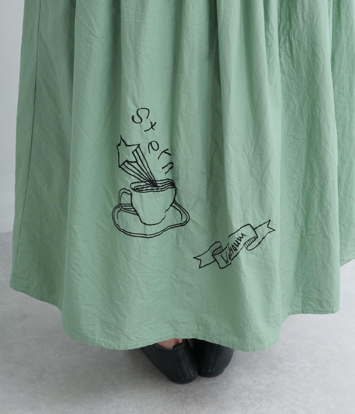 ギャザーをたっぷり寄せたフレアスカートに、遊び心ある刺しゅうをプラス。前後にワンポイントずつほどこしたアシンメトリーなデザインが、シンプルながらもインパクト抜群です。ウエストはフィット感のいい総ゴム&内紐入り。