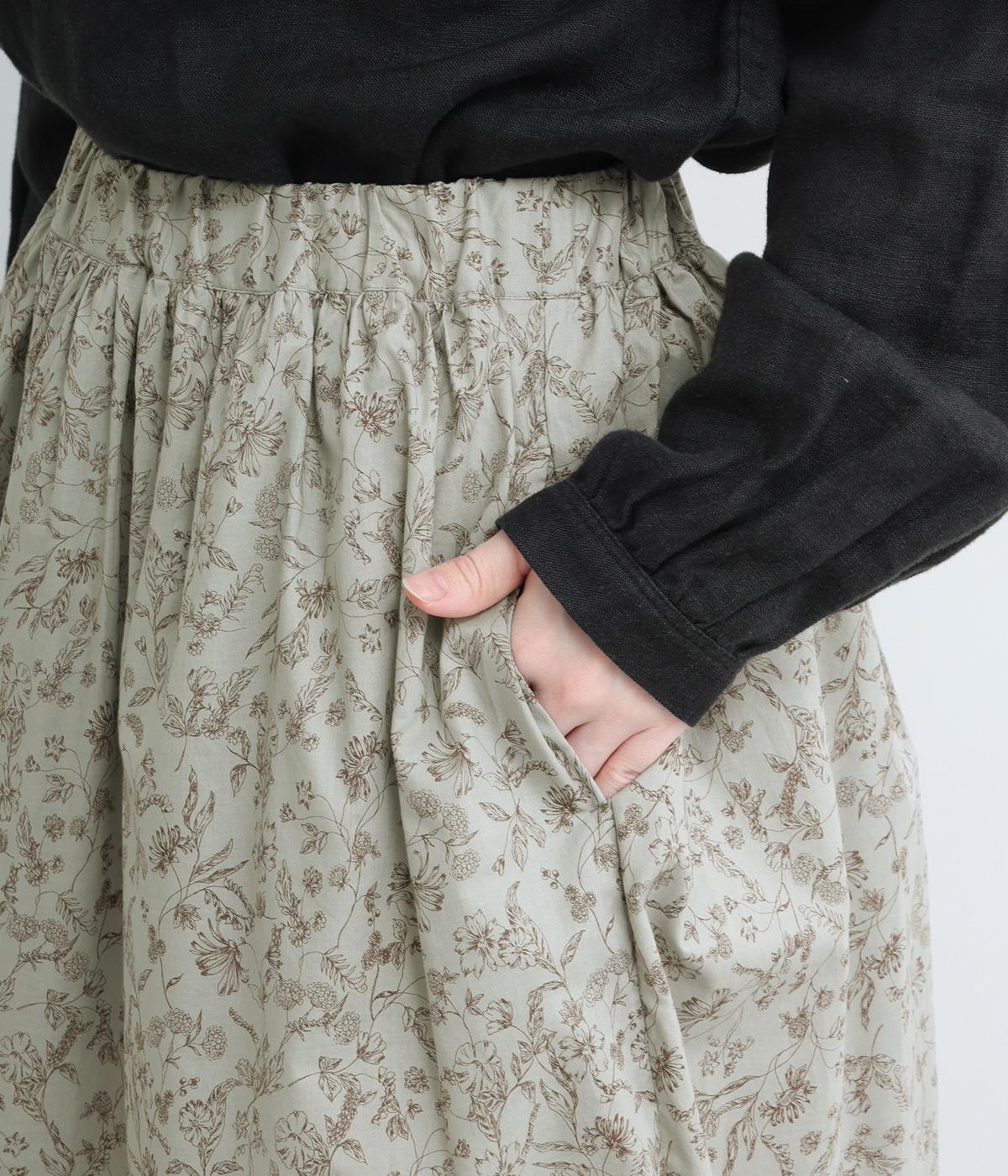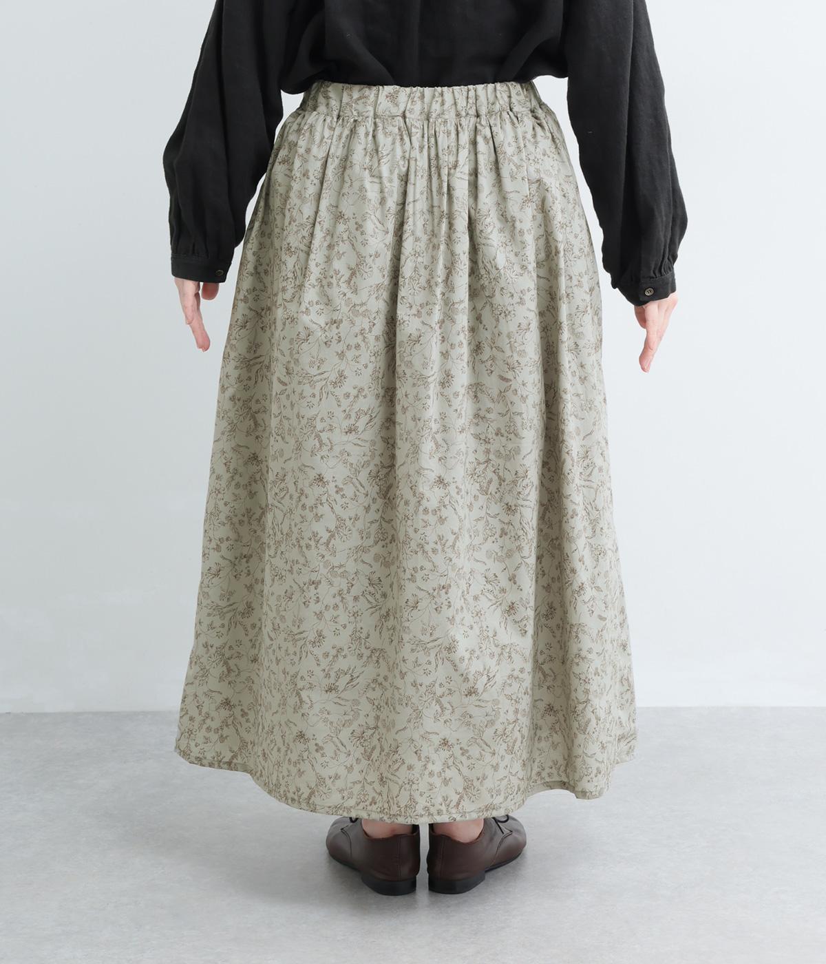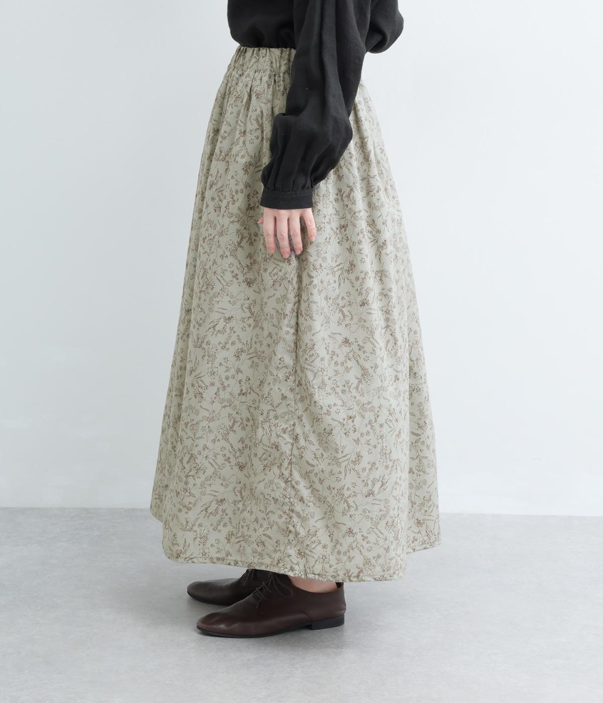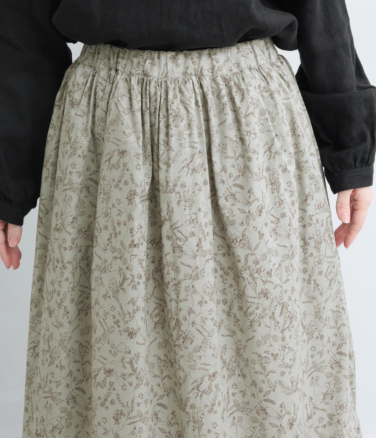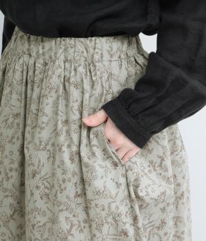 繊細なタッチで描かれた草花が可憐で儚げな雰囲気を演出するギャザースカート。ふわりとふくらんだシルエットがかわいらしく、ロング丈でしっくりと落ち着いた印象にまとめています。ウエストはオールゴムに調整紐入りです。