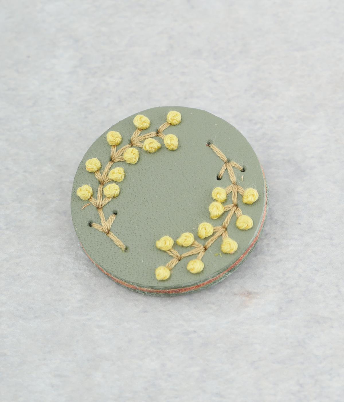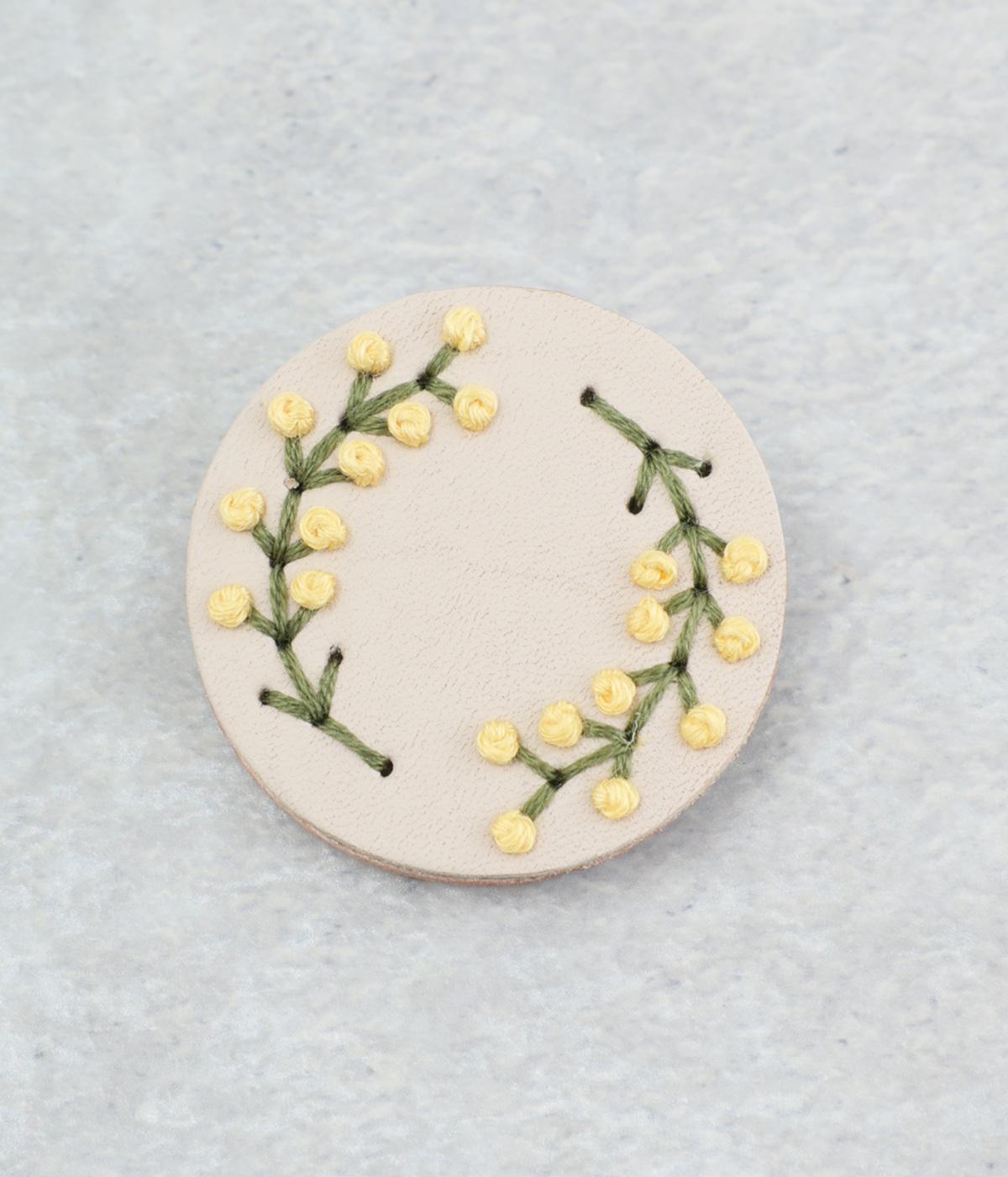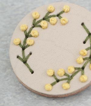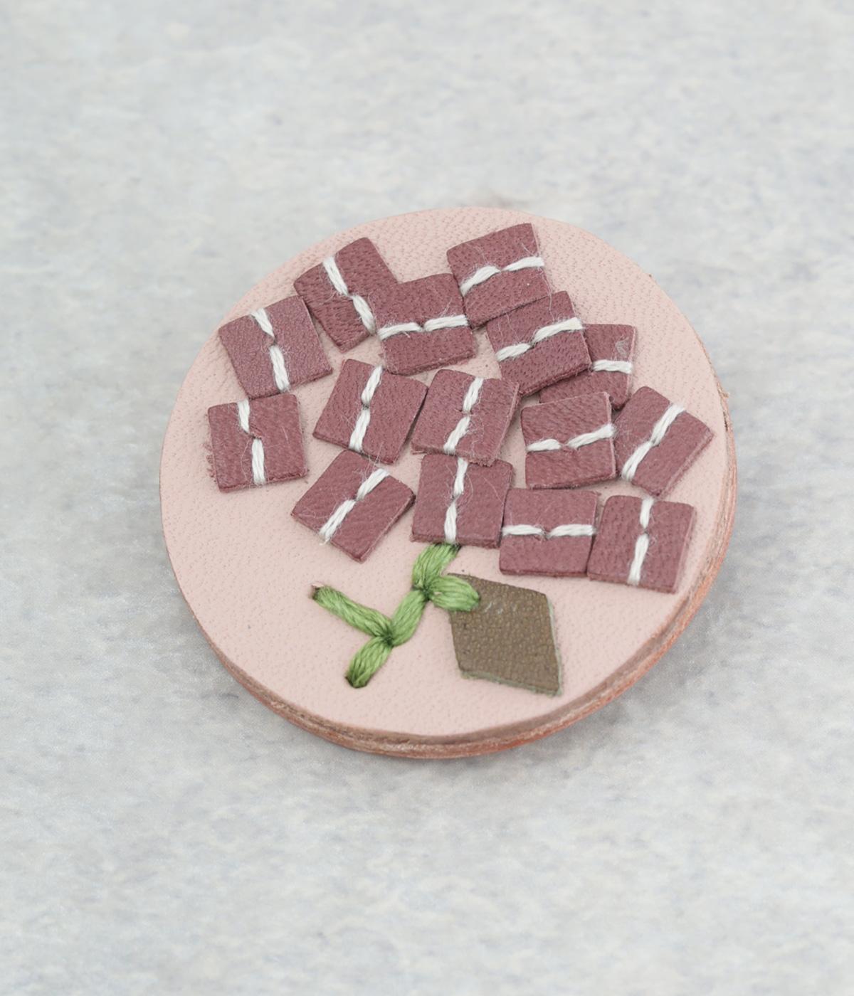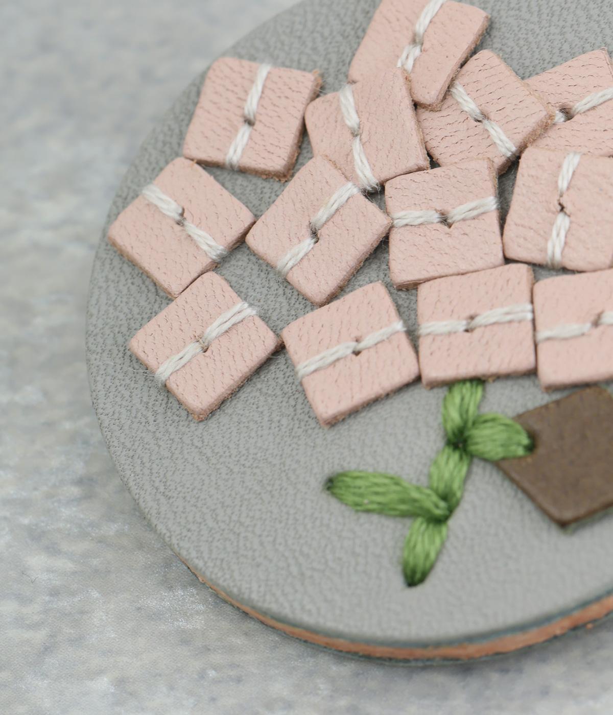 丸いフレームに草花モチーフがほっこりとあたたかみのあるブローチ。小ぶりなサイズながら、厚みと立体的な刺しゅうが目を惹き、切り込みを入れた革に1本ずつ糸を通す手刺しゅうのこだわりが存在感へとつながります。