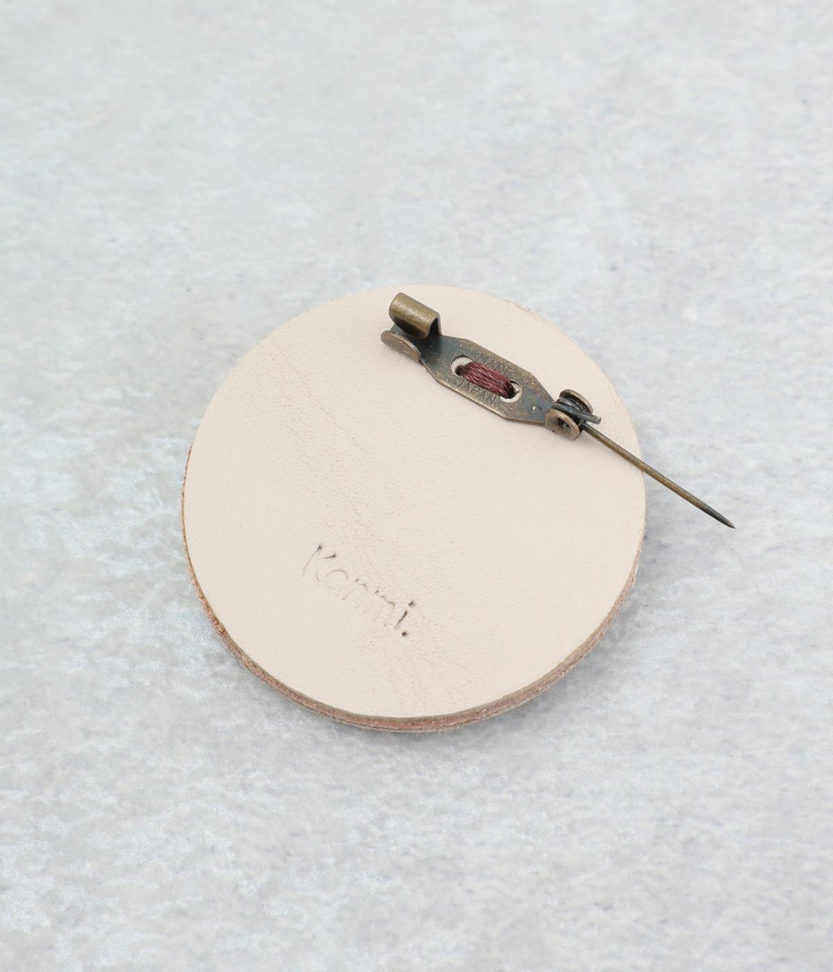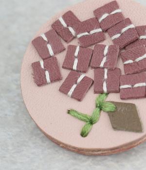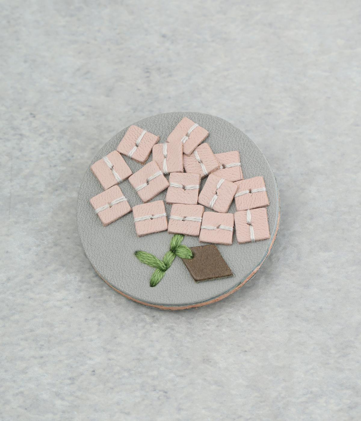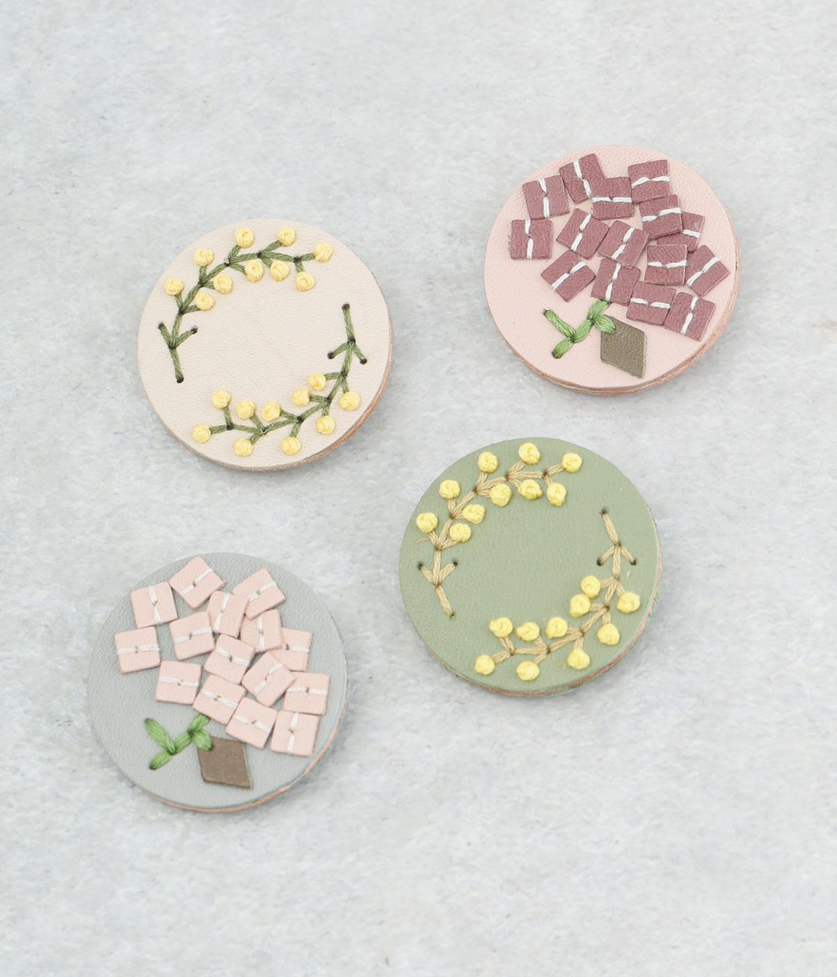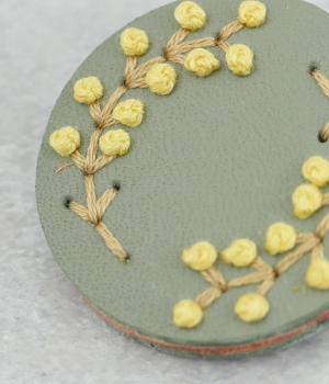 丸いフレームに草花モチーフがほっこりとあたたかみのあるブローチ。小ぶりなサイズながら、厚みと立体的な刺しゅうが目を惹き、切り込みを入れた革に1本ずつ糸を通す手刺しゅうのこだわりが存在感へとつながります。