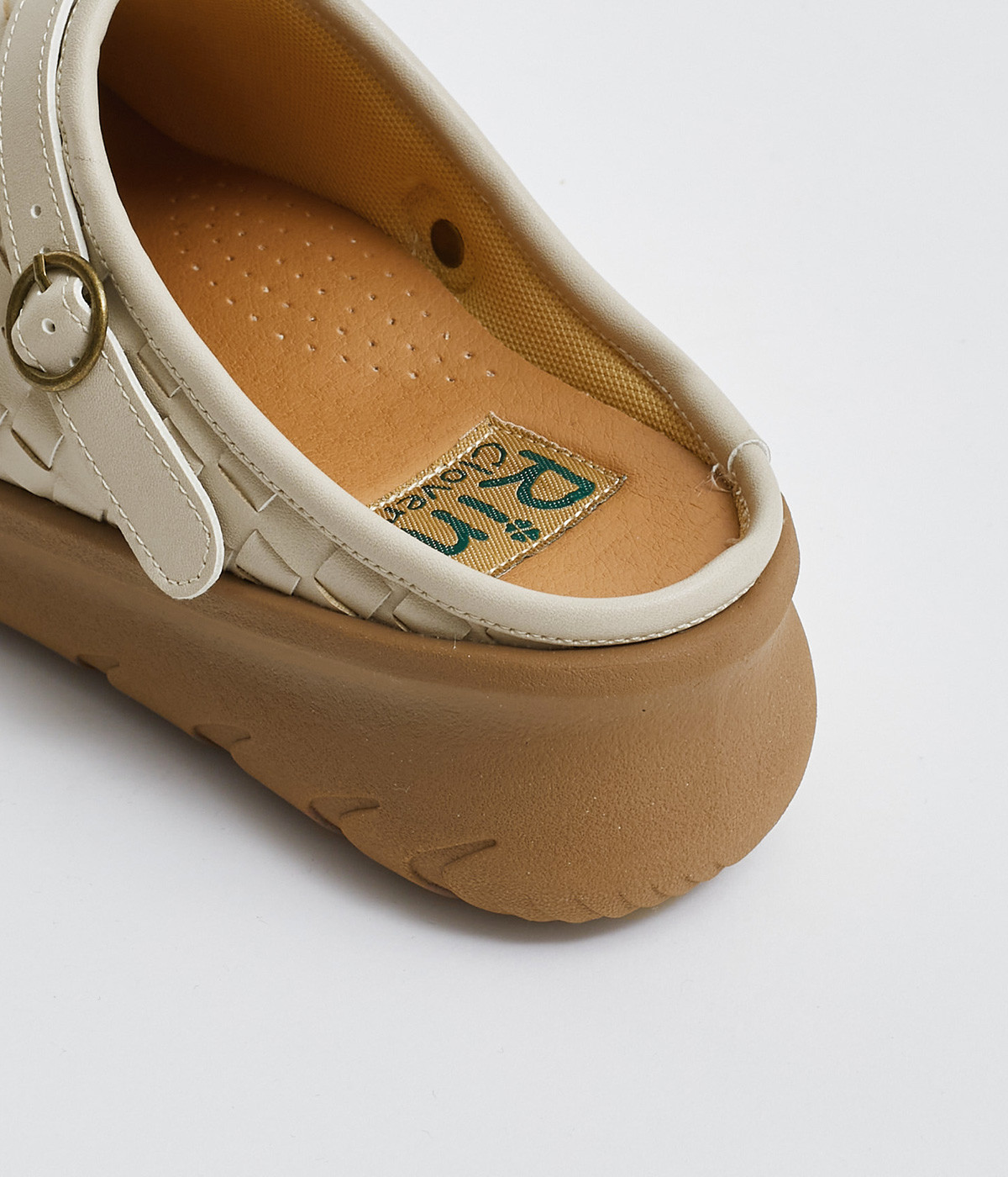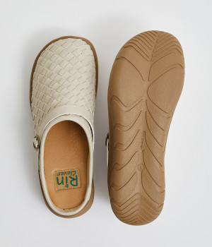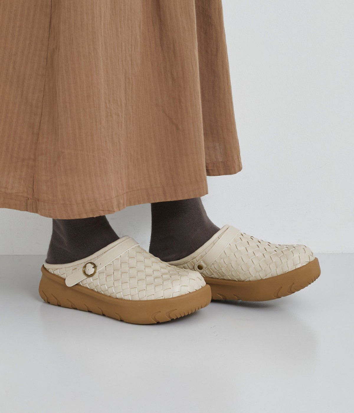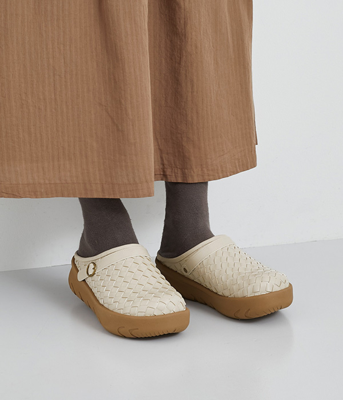 コロンとした丸みのあるフォルムが愛らしいサボ。丁寧に編みこまれたメッシュが奥行きのある表情を与えています。脚をすっきりと見せてくれる、厚みを持たせたソールが◎。さっと足を入れて気軽にはけるのもグッドポイントです。