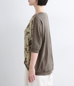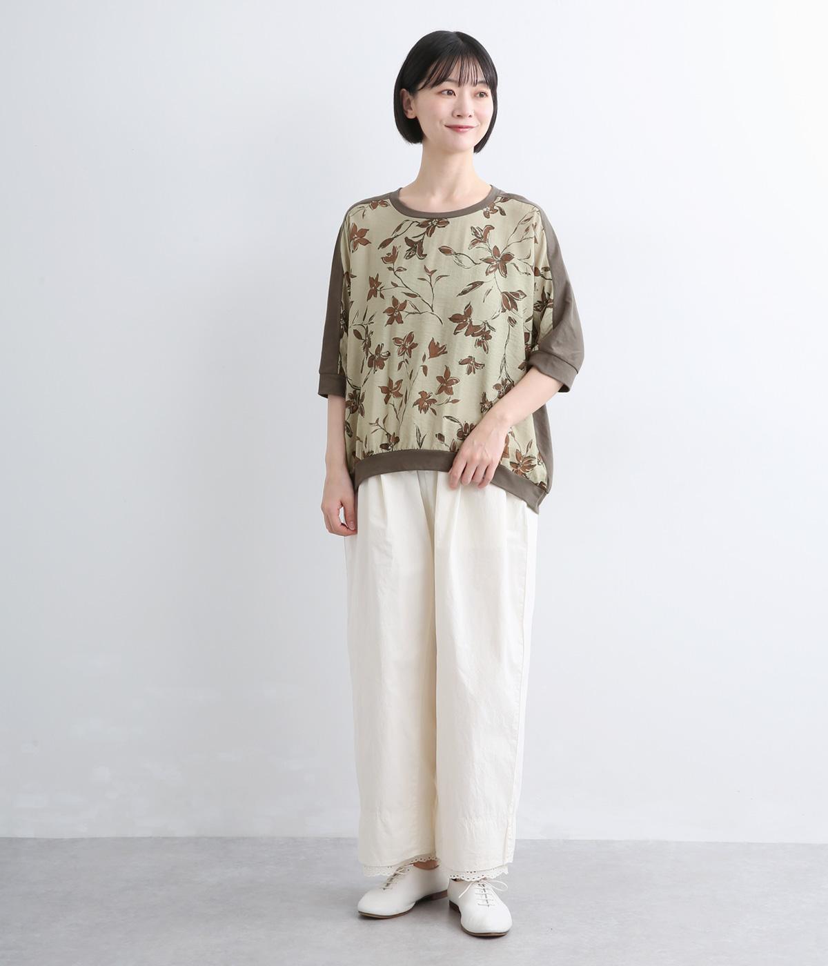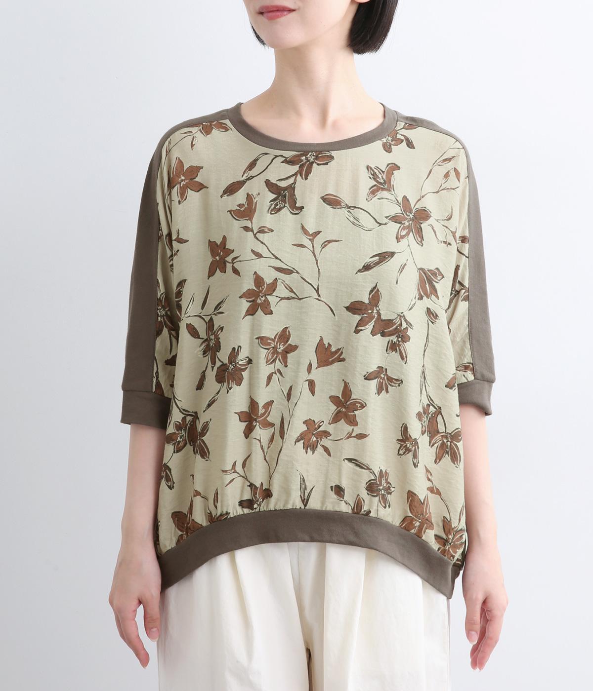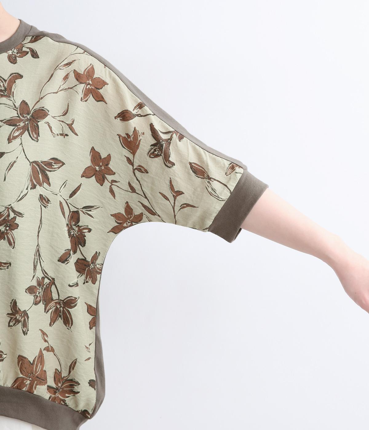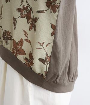 落ち着いたトーンのフラワープリントを前身頃にあしらい、背面を無地で切り替えたデザインです。ほどよい華やかさがありながら、大人のコーディネートにもなじむ上品な印象に。ゆったりとしたドルマンシルエットと前後差をつけた裾が、体のラインを自然にカバーしてくれるのも◎