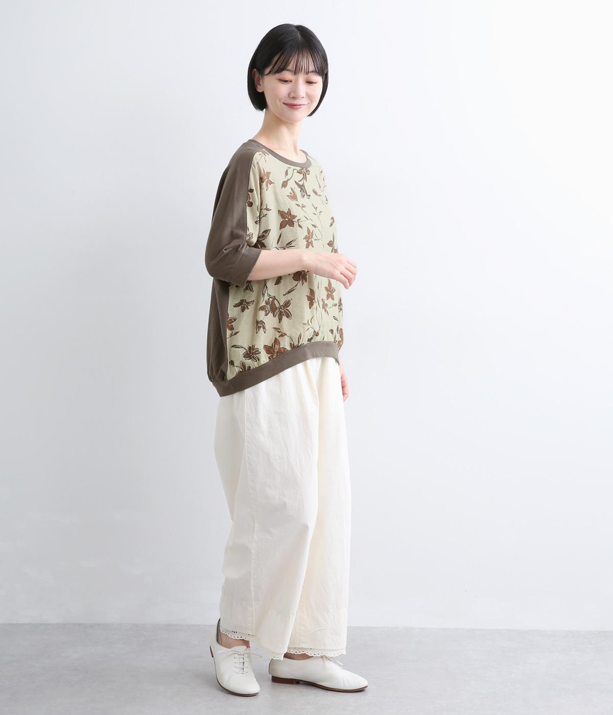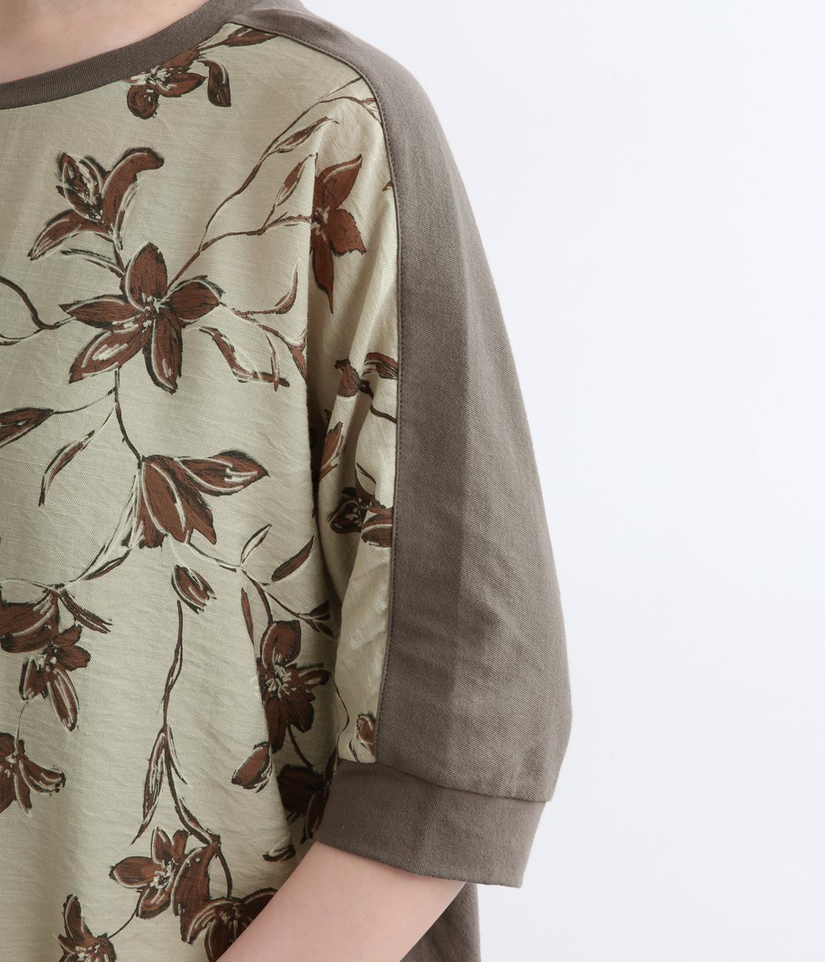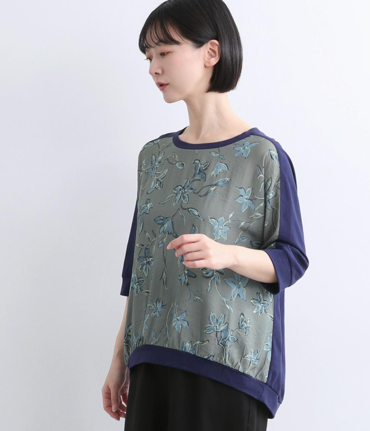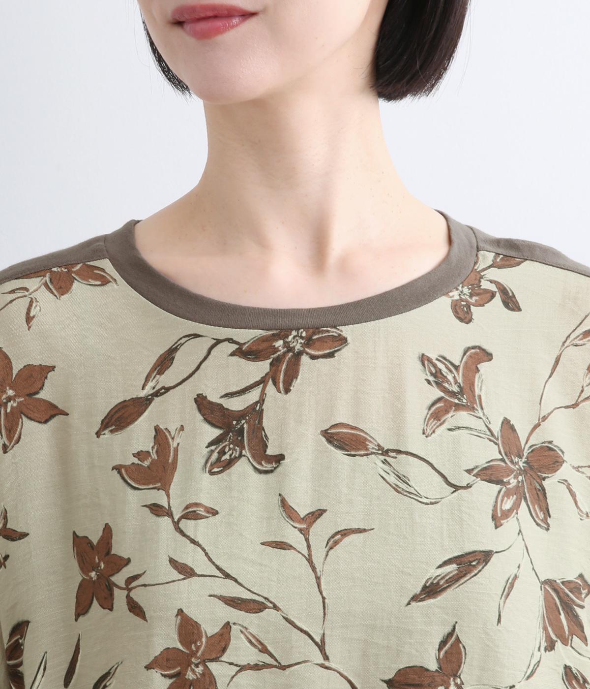 落ち着いたトーンのフラワープリントを前身頃にあしらい、背面を無地で切り替えたデザインです。ほどよい華やかさがありながら、大人のコーディネートにもなじむ上品な印象に。ゆったりとしたドルマンシルエットと前後差をつけた裾が、体のラインを自然にカバーしてくれるのも◎