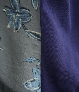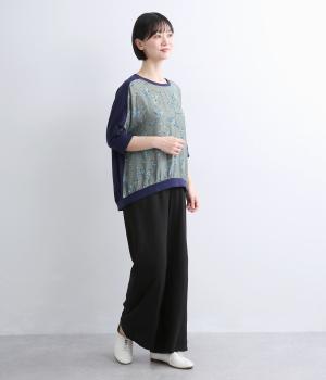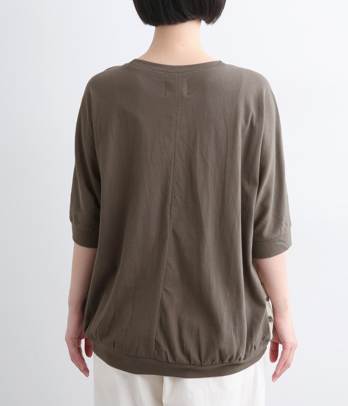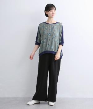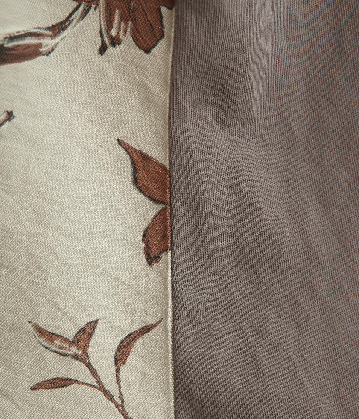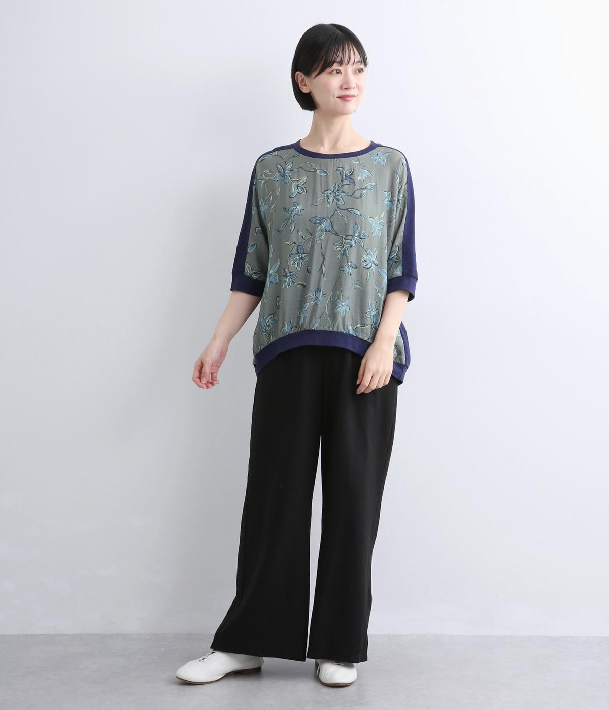 落ち着いたトーンのフラワープリントを前身頃にあしらい、背面を無地で切り替えたデザインです。ほどよい華やかさがありながら、大人のコーディネートにもなじむ上品な印象に。ゆったりとしたドルマンシルエットと前後差をつけた裾が、体のラインを自然にカバーしてくれるのも◎