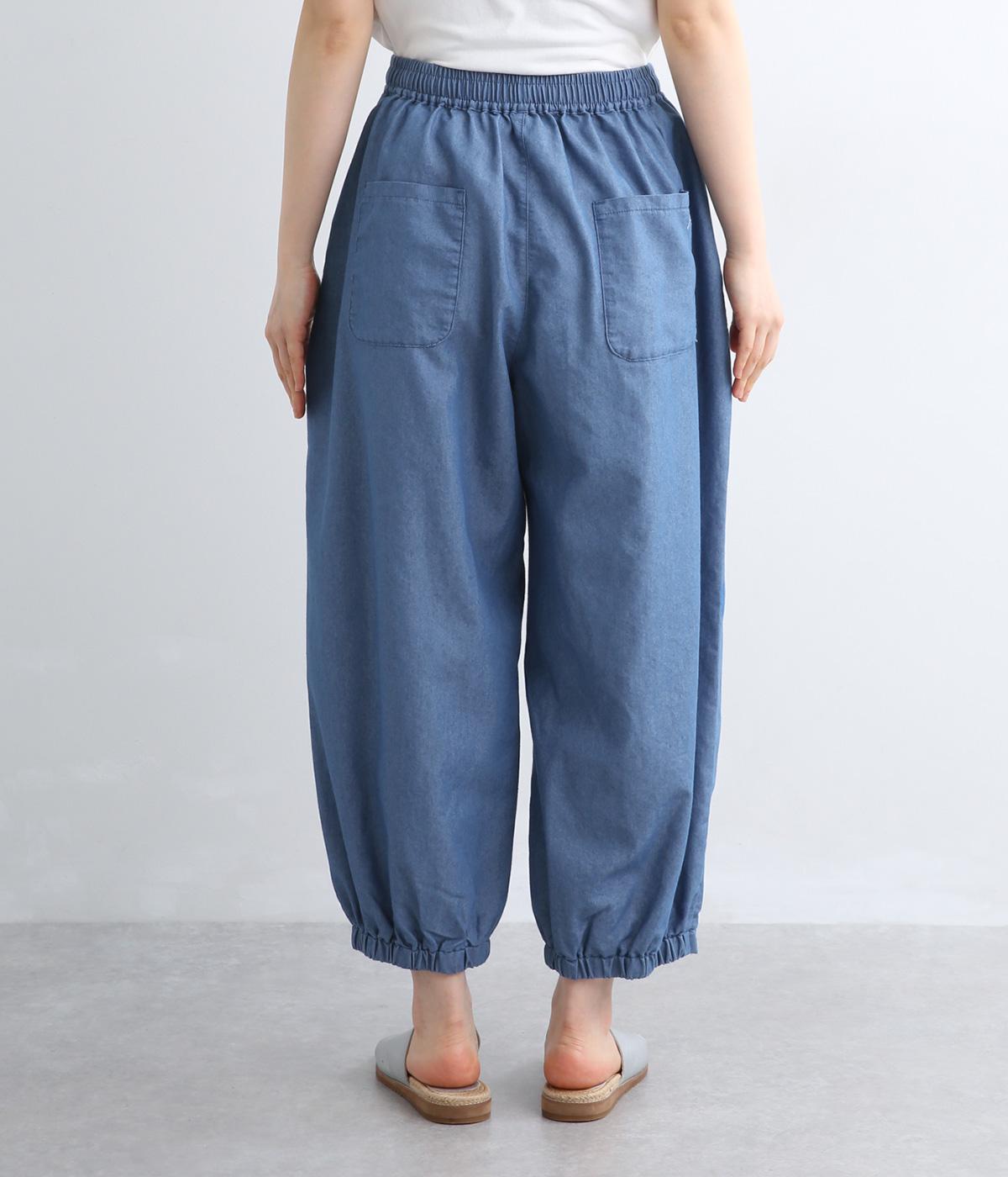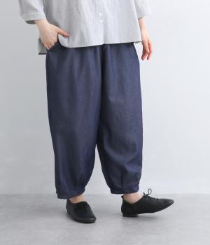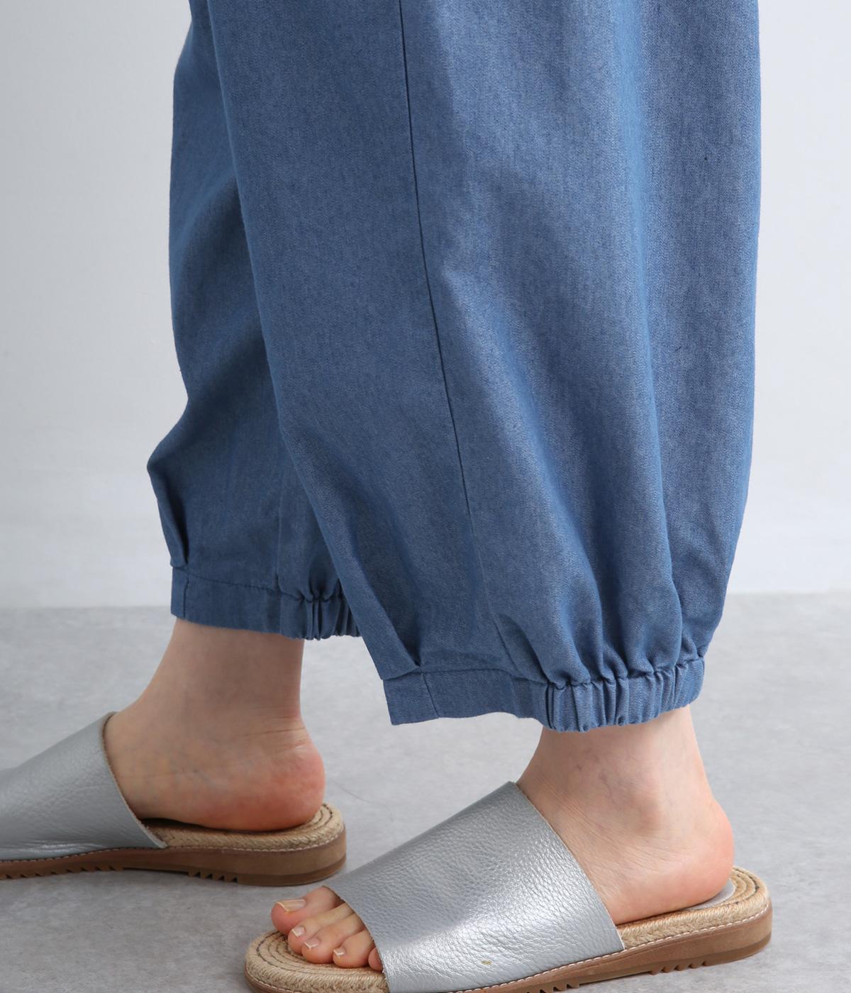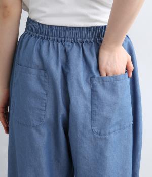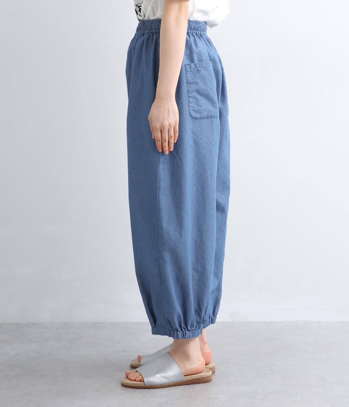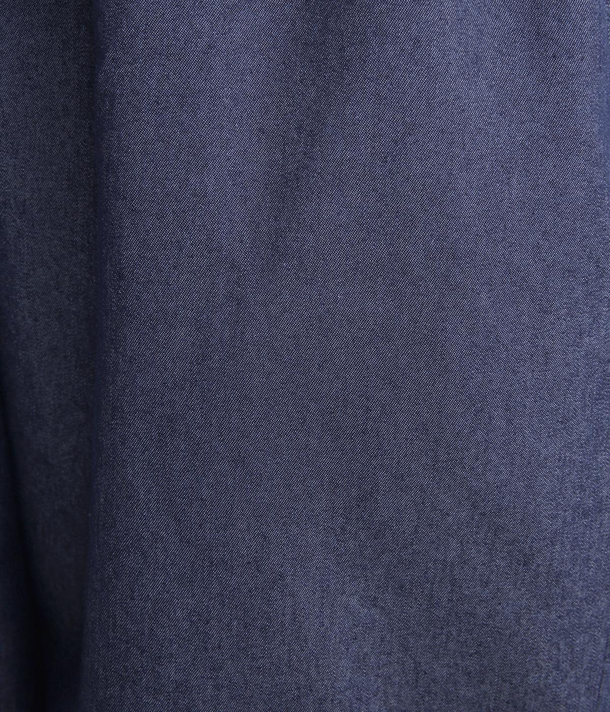 薄手でしなやかなコットン混デニムを使用しています。ふんわりと空気をふくむような軽やかさがあり、汗ばむ季節も快適なはき心地に。さらりとした肌ざわりと、ほんのりとした光沢感が、カジュアルさのなかに落ち着きを添えます。