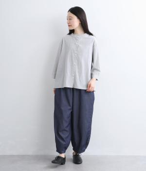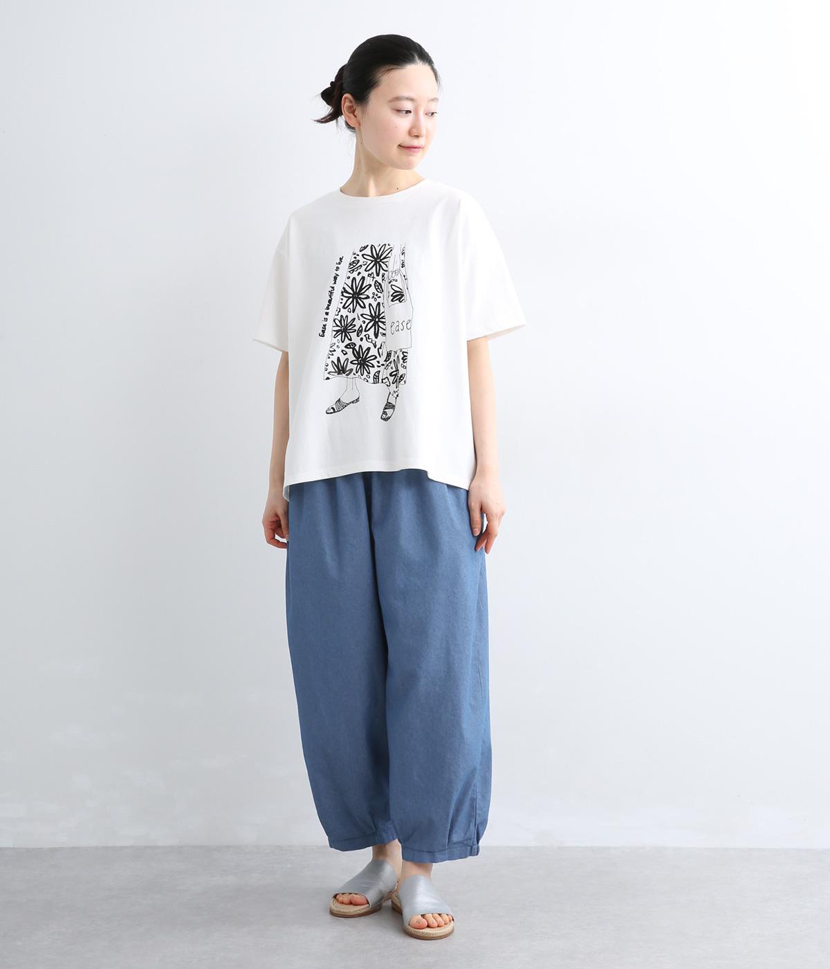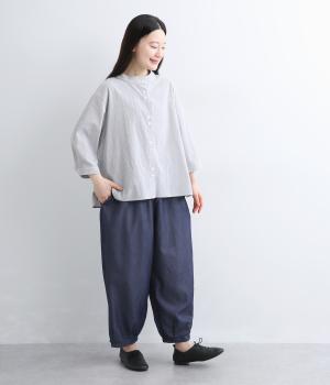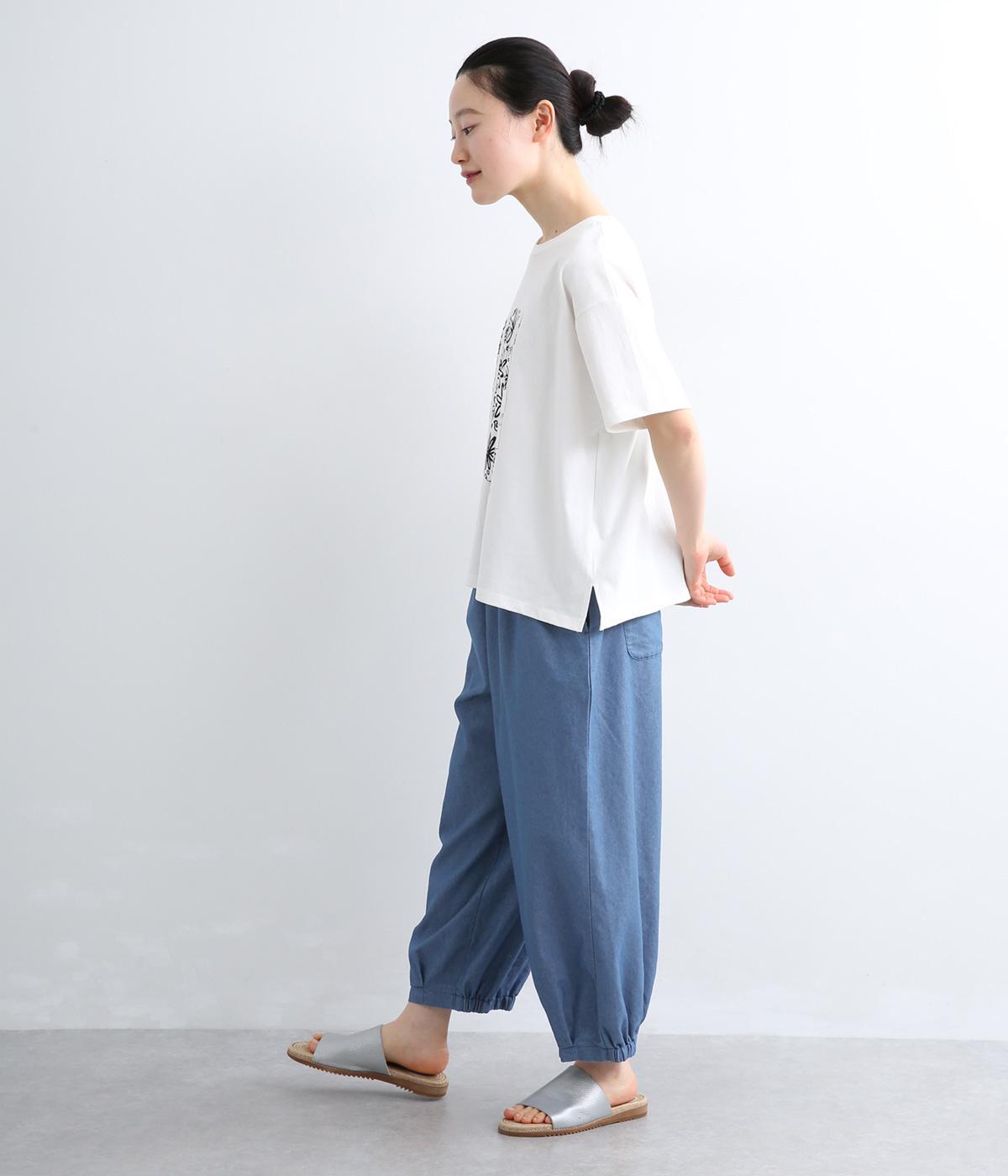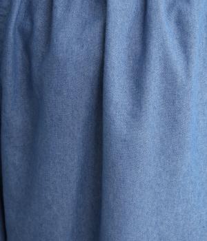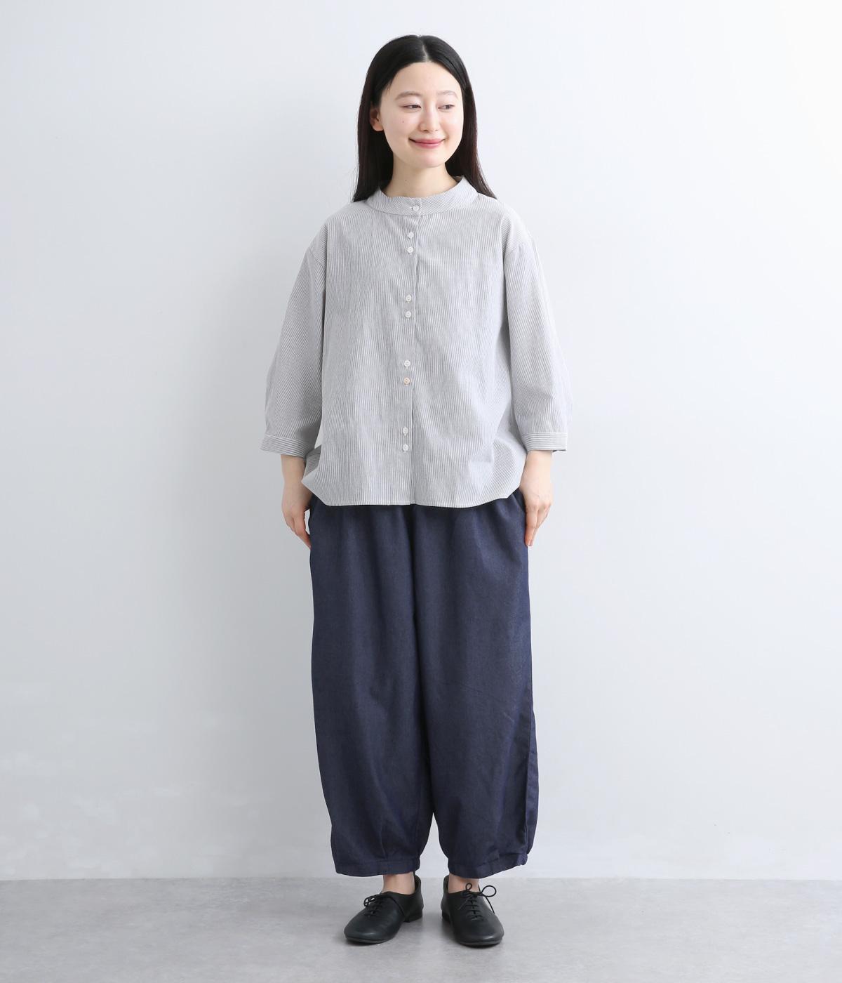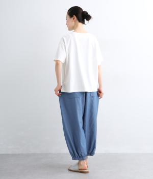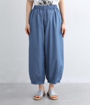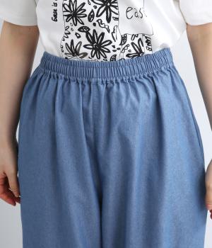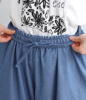 薄手でしなやかなコットン混デニムを使用しています。ふんわりと空気をふくむような軽やかさがあり、汗ばむ季節も快適なはき心地に。さらりとした肌ざわりと、ほんのりとした光沢感が、カジュアルさのなかに落ち着きを添えます。