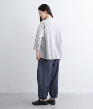 裾に入れたタックが立体感を生み、丸みのあるコクーンシルエットを描くパンツです。ゆとりのあるサイズ感とやわらかなカーブラインがバランスよく、こなれた印象を演出。ウエストはゴム仕様で、快適なはき心地に仕上げました。裾の一部にゴムを入れることで、着脱しやすいのも魅力です。