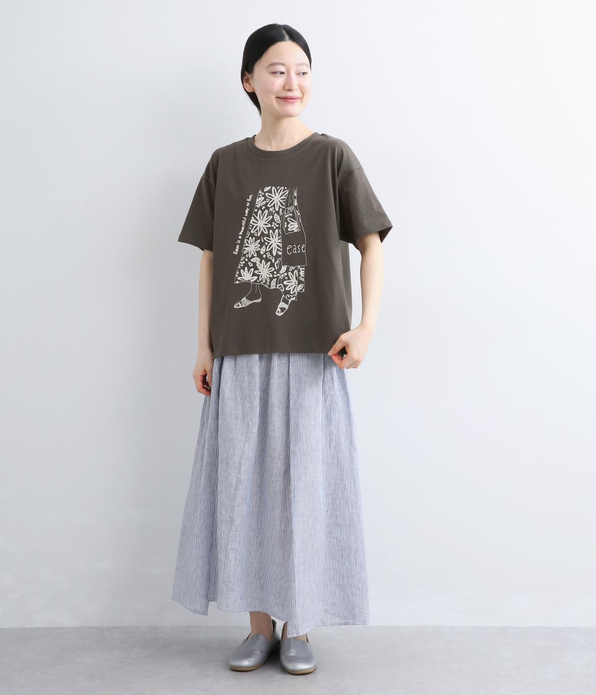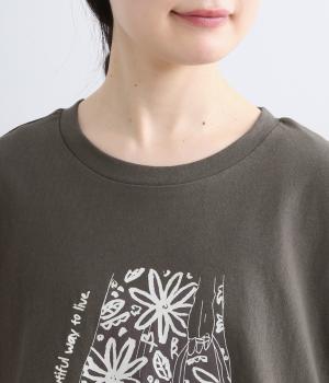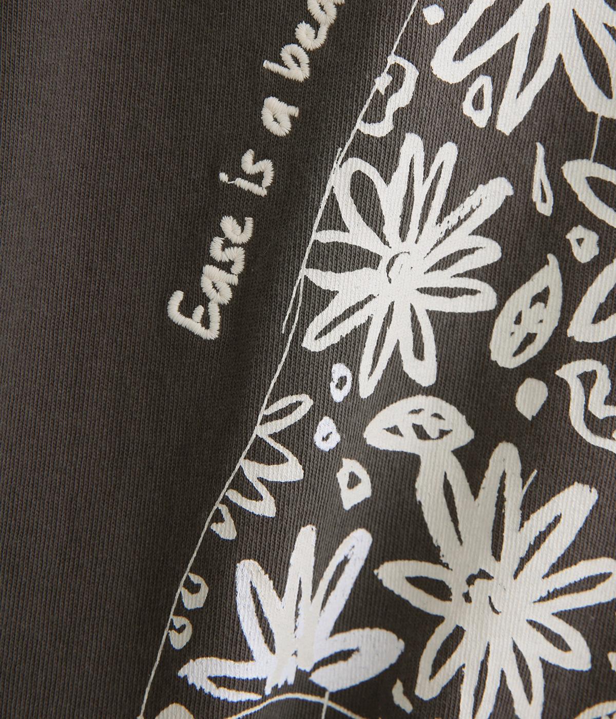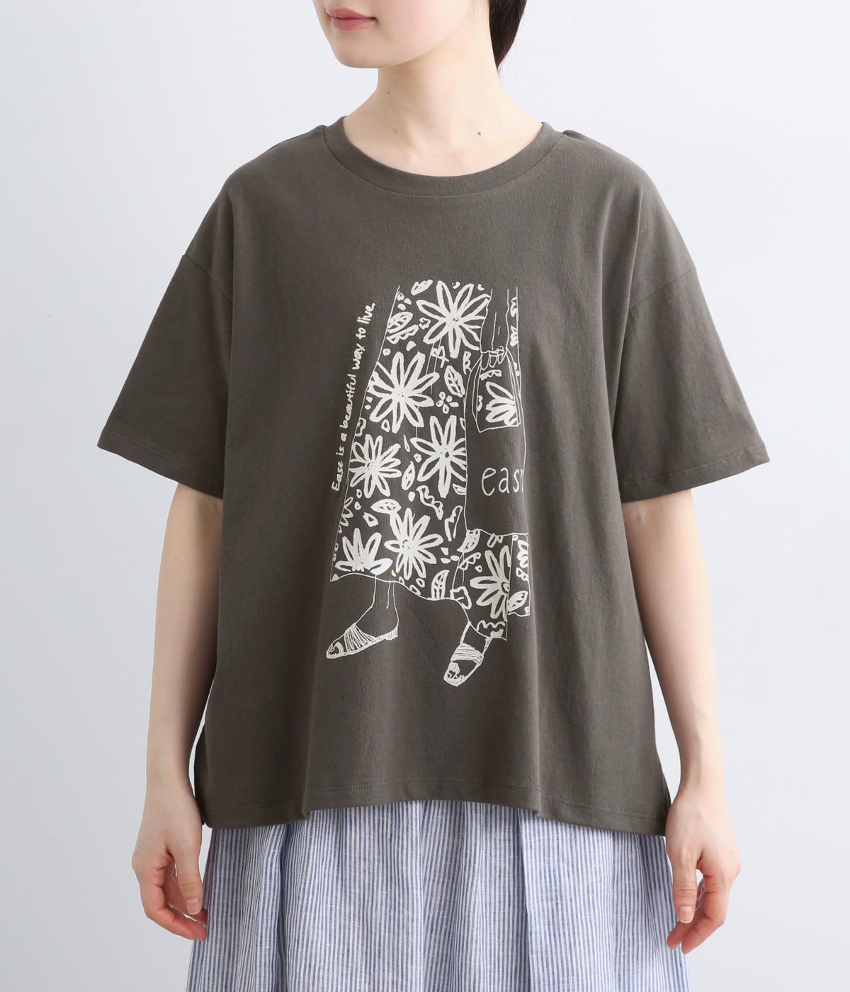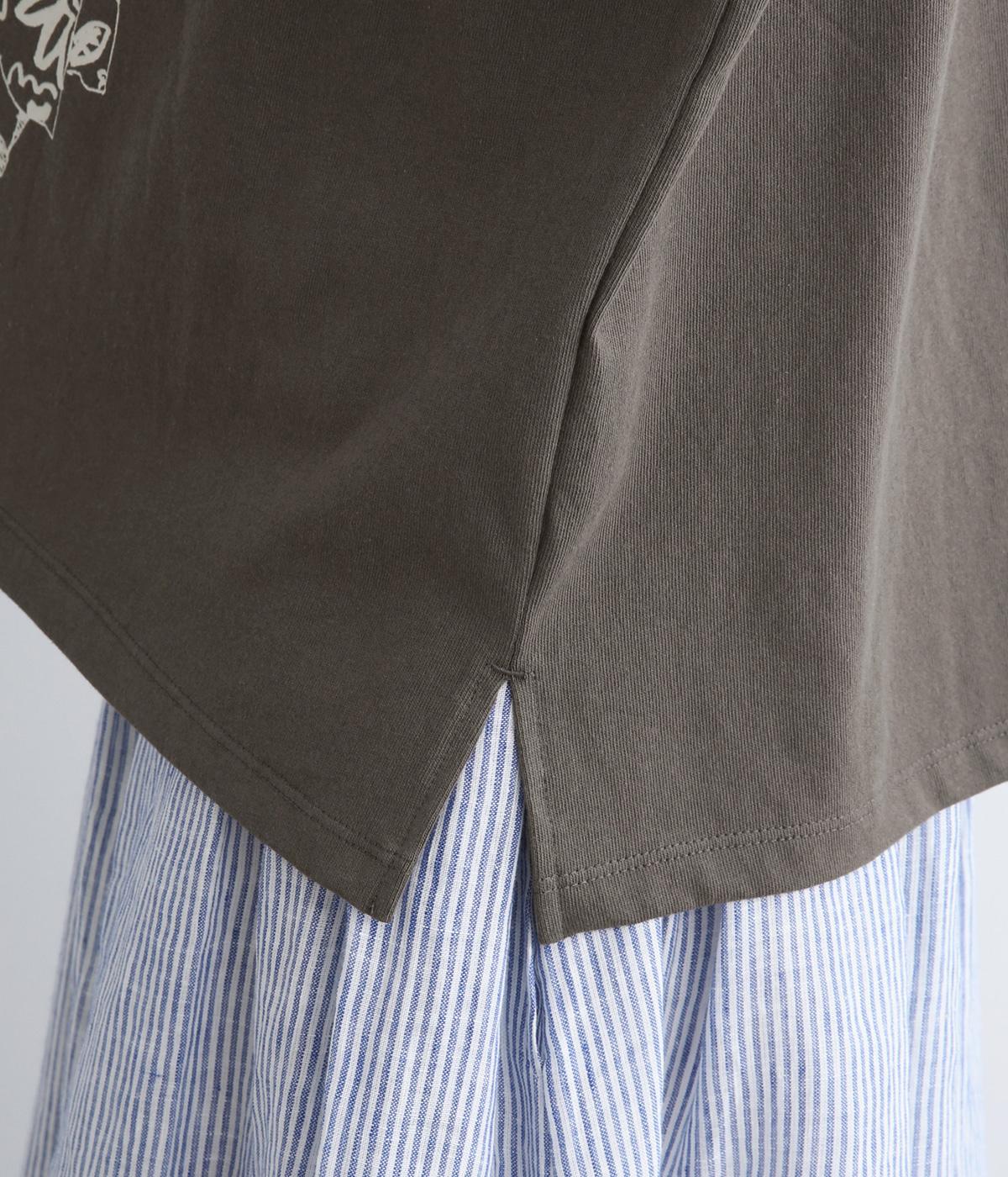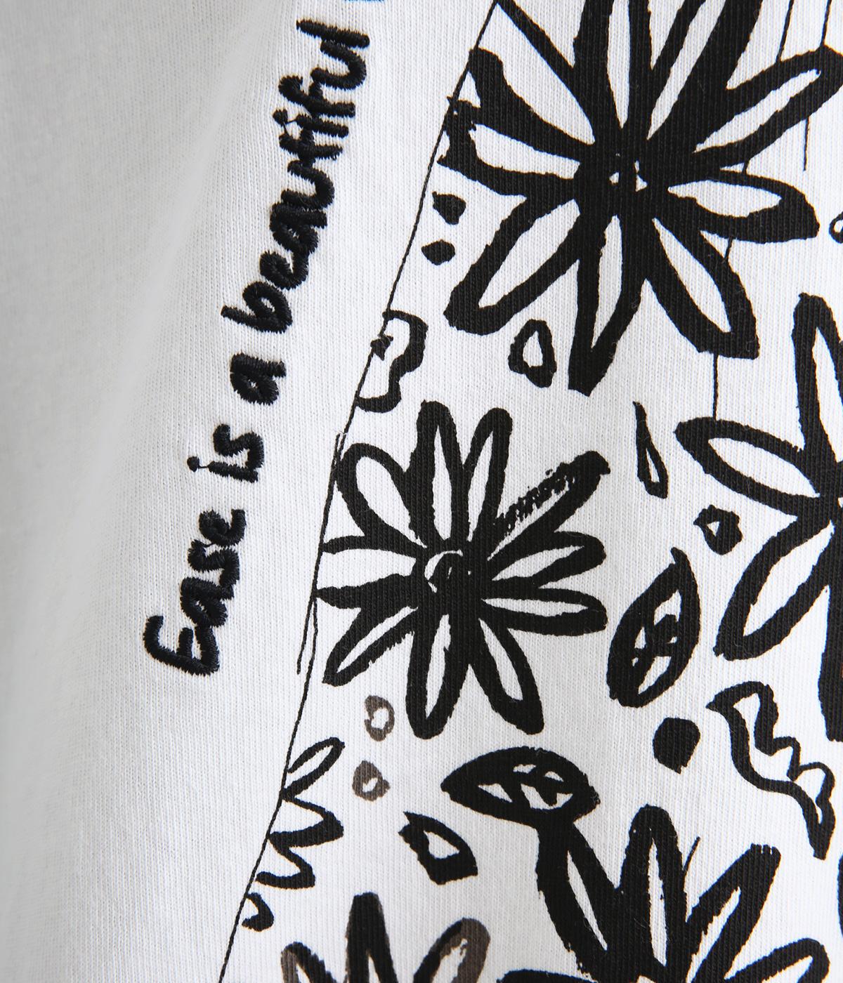 花柄ワンピースを着た女の子の足元を描いた、遊び心のあるプリントTシャツです。さりげなく入れたメッセージ刺しゅうがアクセントを添えます。ほどよくゆとりのあるシルエットと裾のスリットで、幅広いボトムスに合わせやすいのも◎。着まわしに活躍する一枚です。