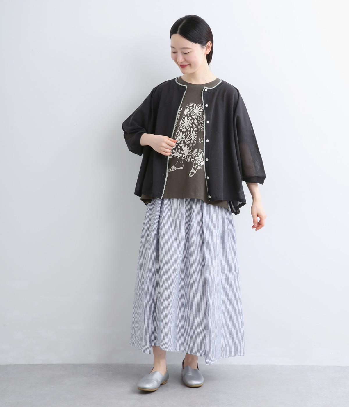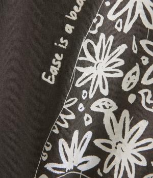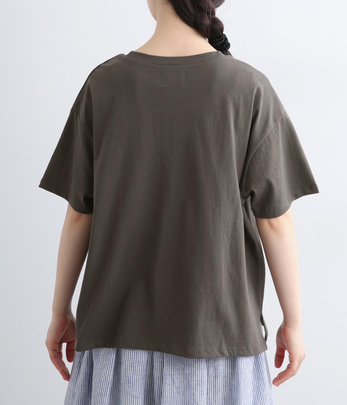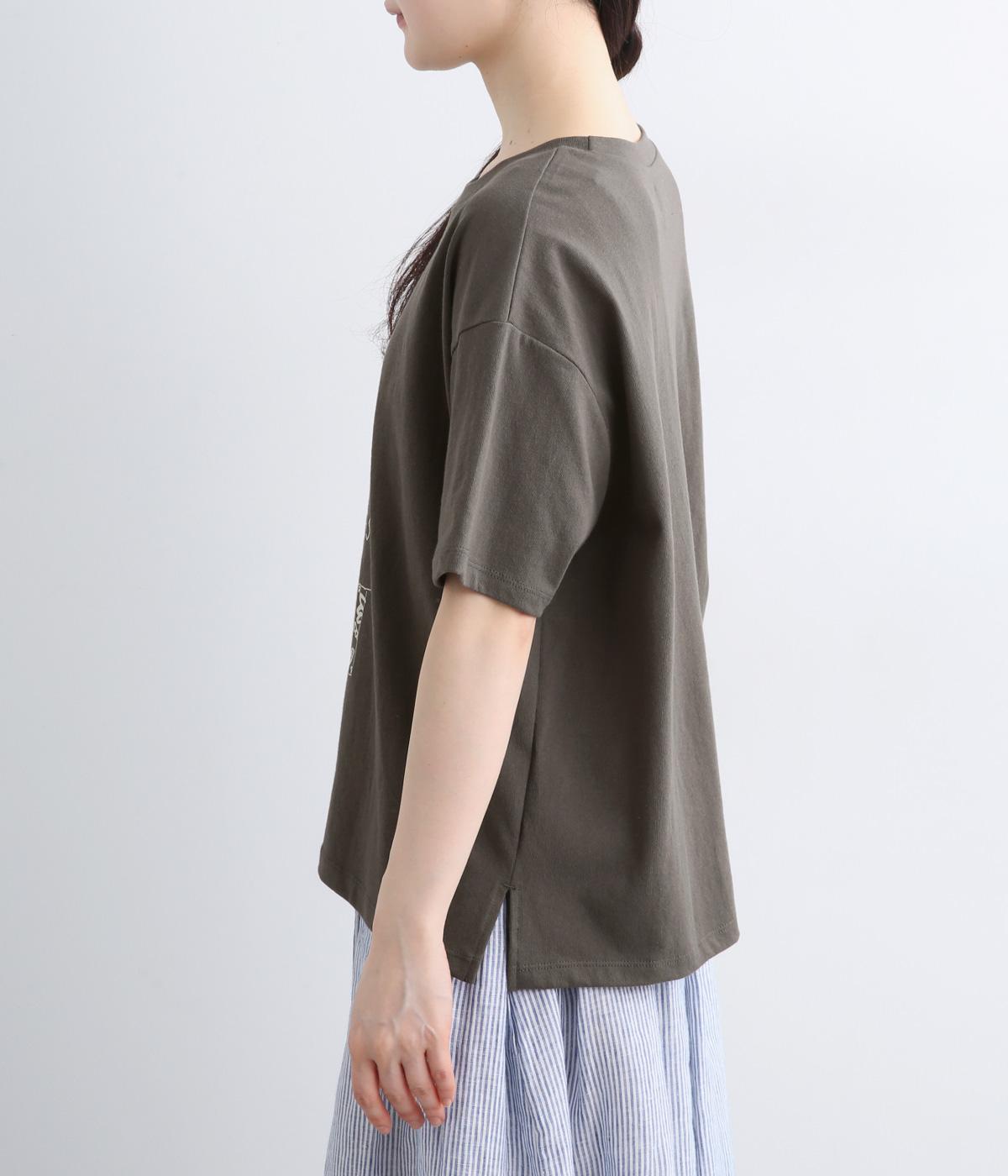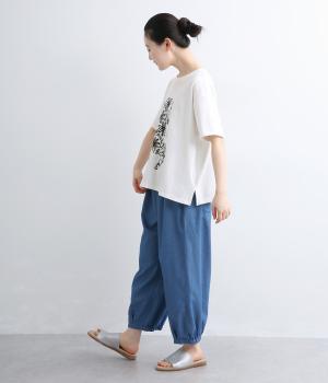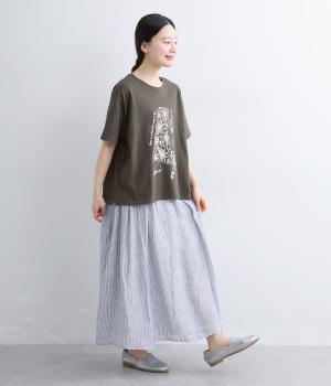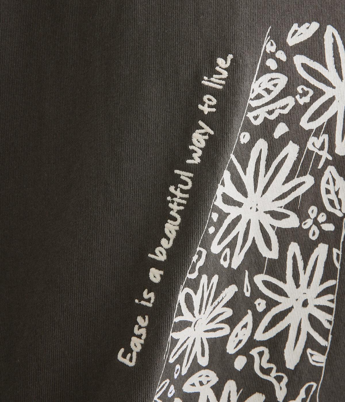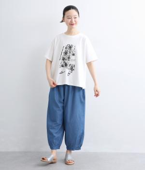 花柄ワンピースを着た女の子の足元を描いた、遊び心のあるプリントTシャツです。さりげなく入れたメッセージ刺しゅうがアクセントを添えます。ほどよくゆとりのあるシルエットと裾のスリットで、幅広いボトムスに合わせやすいのも◎。着まわしに活躍する一枚です。