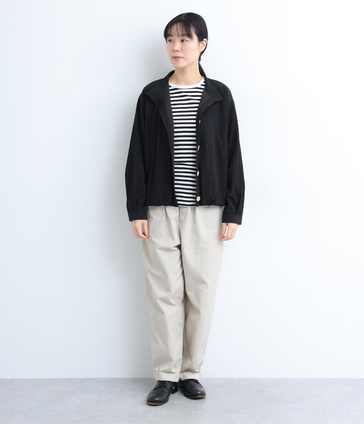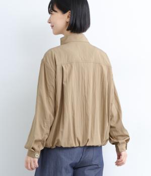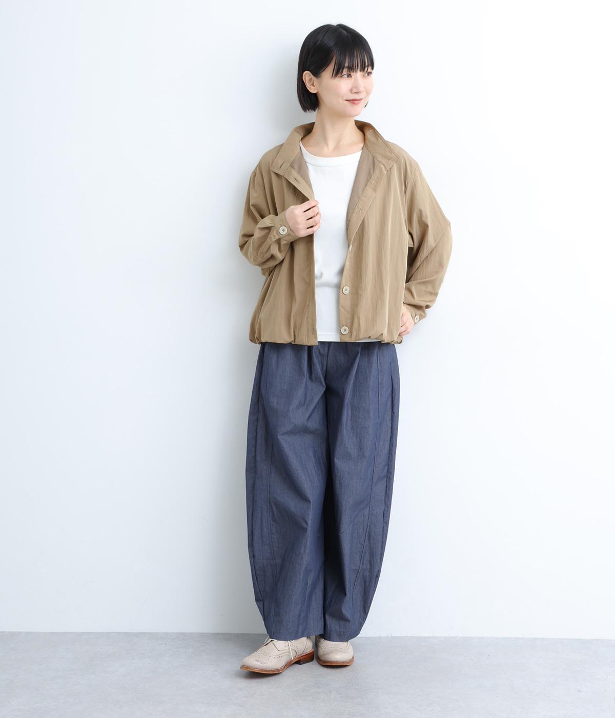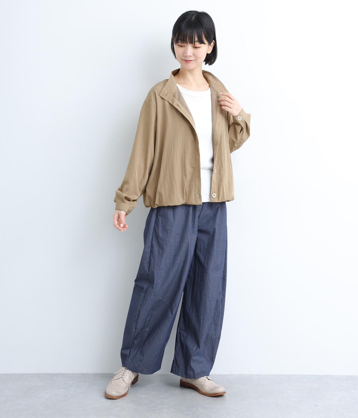 裾をゴムギャザーで寄せたバルーンシルエットがやさしい印象を与えるブルゾン。大き目のボタンやハイネックもポイントでクールになりすぎないバランスが◎。薄手なのでラフに羽織りやすく、季節の変わり目にも重宝します。