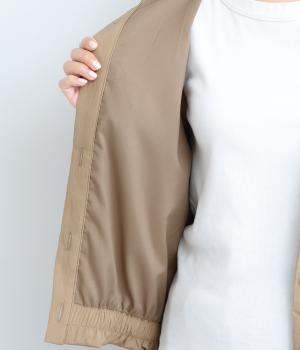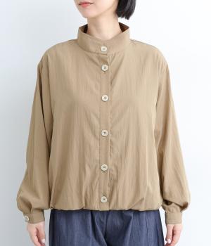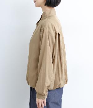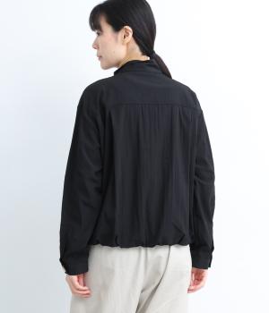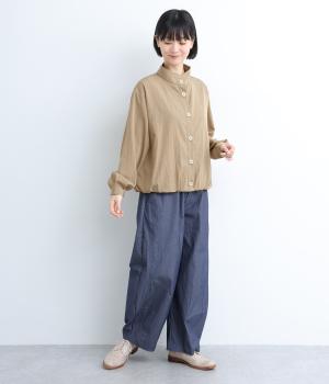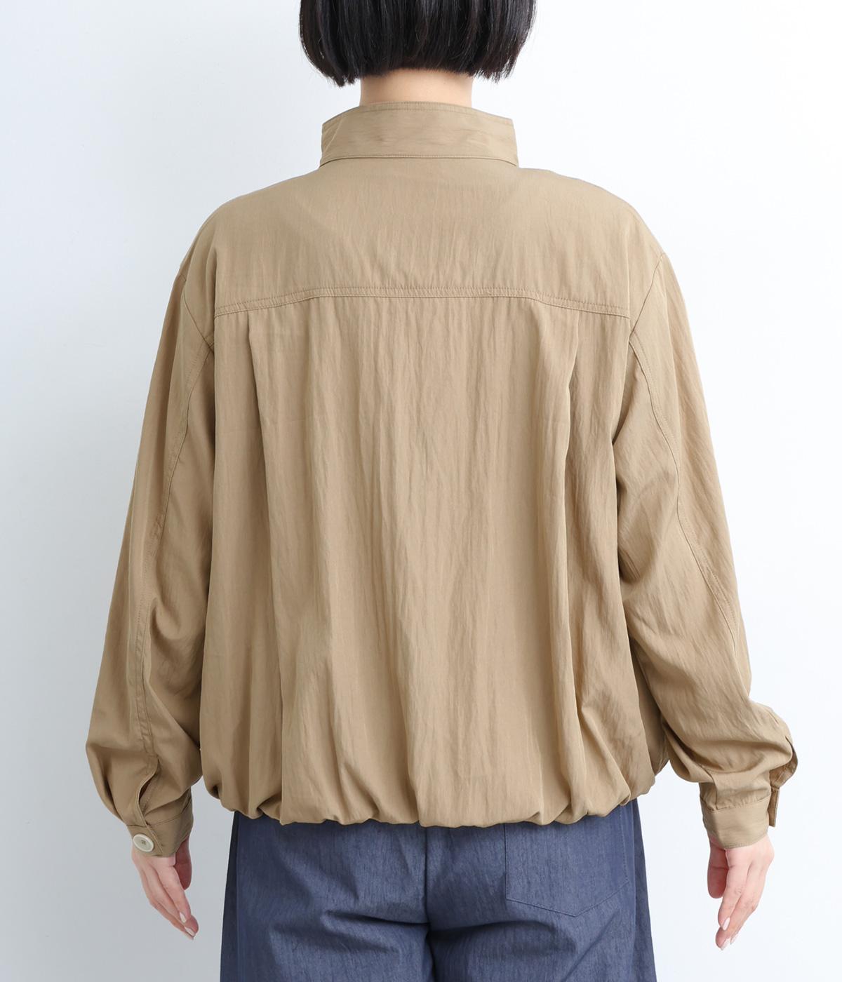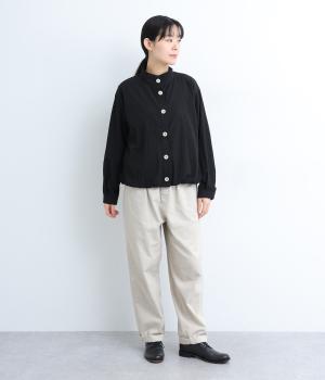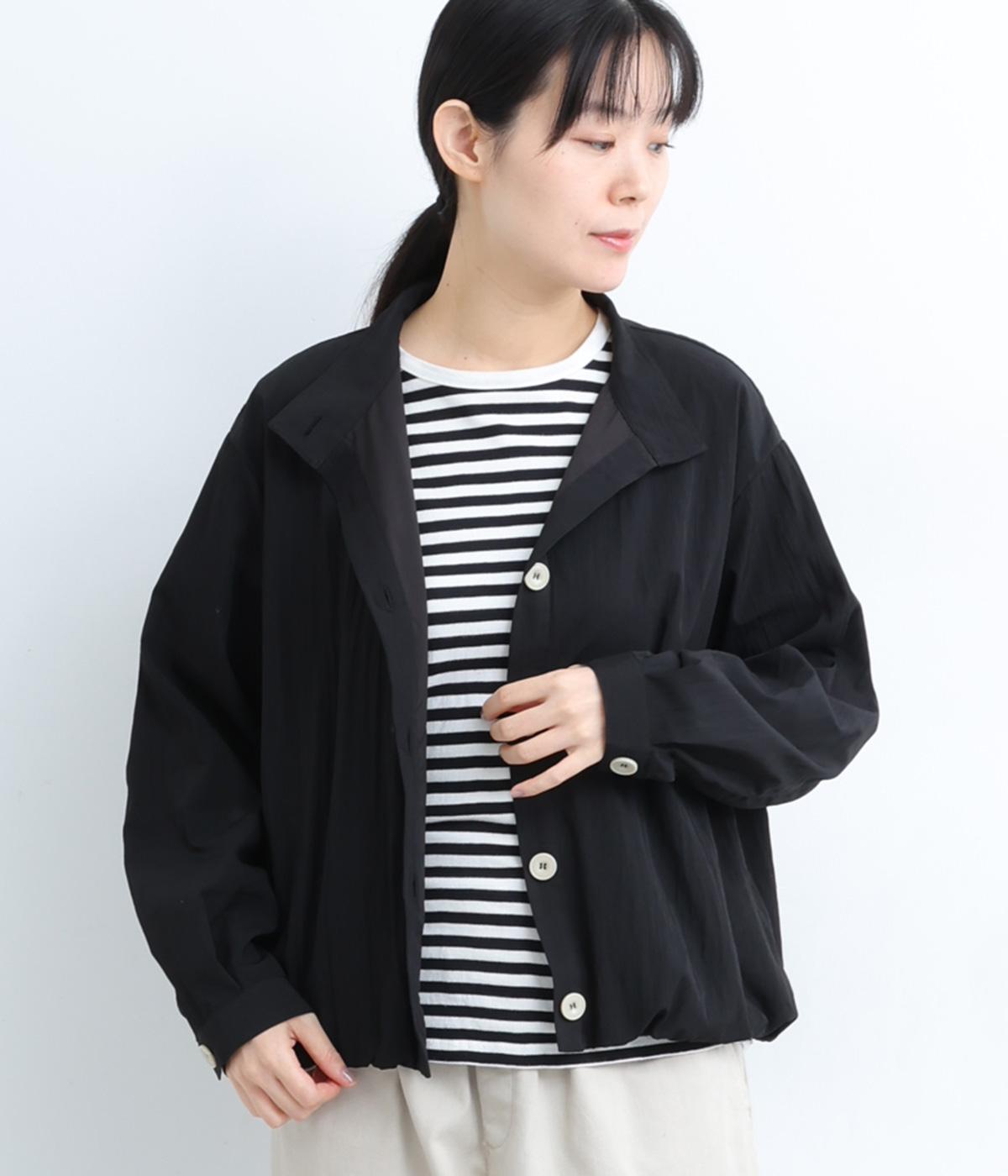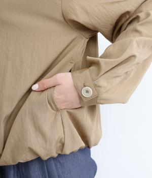 裾をゴムギャザーで寄せたバルーンシルエットがやさしい印象を与えるブルゾン。大き目のボタンやハイネックもポイントでクールになりすぎないバランスが◎。薄手なのでラフに羽織りやすく、季節の変わり目にも重宝します。