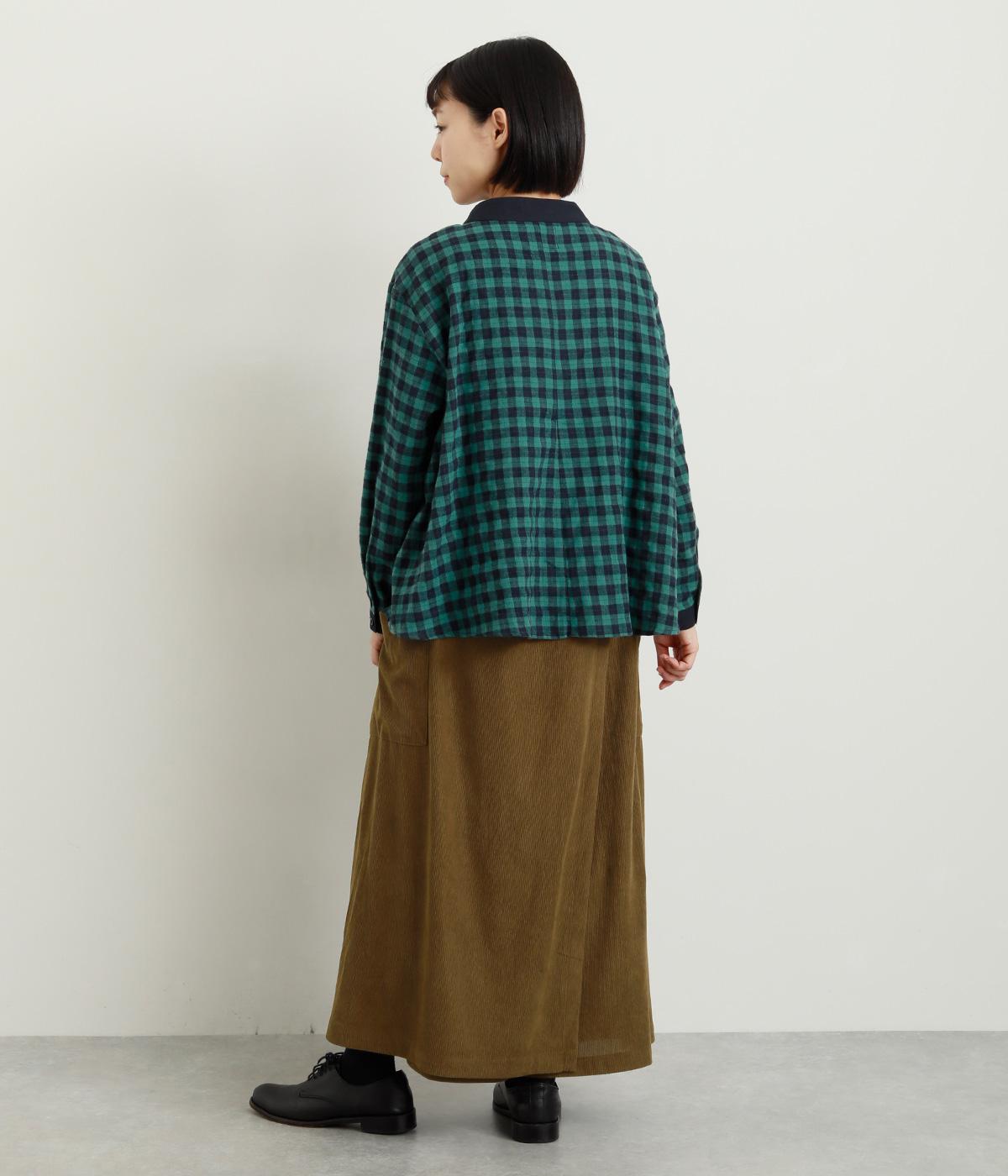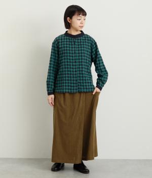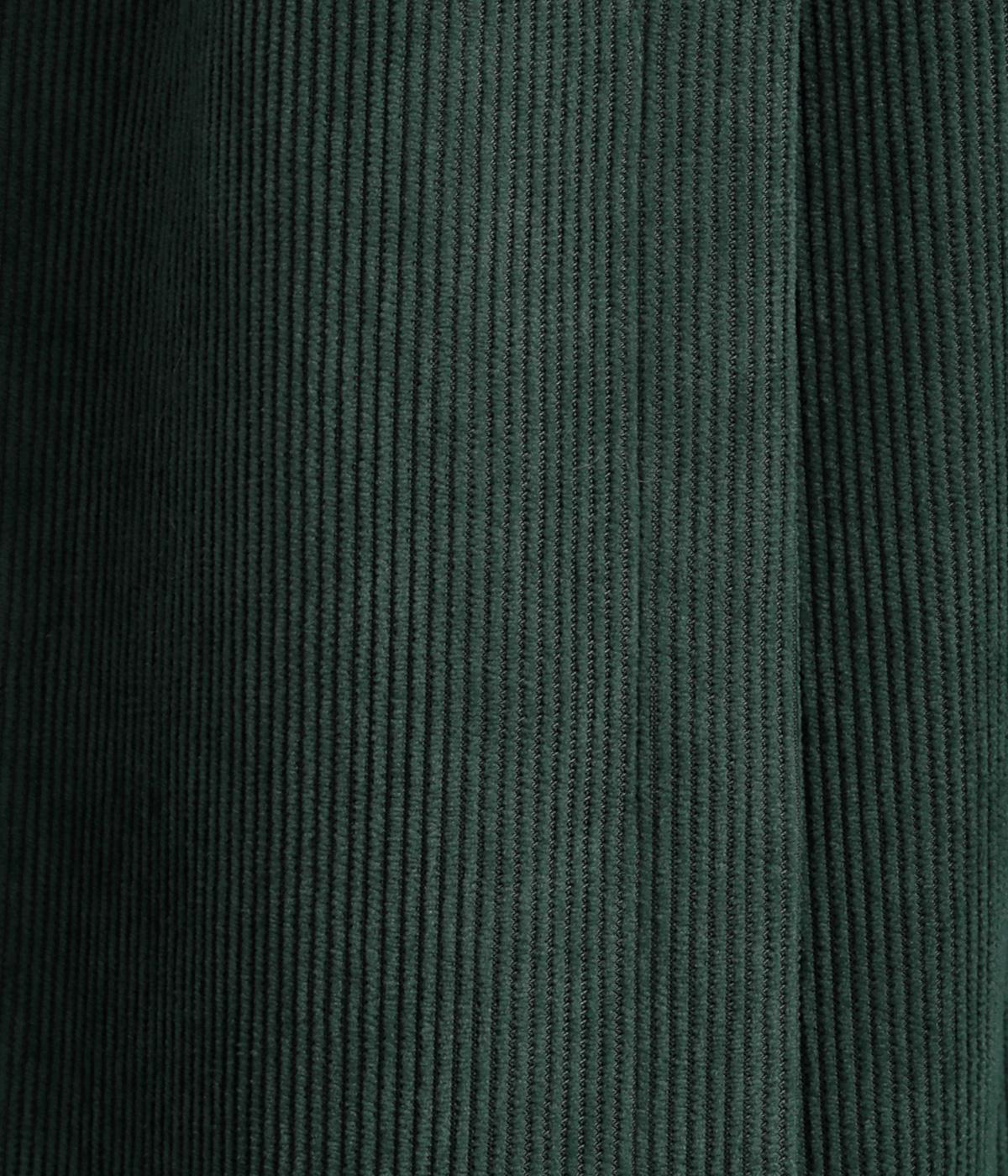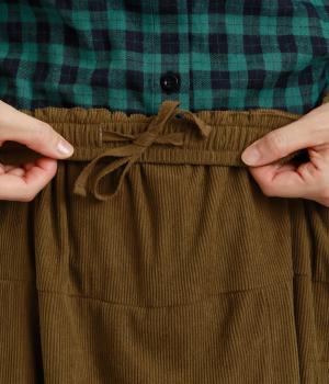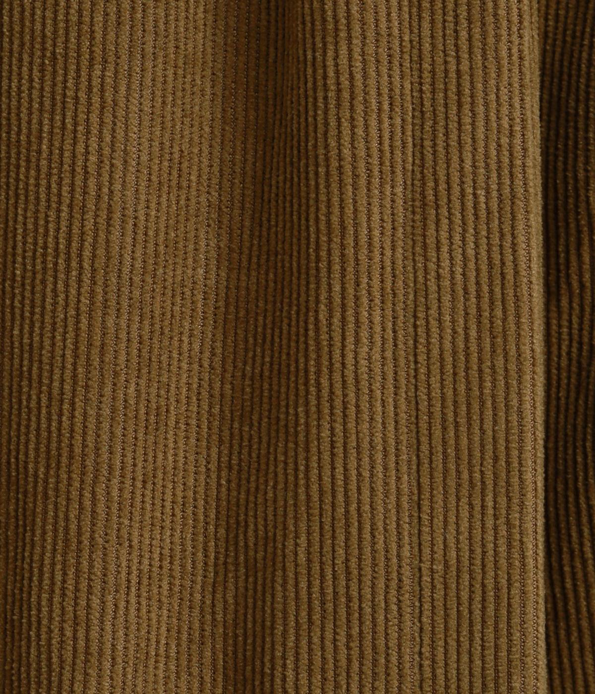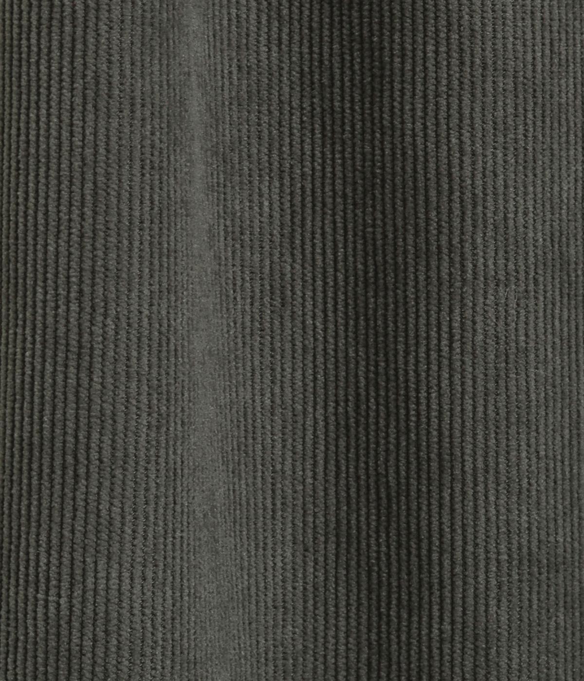 ほどよい太さの畝がやわらかい表情をつくる、薄手のコーデュロイ生地を使用しました。裏側は肌ばなれのよいつるりとした仕上がりで、軽やかに着用できる質感です。
