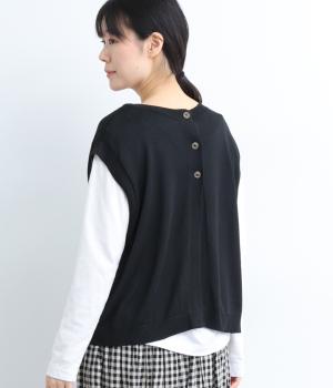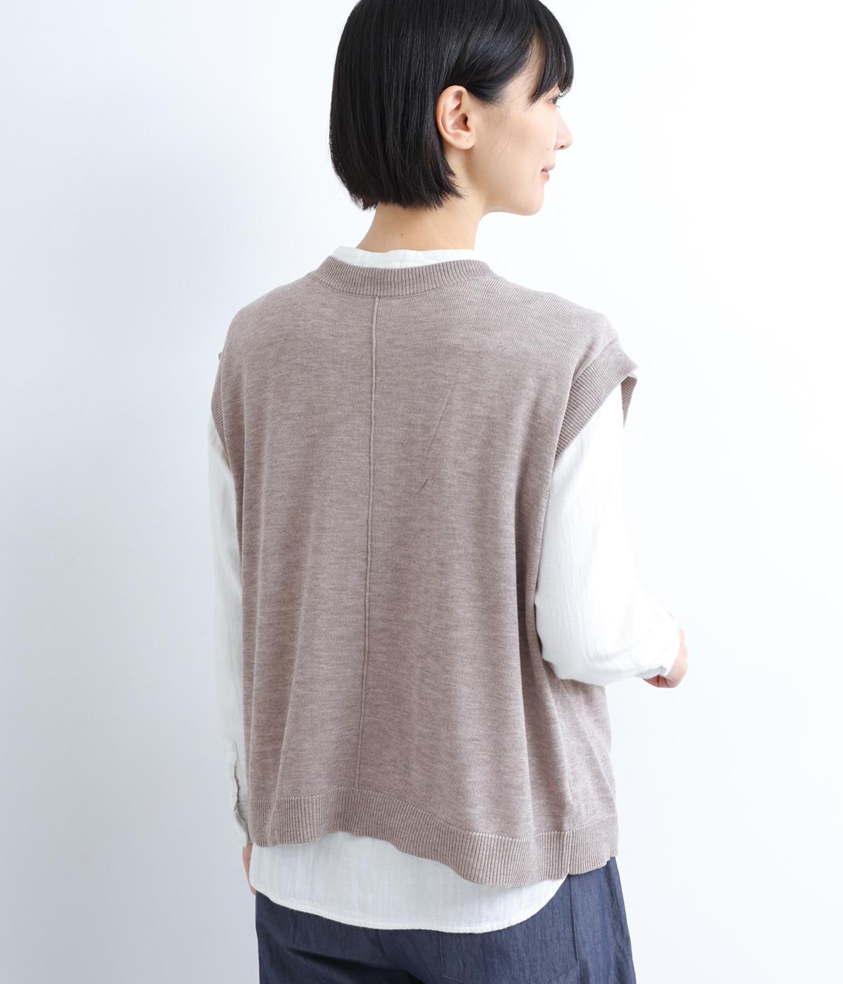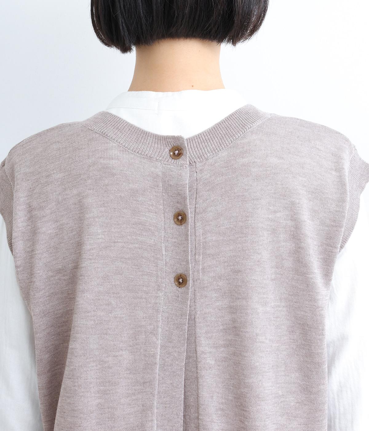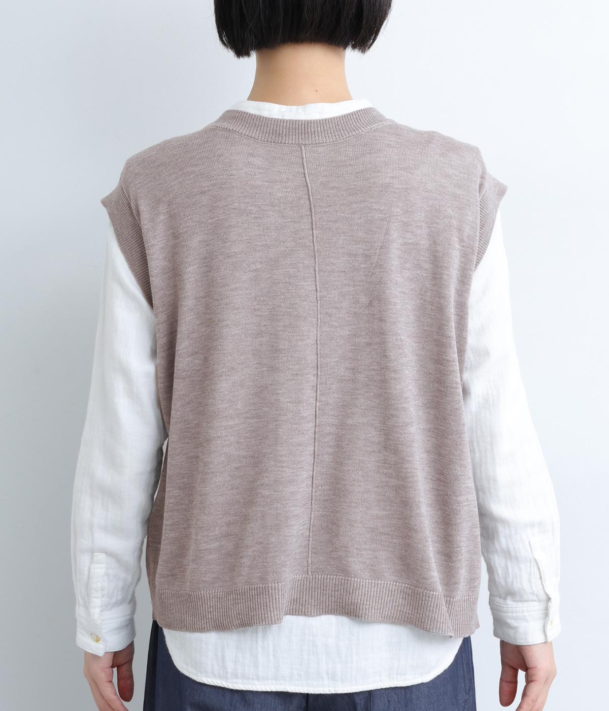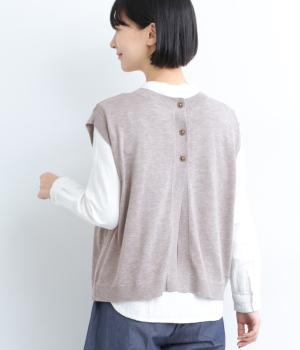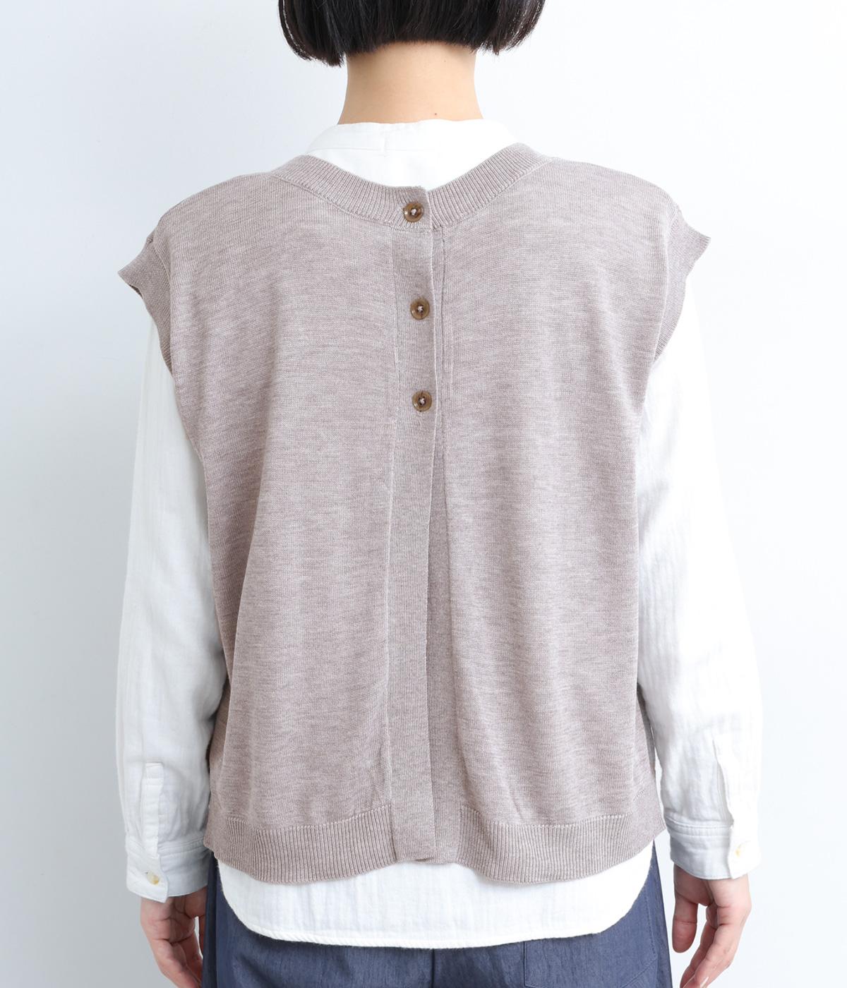 前後で着用できる2way仕様のニットベスト。片面はシンプルに、もう片面はボタン仕様で前あきベストとしてもたのしめます。適度なサイズ感で裾からシャツをチラ見せするなどレイヤードスタイルに重宝します。