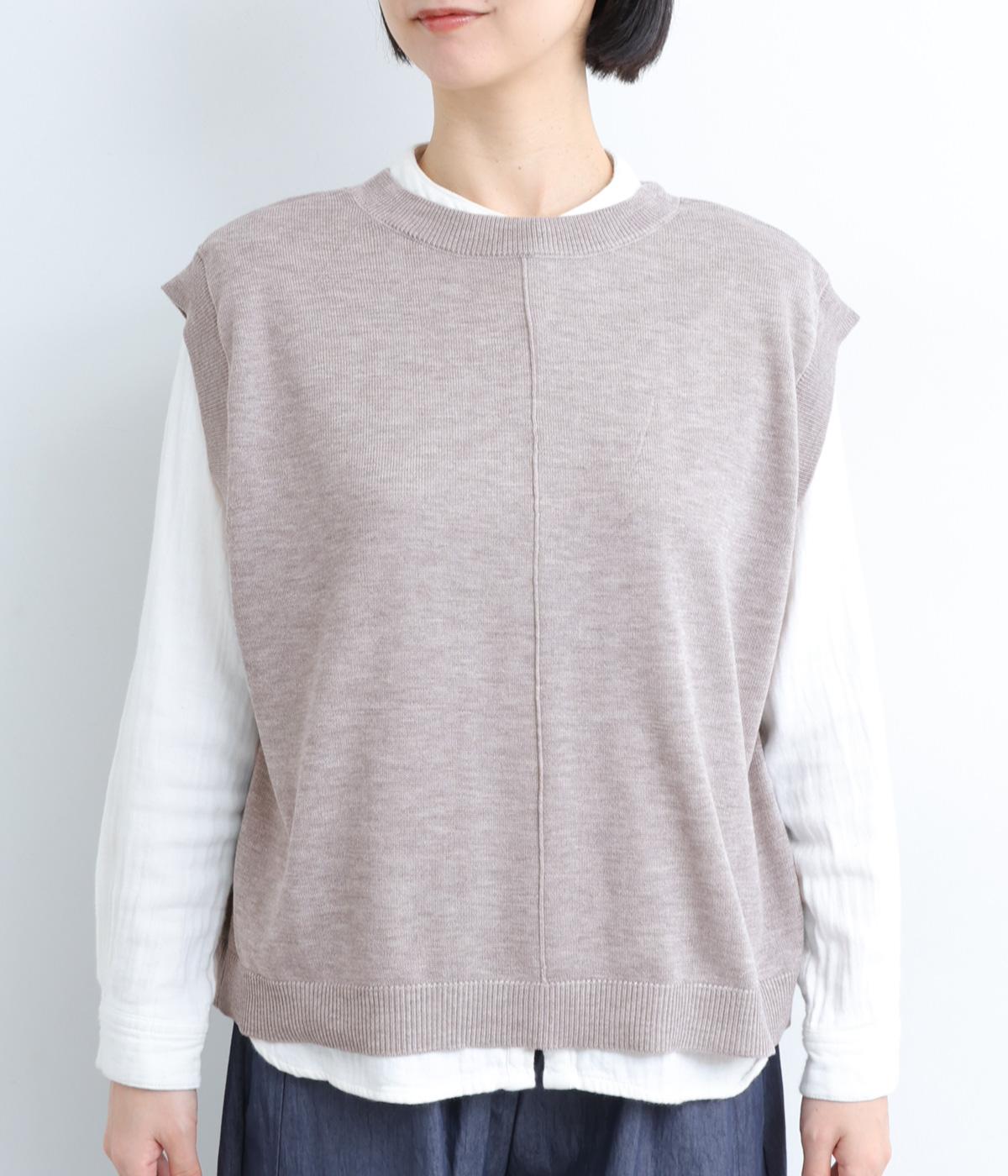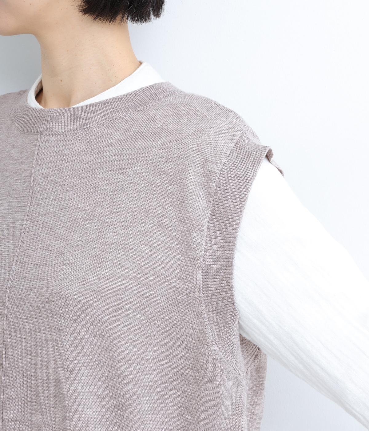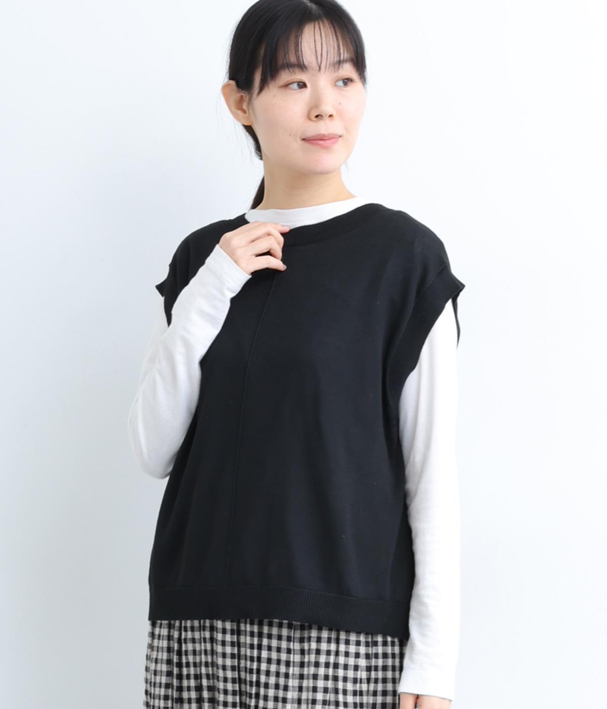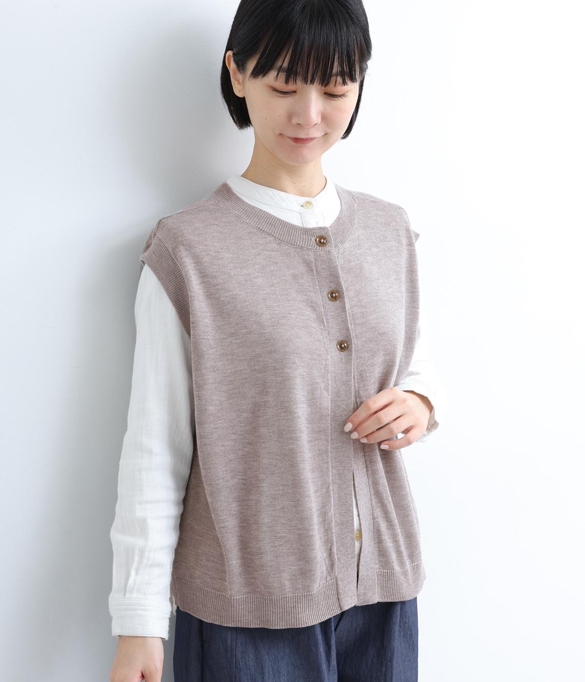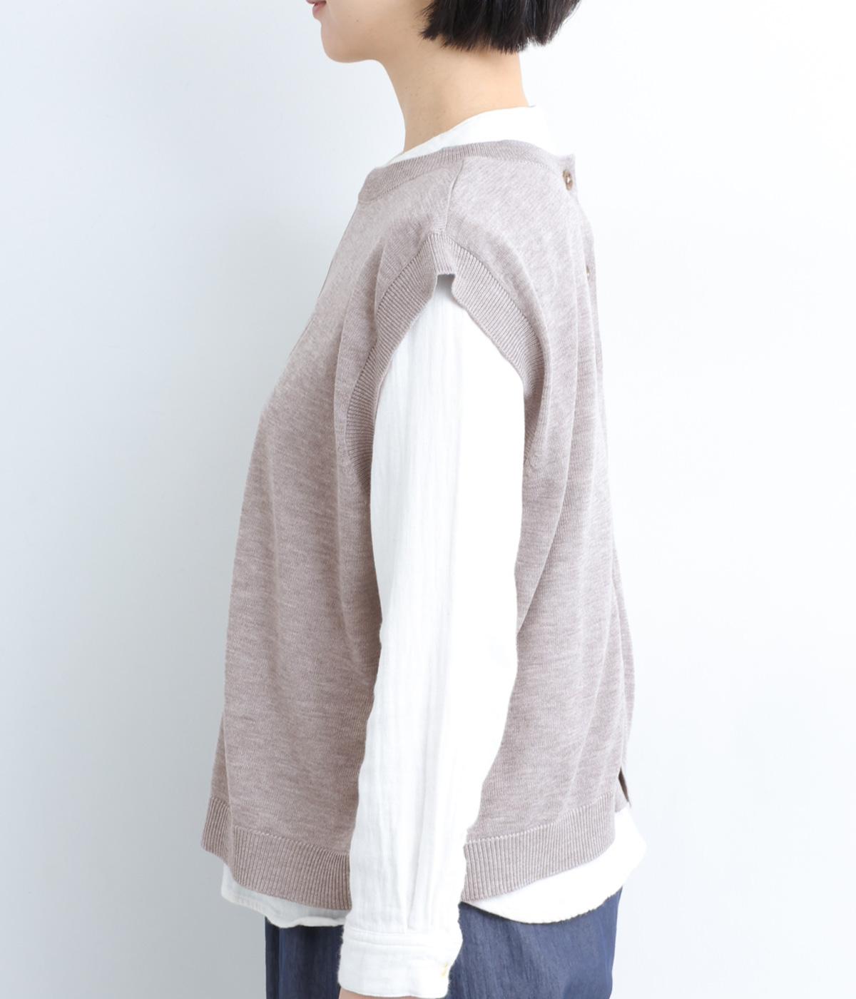 前後で着用できる2way仕様のニットベスト。片面はシンプルに、もう片面はボタン仕様で前あきベストとしてもたのしめます。適度なサイズ感で裾からシャツをチラ見せするなどレイヤードスタイルに重宝します。