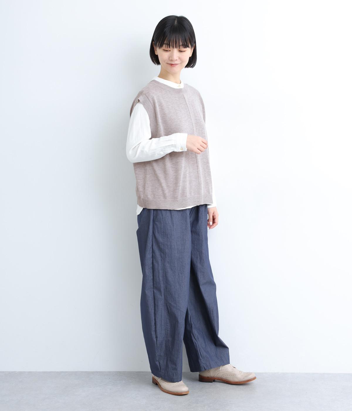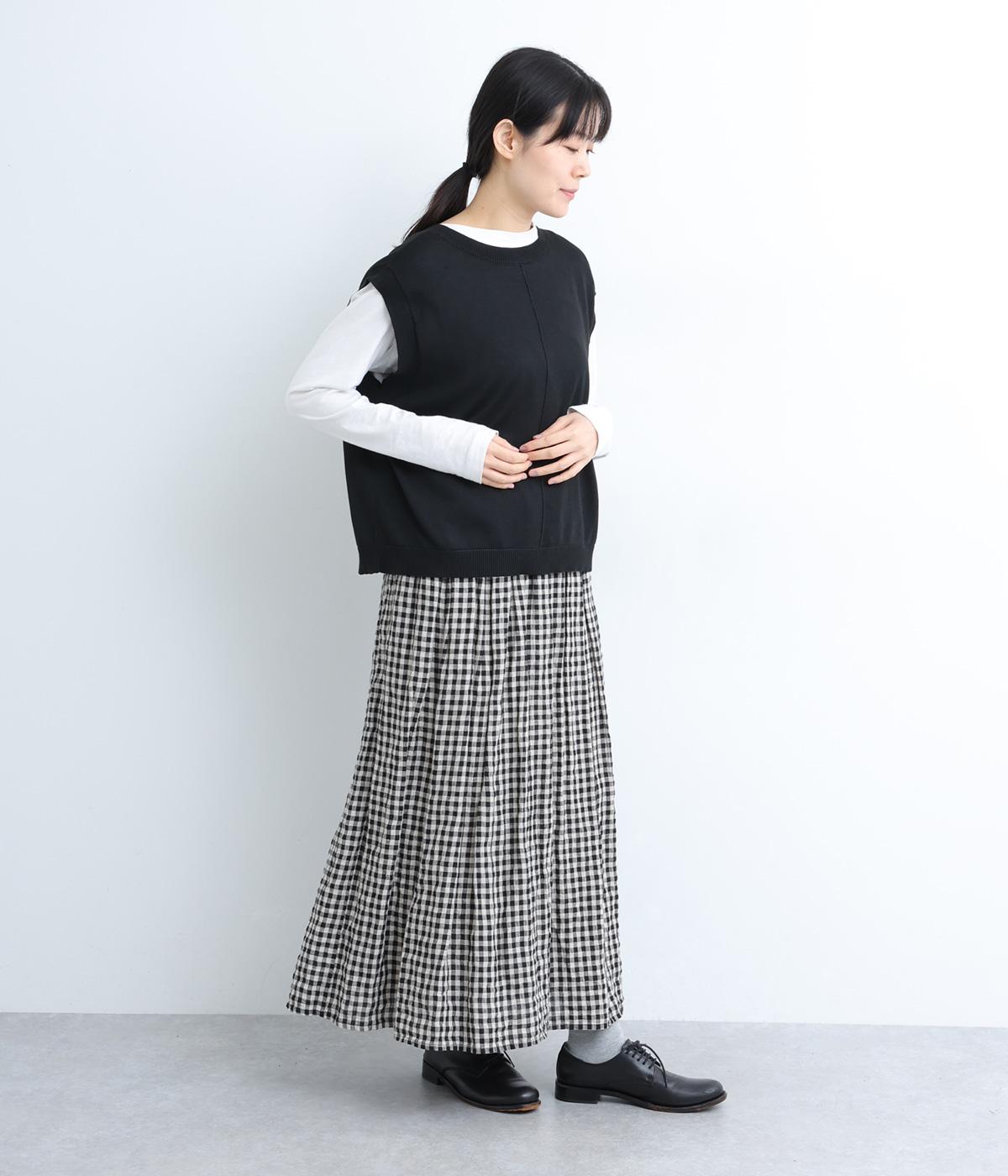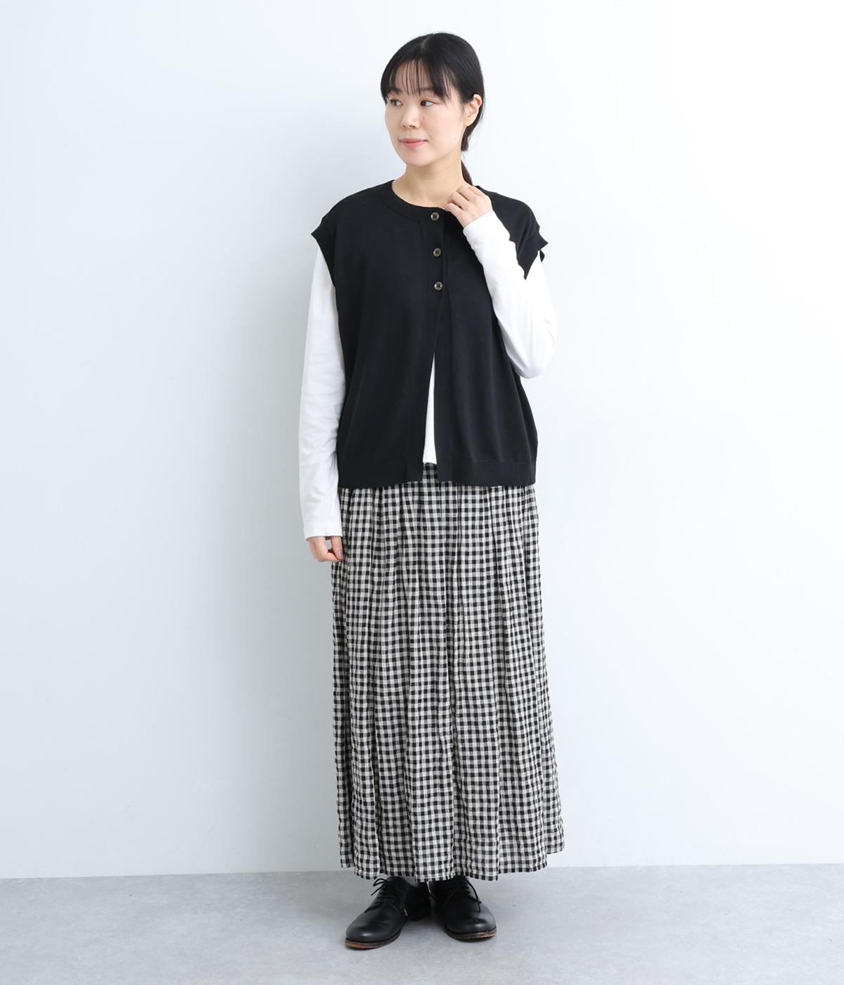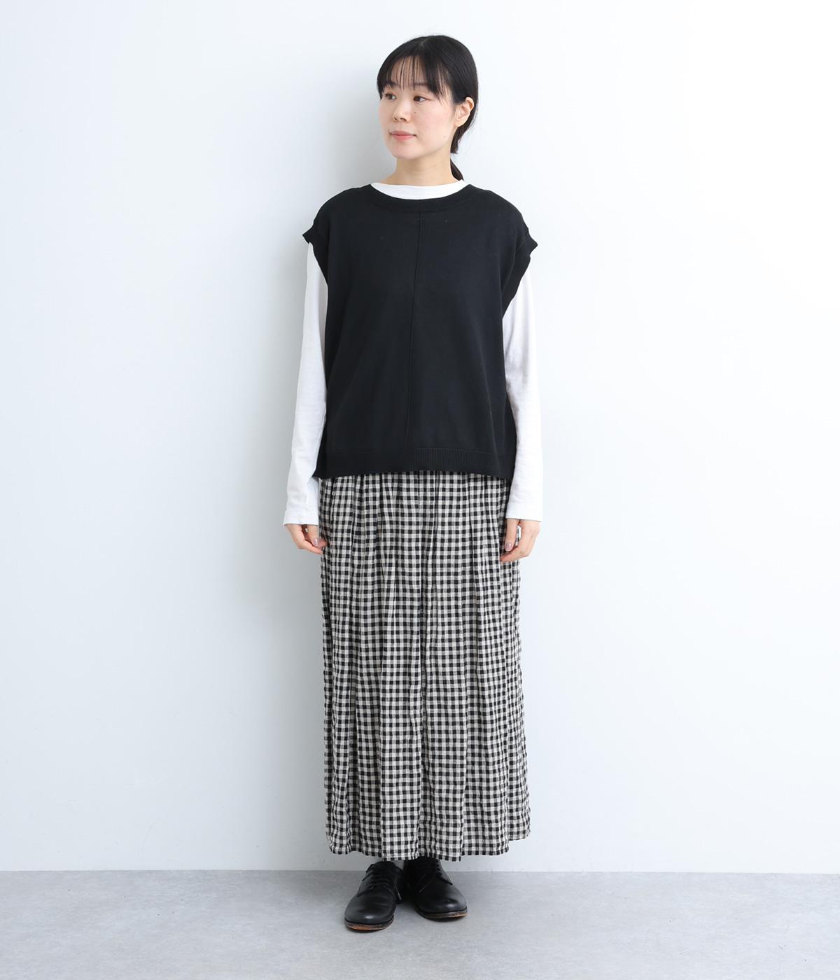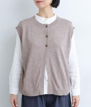 前後で着用できる2way仕様のニットベスト。片面はシンプルに、もう片面はボタン仕様で前あきベストとしてもたのしめます。適度なサイズ感で裾からシャツをチラ見せするなどレイヤードスタイルに重宝します。