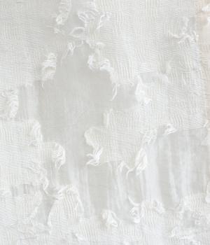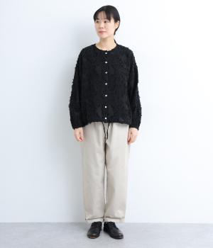 レーヨンをメインにした混紡素材できれいな落ち感を表現しました。透け感のある薄手素材が軽やかな印象で、ジャカード素材特有の華やかな表面感も目を惹きます。