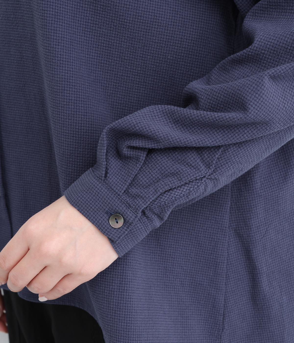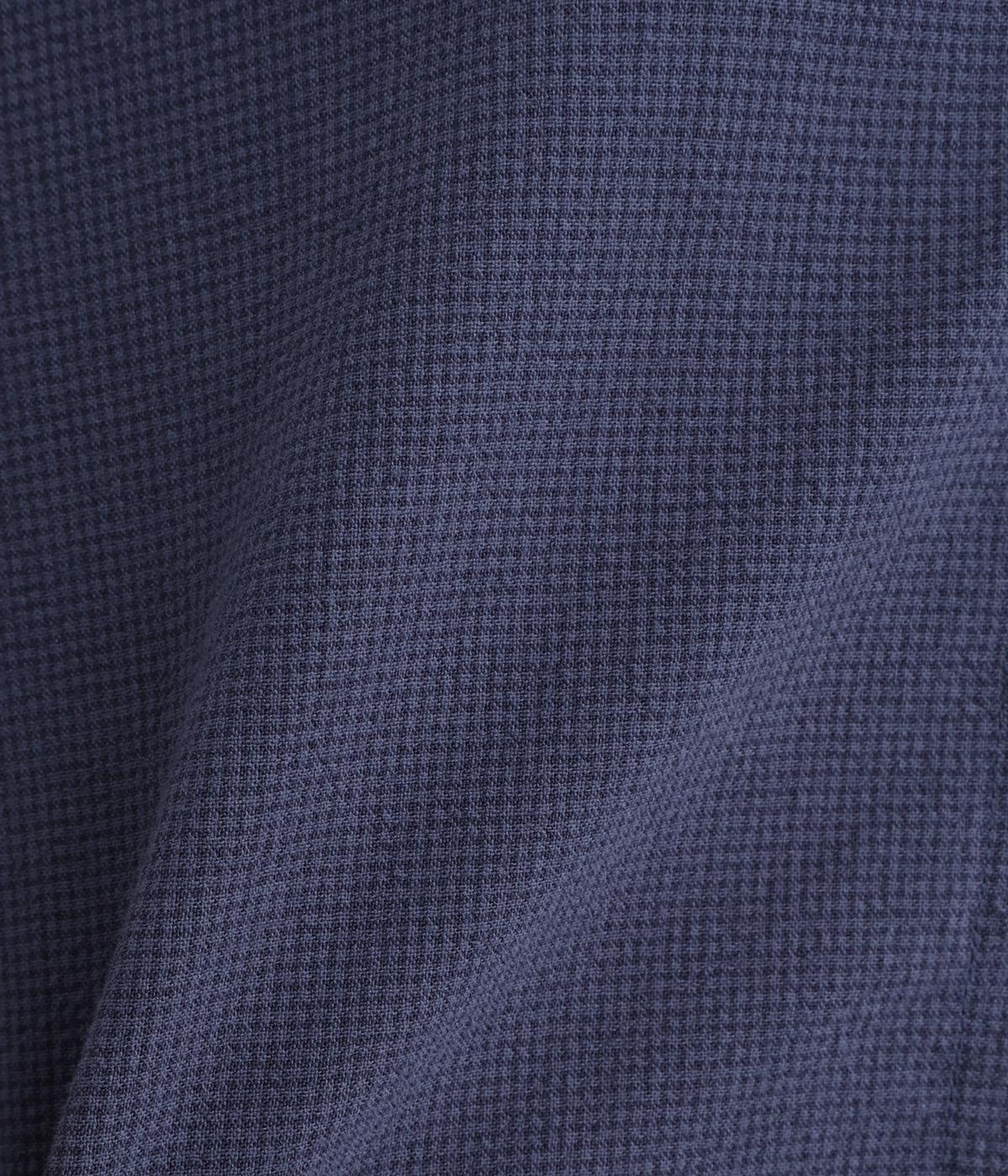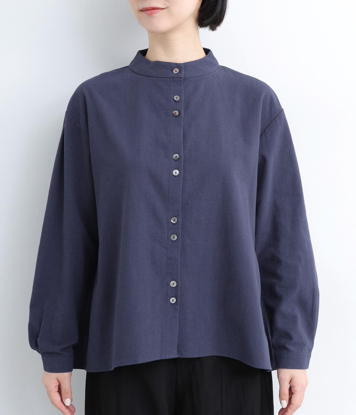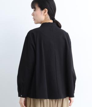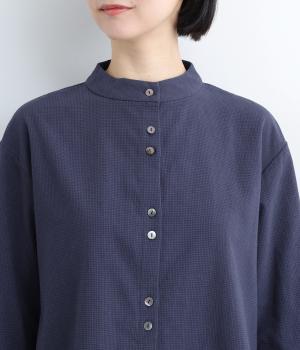 とても細かい同色系のチェック柄が大人かわいい印象を与える一枚。ほどよく首から離れたスタンドカラーが◎。後ろ身頃はややフレアなシルエットできれいな立体感を出しています。2つずつ並んだボタン配置もこだわりです。