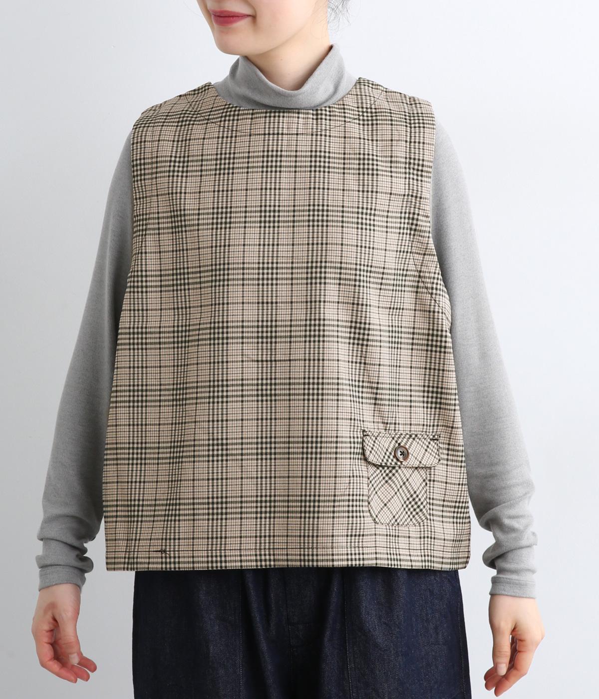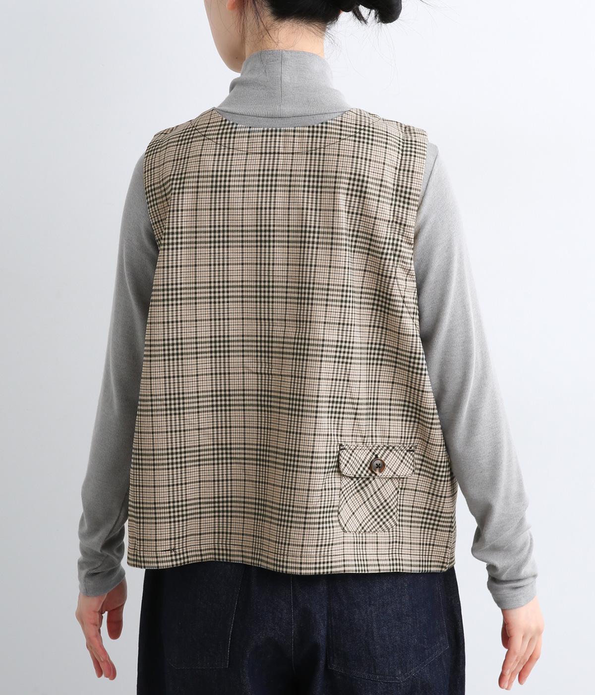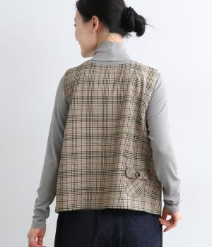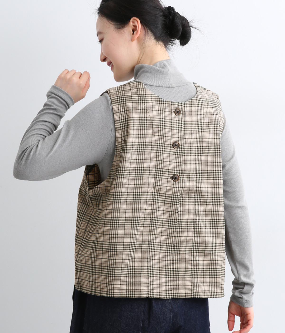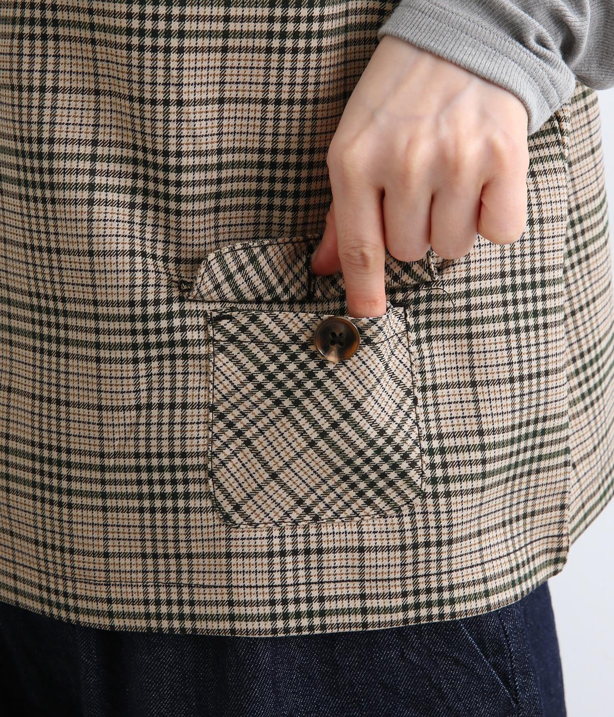 上の方にボタンを3つつけた面と、左裾に小さなフラップポケットを配した面のどちらを前にしてもたのしめる2way仕様です。ニットなどやや厚みのあるトップスの上からも着やすいゆったりとした身幅が◎。クラシカルなグレンチェック柄が、着こなしに上品さと華やかさをプラスしてくれます。