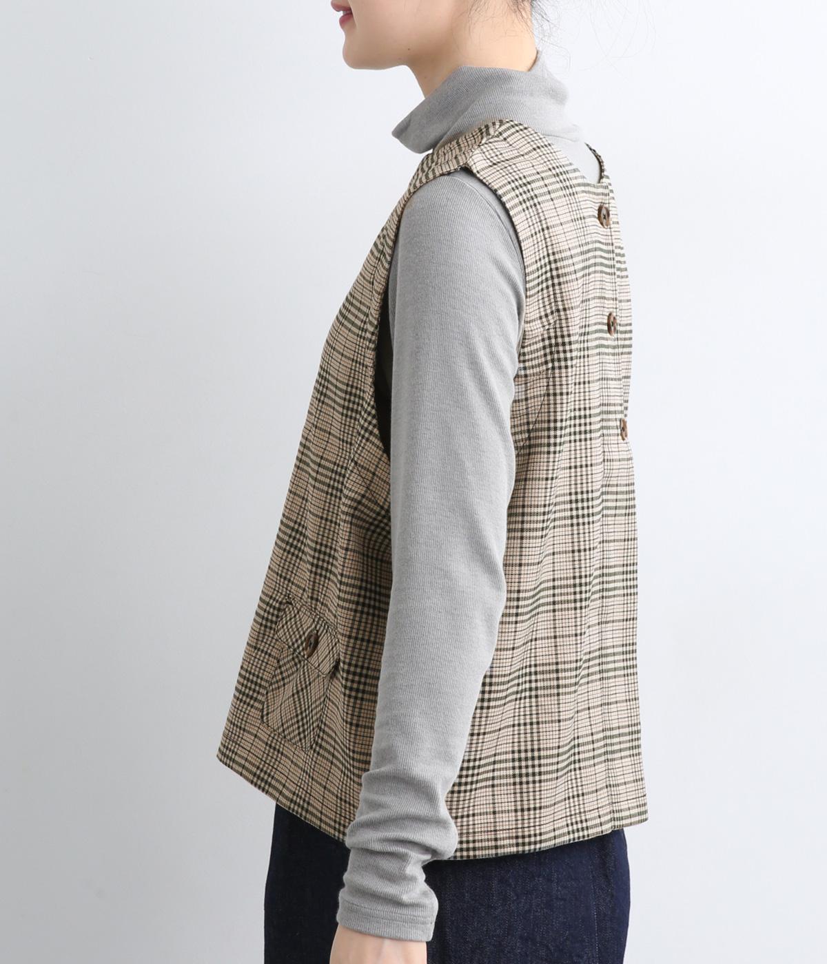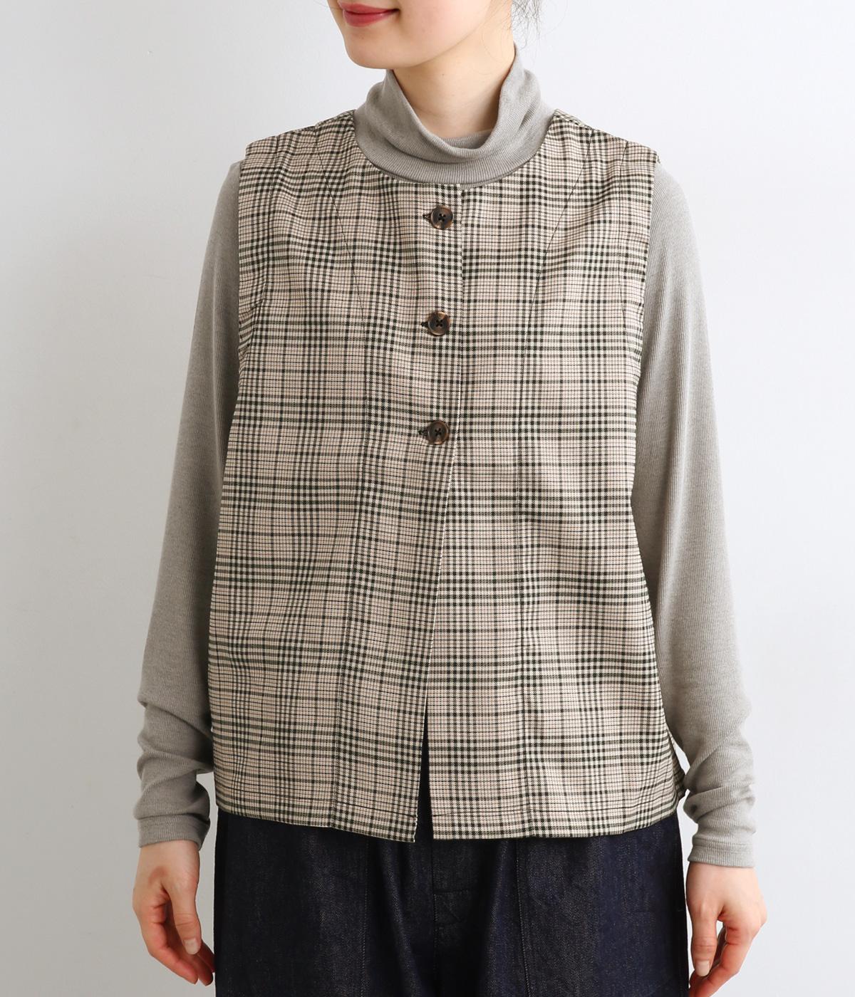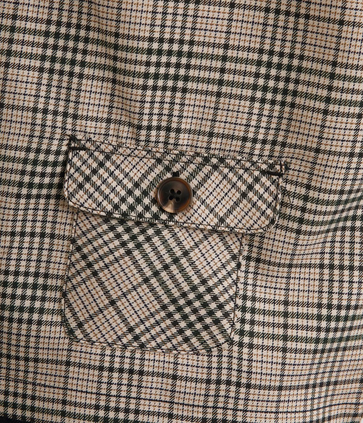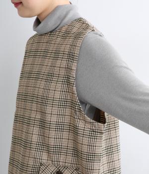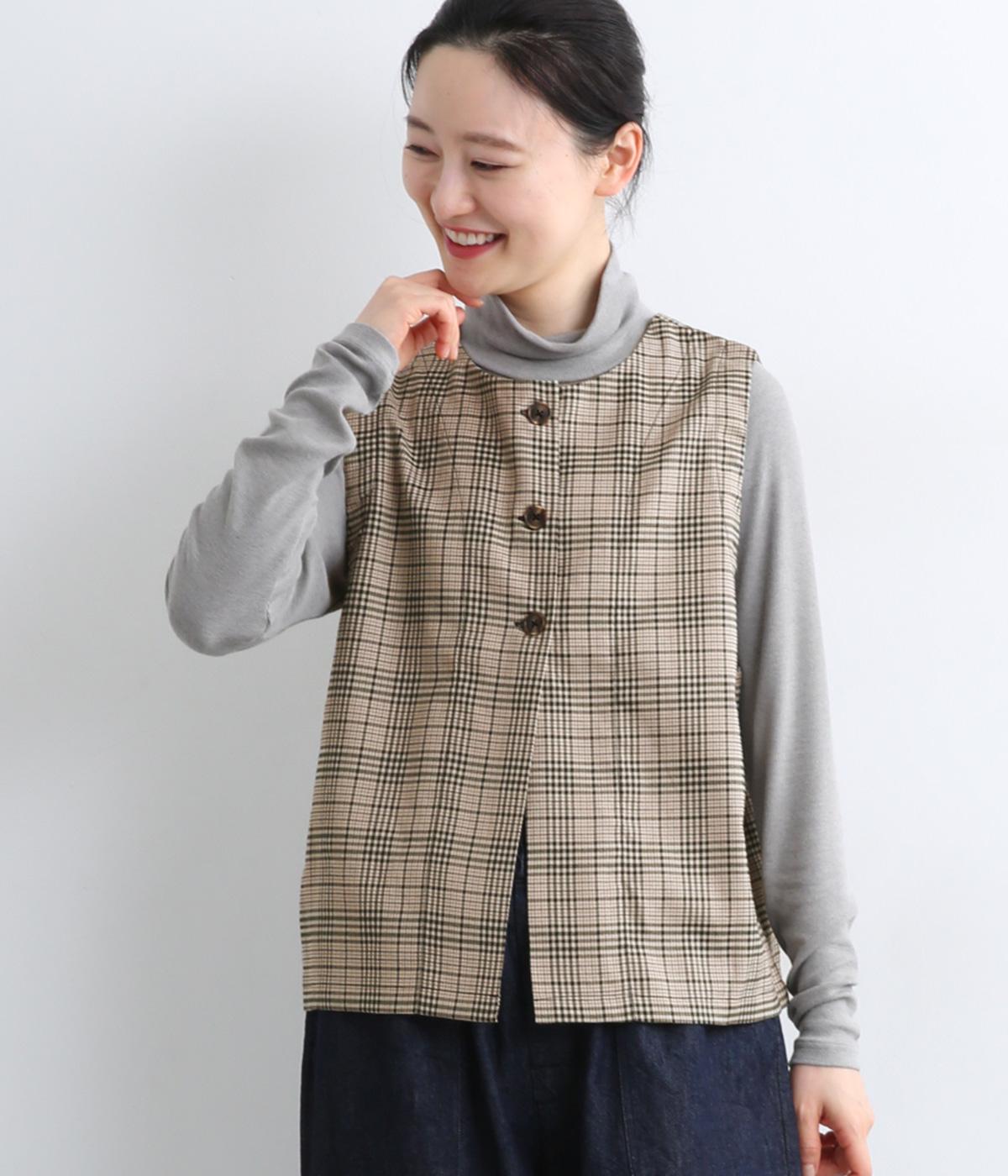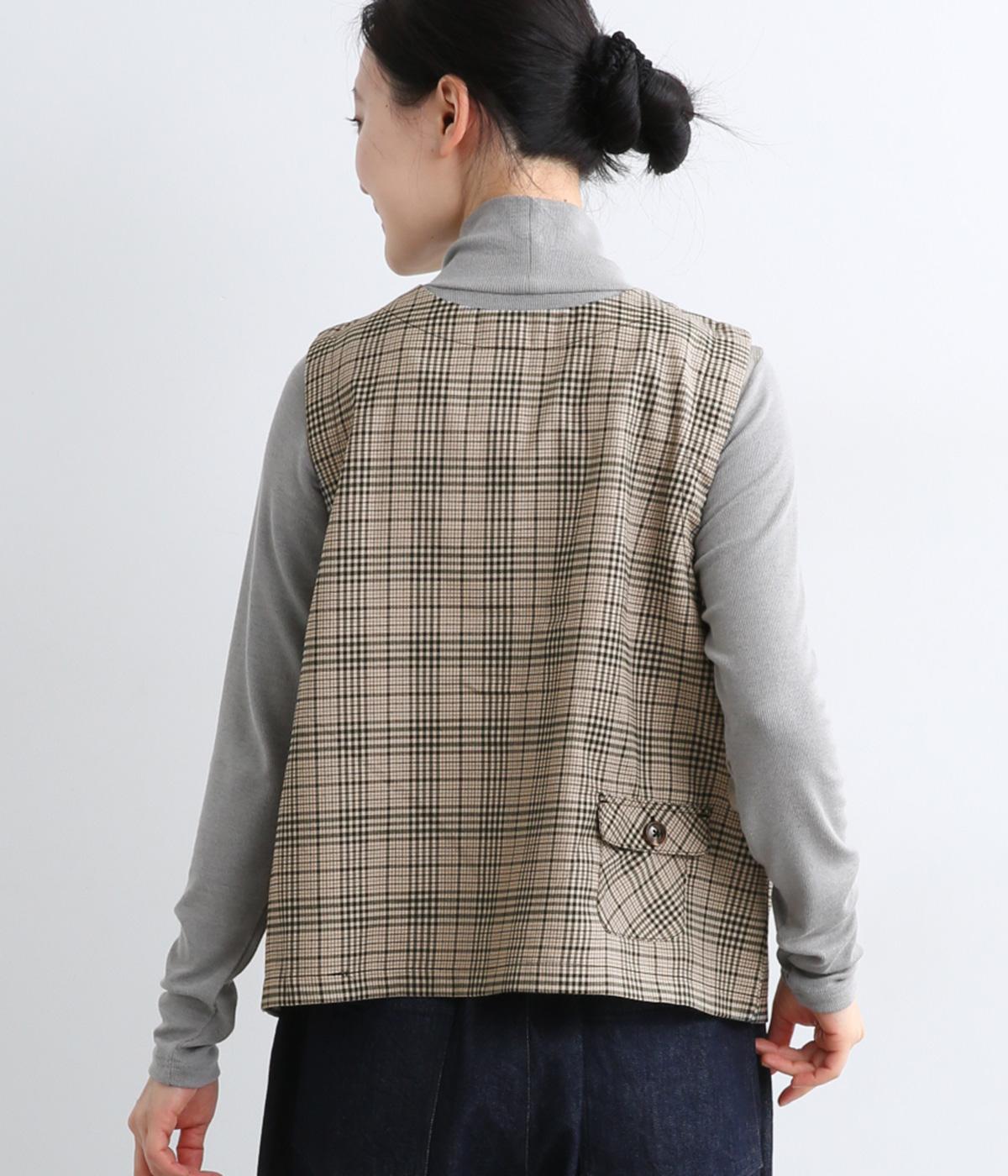 上の方にボタンを3つつけた面と、左裾に小さなフラップポケットを配した面のどちらを前にしてもたのしめる2way仕様です。ニットなどやや厚みのあるトップスの上からも着やすいゆったりとした身幅が◎。クラシカルなグレンチェック柄が、着こなしに上品さと華やかさをプラスしてくれます。