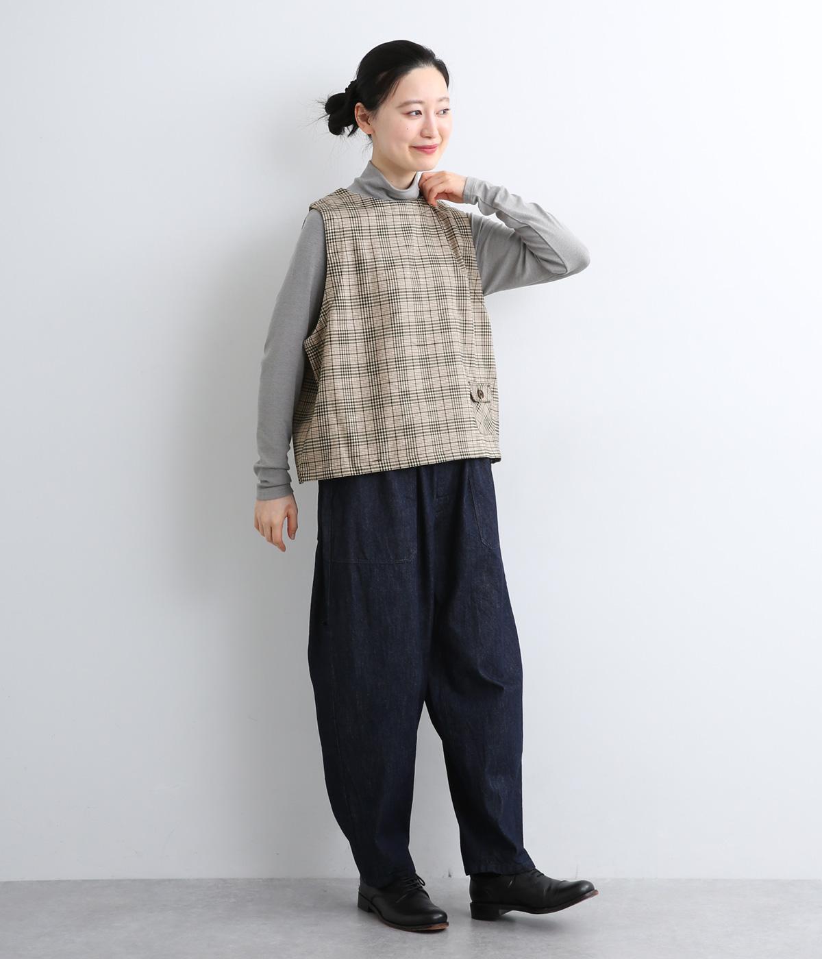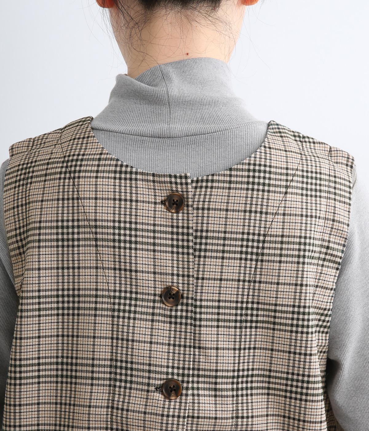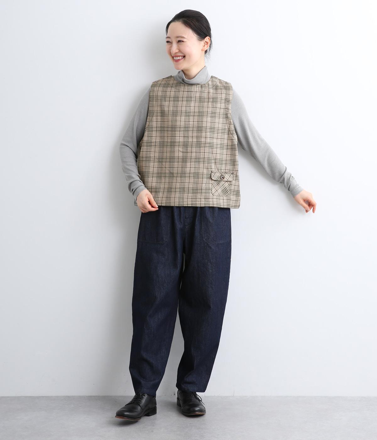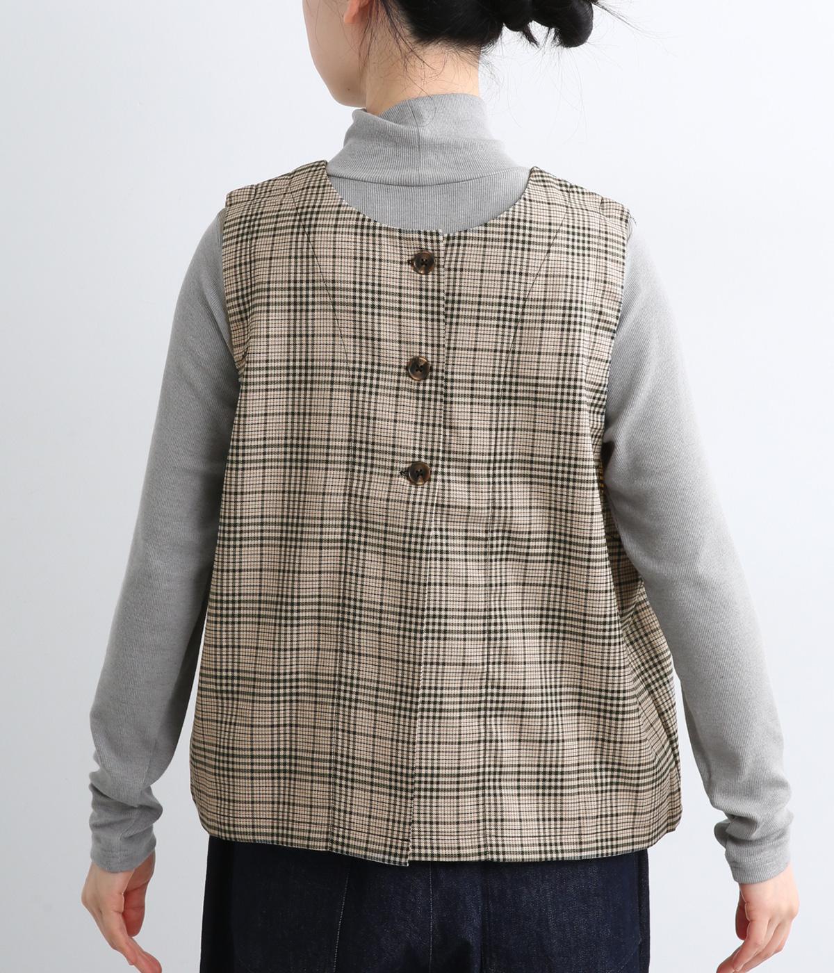 上の方にボタンを3つつけた面と、左裾に小さなフラップポケットを配した面のどちらを前にしてもたのしめる2way仕様です。ニットなどやや厚みのあるトップスの上からも着やすいゆったりとした身幅が◎。クラシカルなグレンチェック柄が、着こなしに上品さと華やかさをプラスしてくれます。