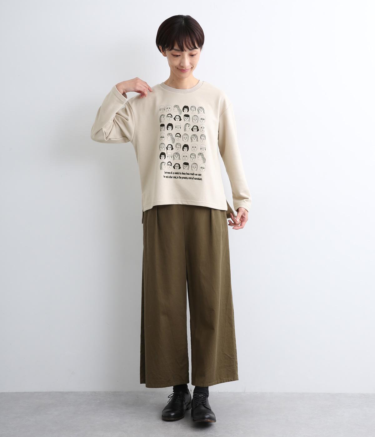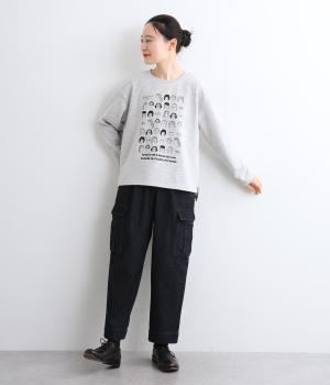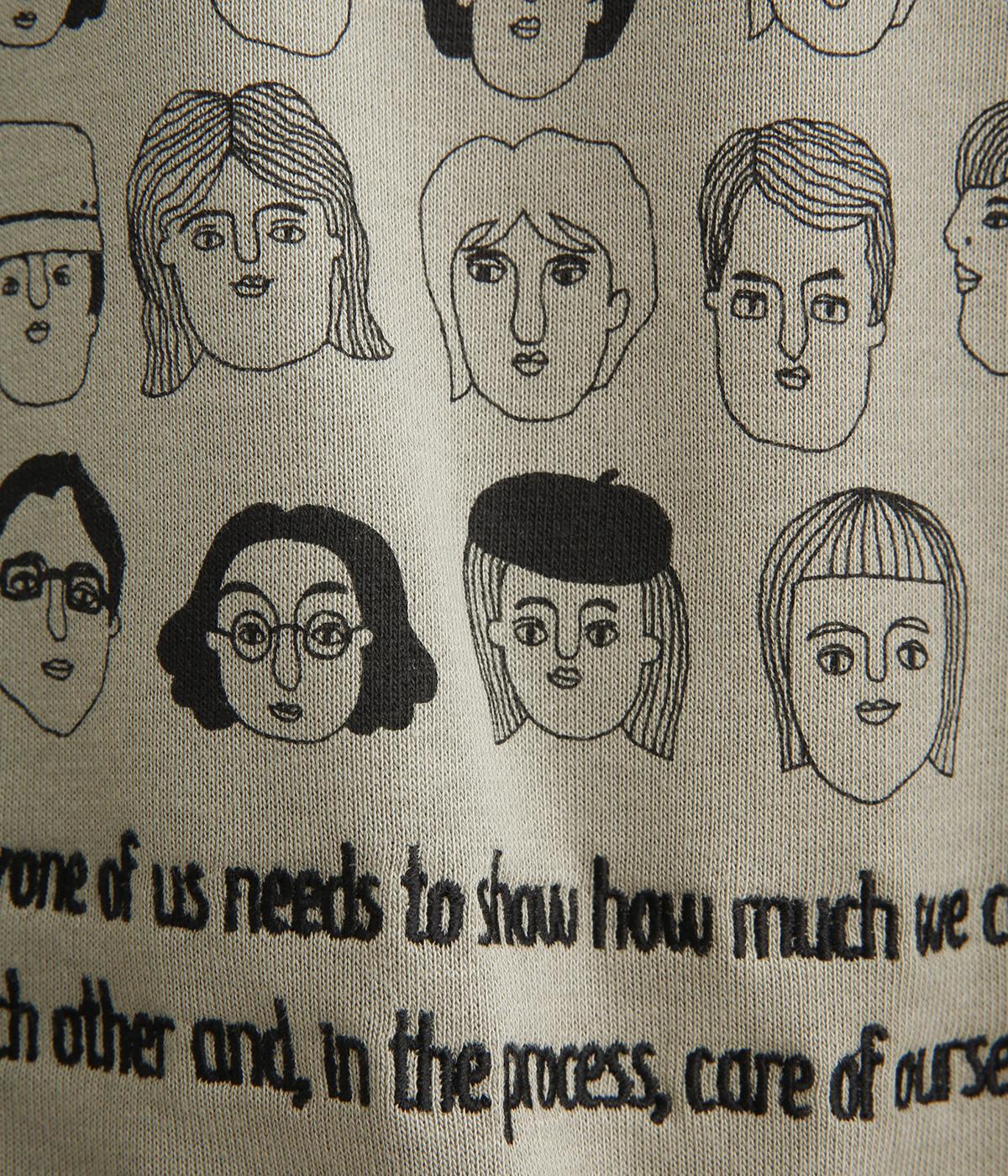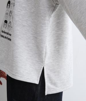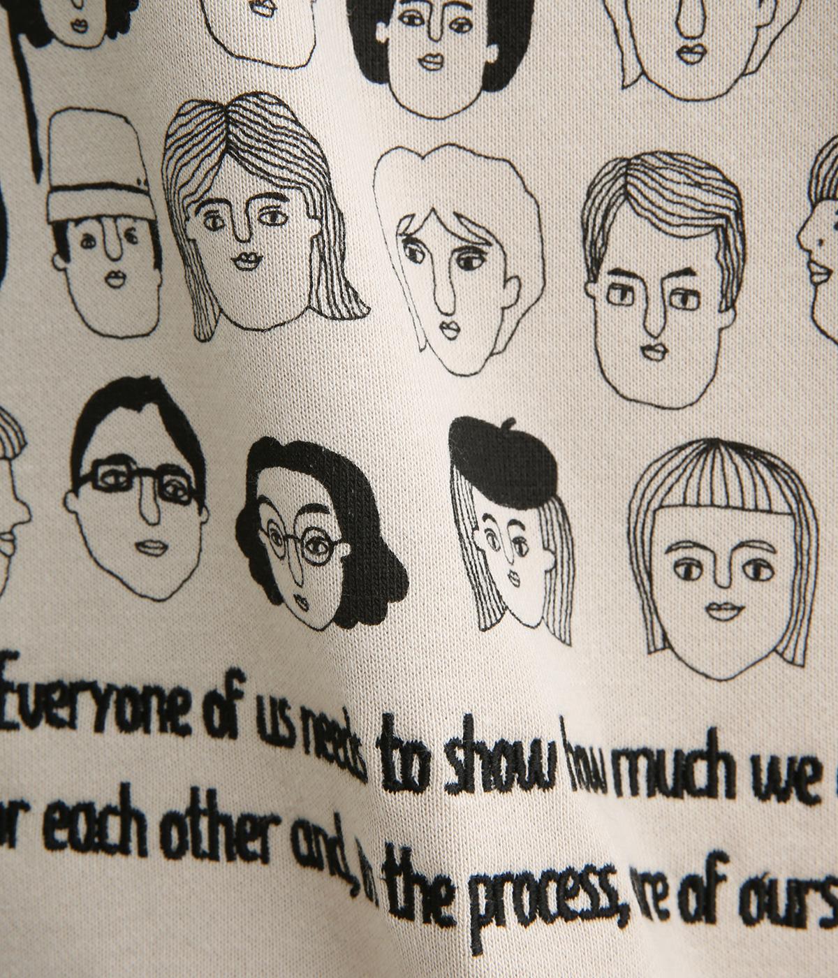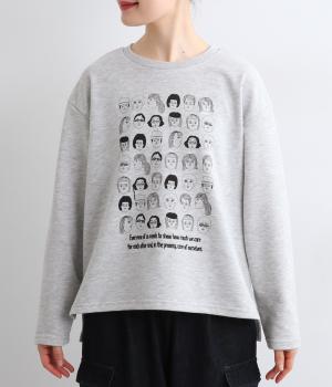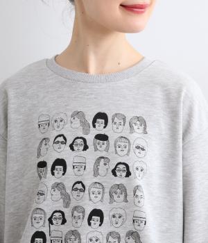 個性豊かなお顔がたくさん並んだユニークなイラストが主役。文字の部分は刺しゅうで表現して奥行きを持たせました。やや肩位置を落としたゆとりのあるシルエットがこなれたムードをプラス。前後差をつけた着丈とサイドスリットが横姿も美しく演出してくれます。