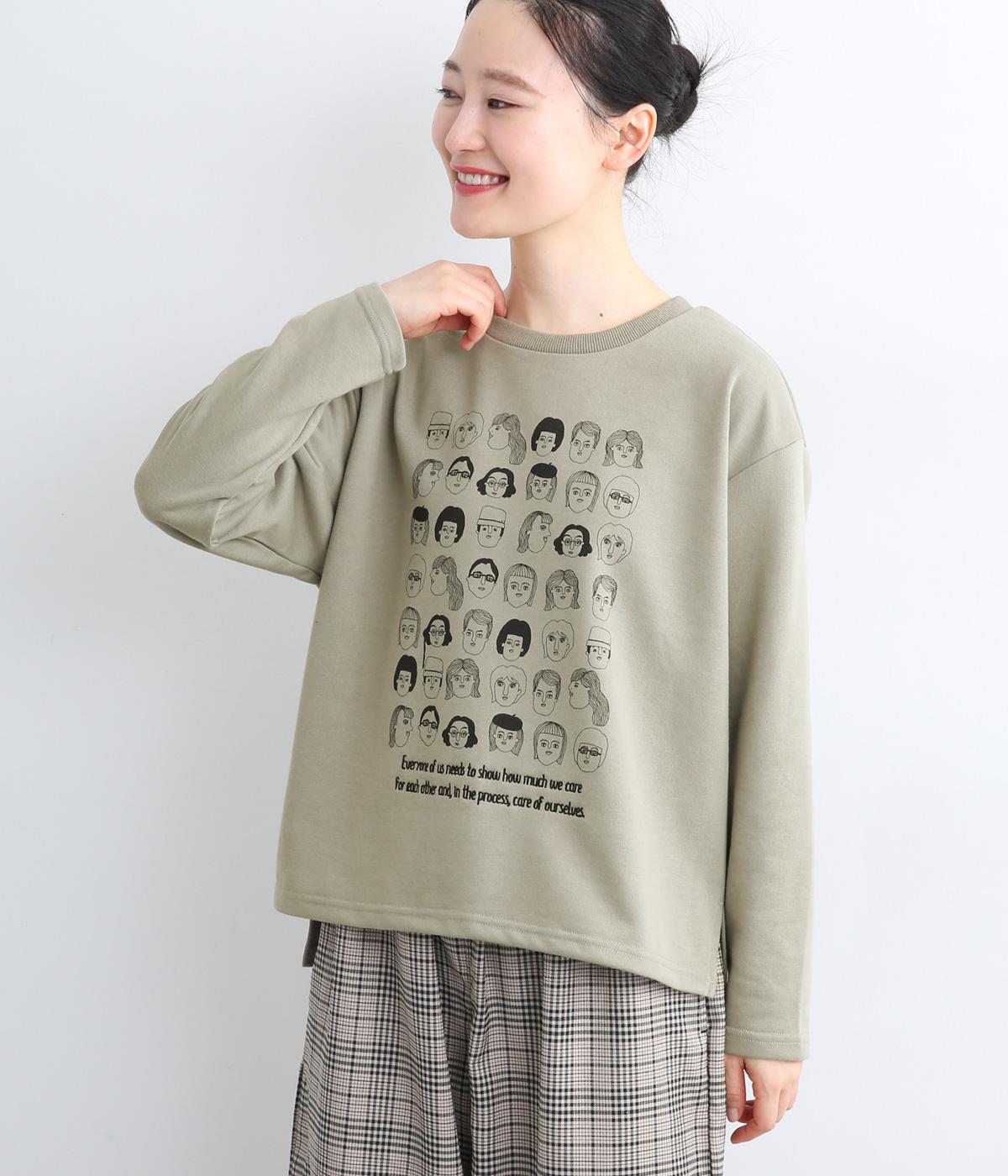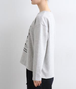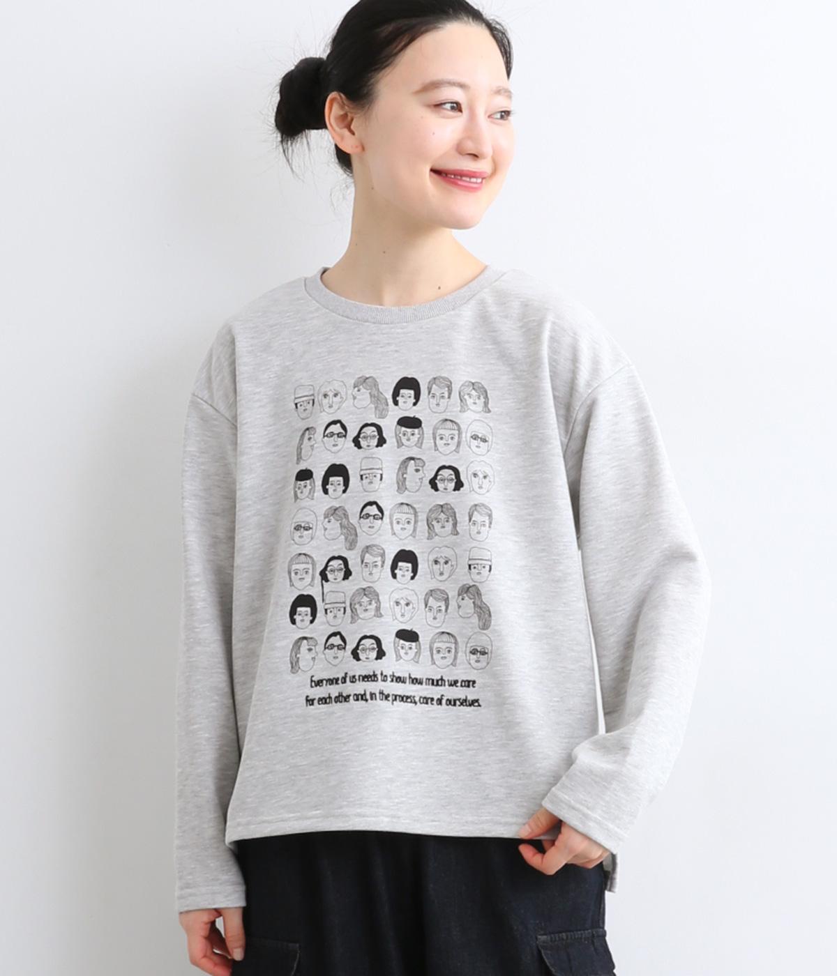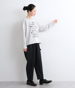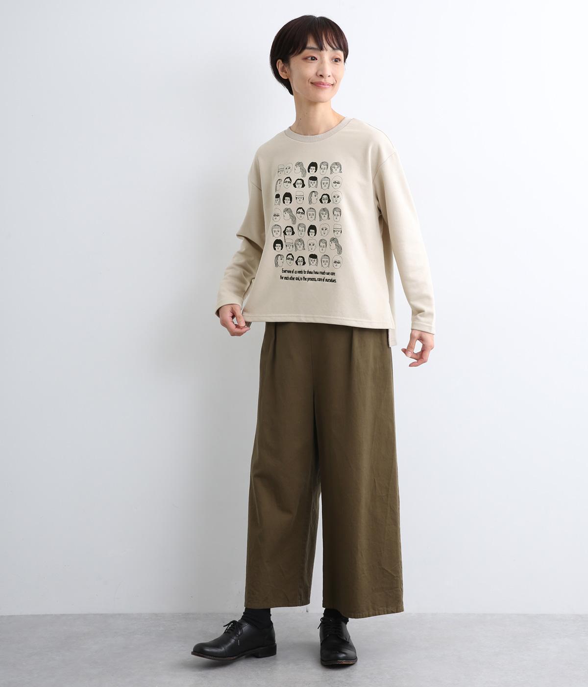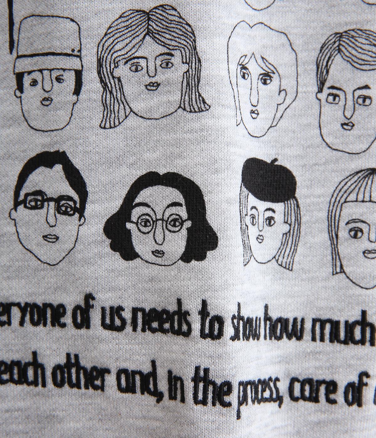 個性豊かなお顔がたくさん並んだユニークなイラストが主役。文字の部分は刺しゅうで表現して奥行きを持たせました。やや肩位置を落としたゆとりのあるシルエットがこなれたムードをプラス。前後差をつけた着丈とサイドスリットが横姿も美しく演出してくれます。