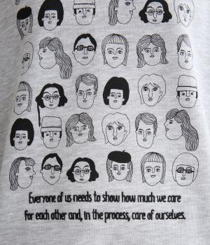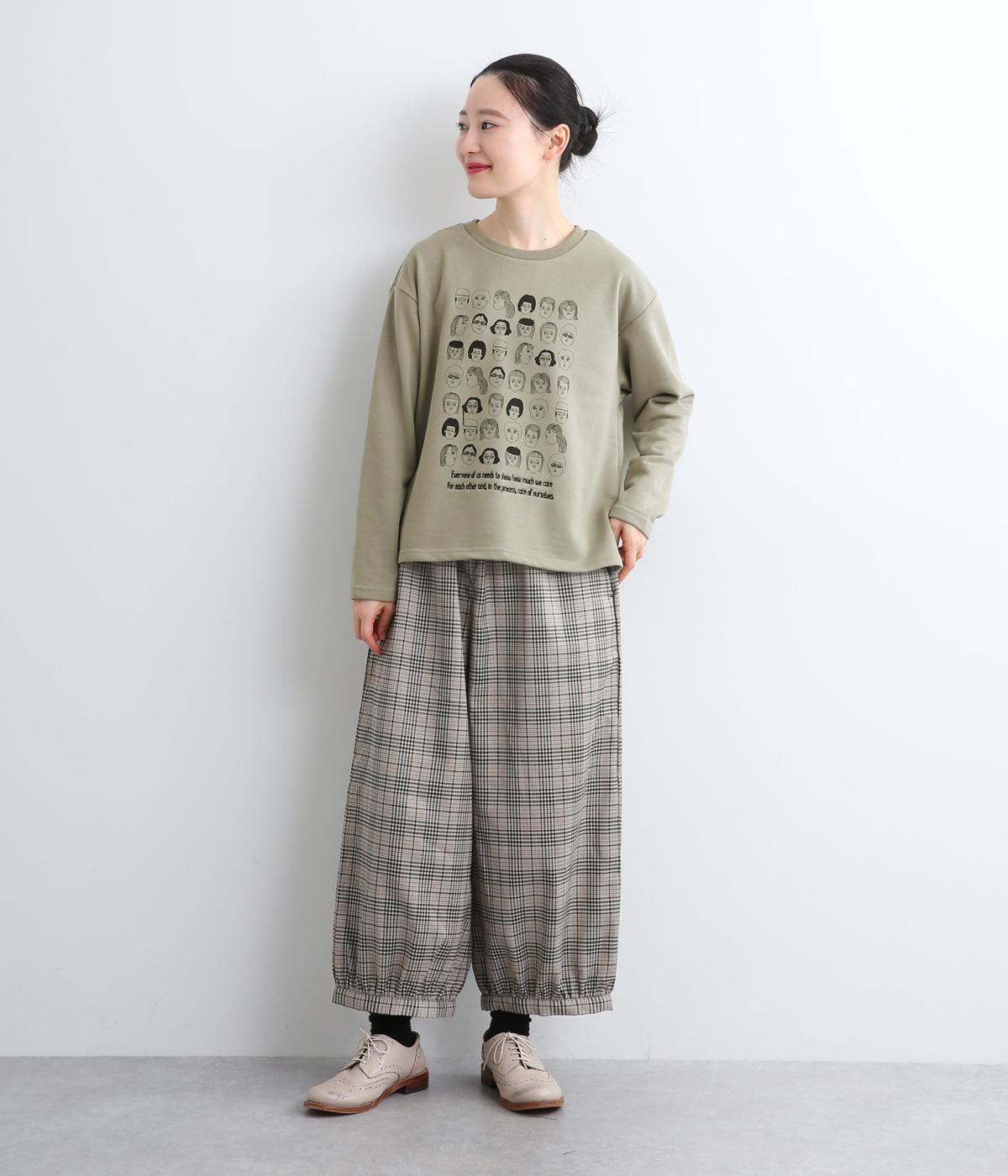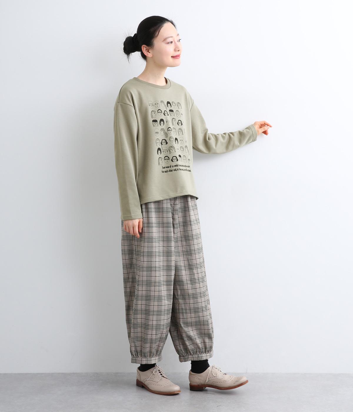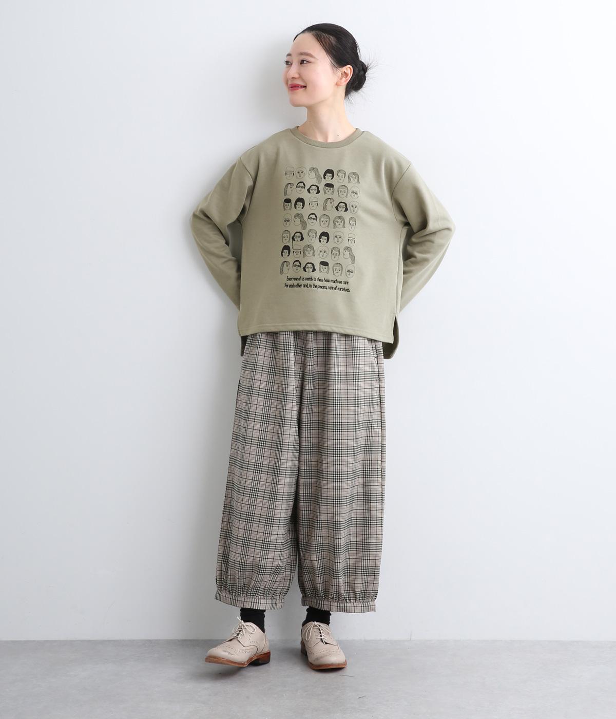 個性豊かなお顔がたくさん並んだユニークなイラストが主役。文字の部分は刺しゅうで表現して奥行きを持たせました。やや肩位置を落としたゆとりのあるシルエットがこなれたムードをプラス。前後差をつけた着丈とサイドスリットが横姿も美しく演出してくれます。