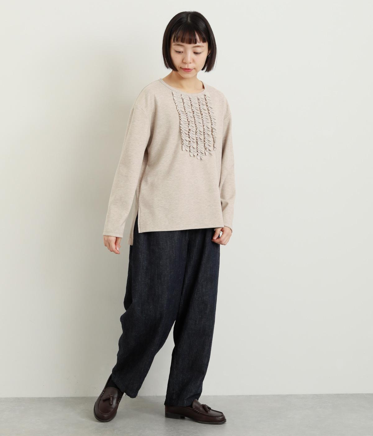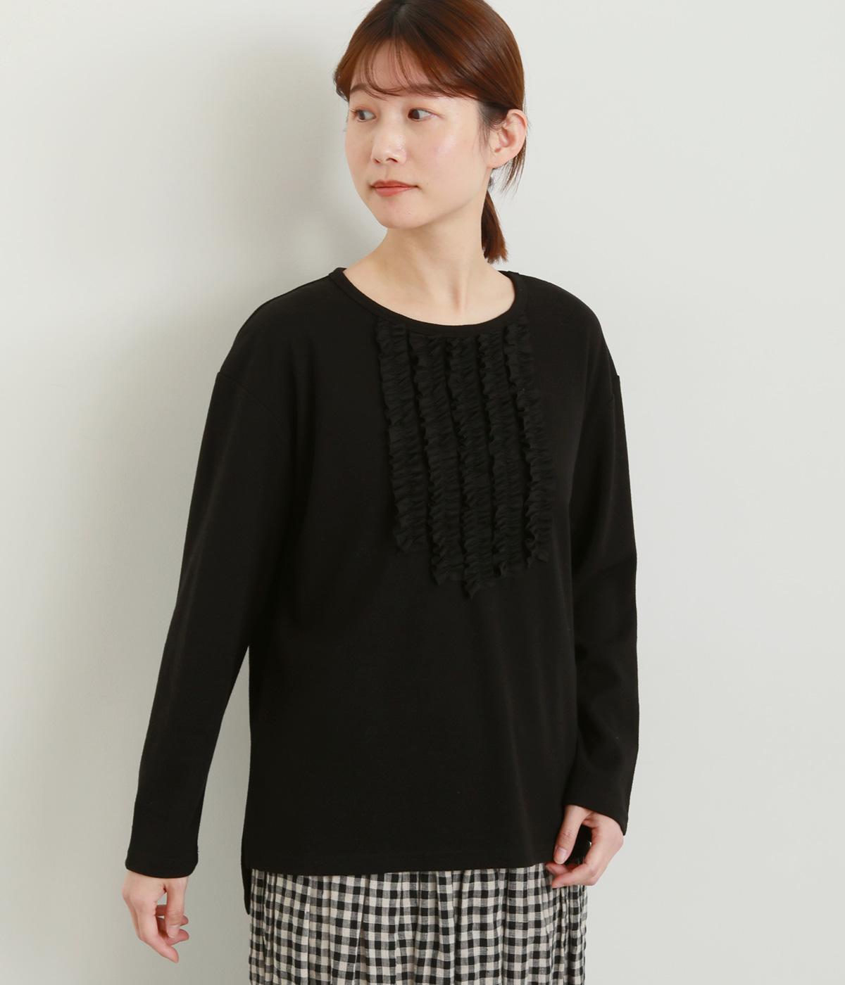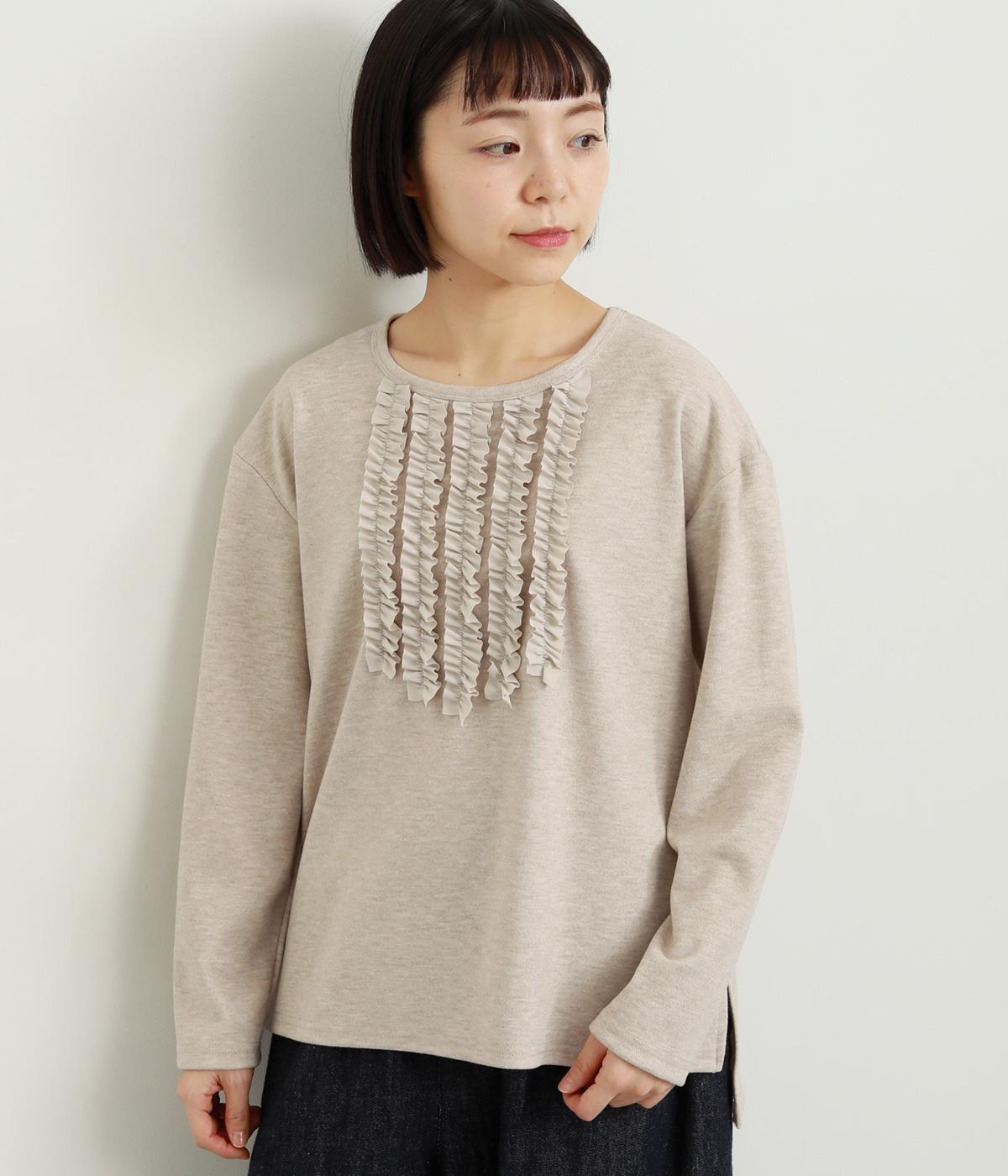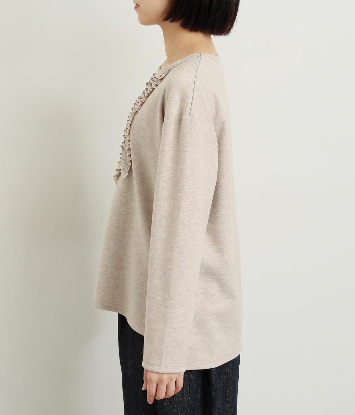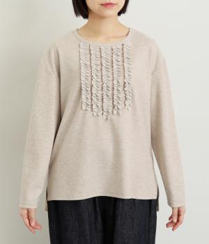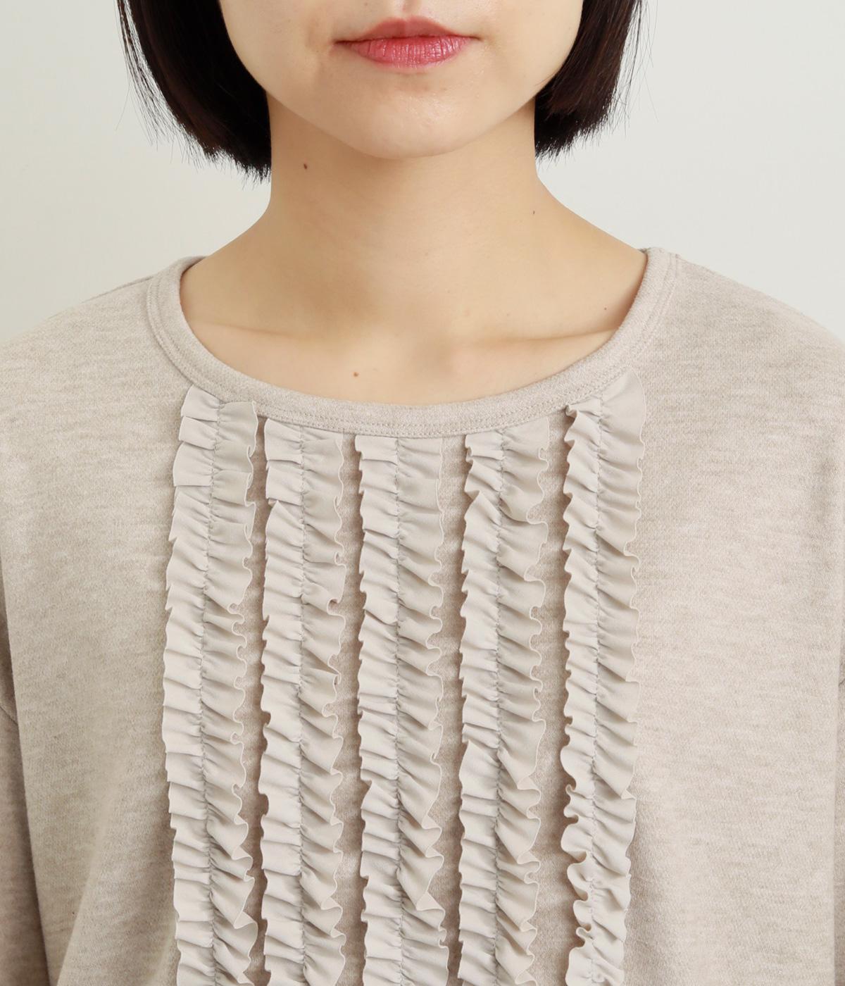 胸元に重ねた立体的なフリルが、装いを明るく見せるプルオーバー。ほどよいゆとりのシルエットが、リラックス感のある着心地を実現します。前後差のある裾とサイドスリットが、着るだけでこなれ感をプラス。どんなボトムともバランスよくまとまる、華やかな一枚です。