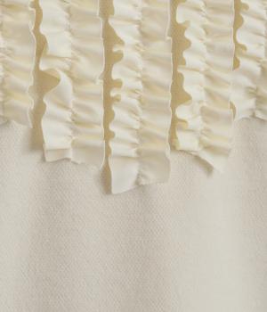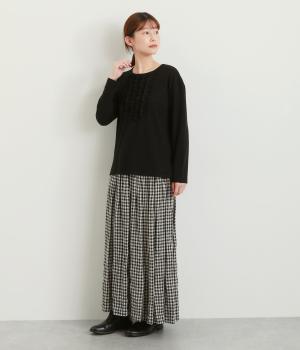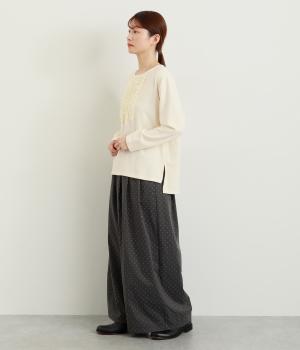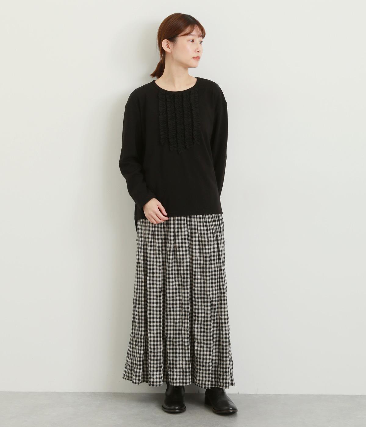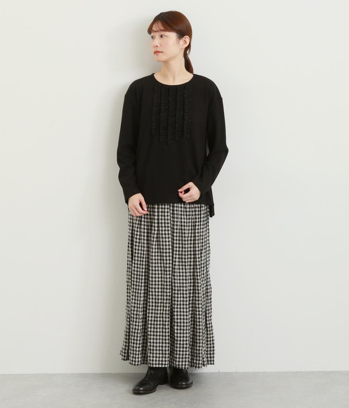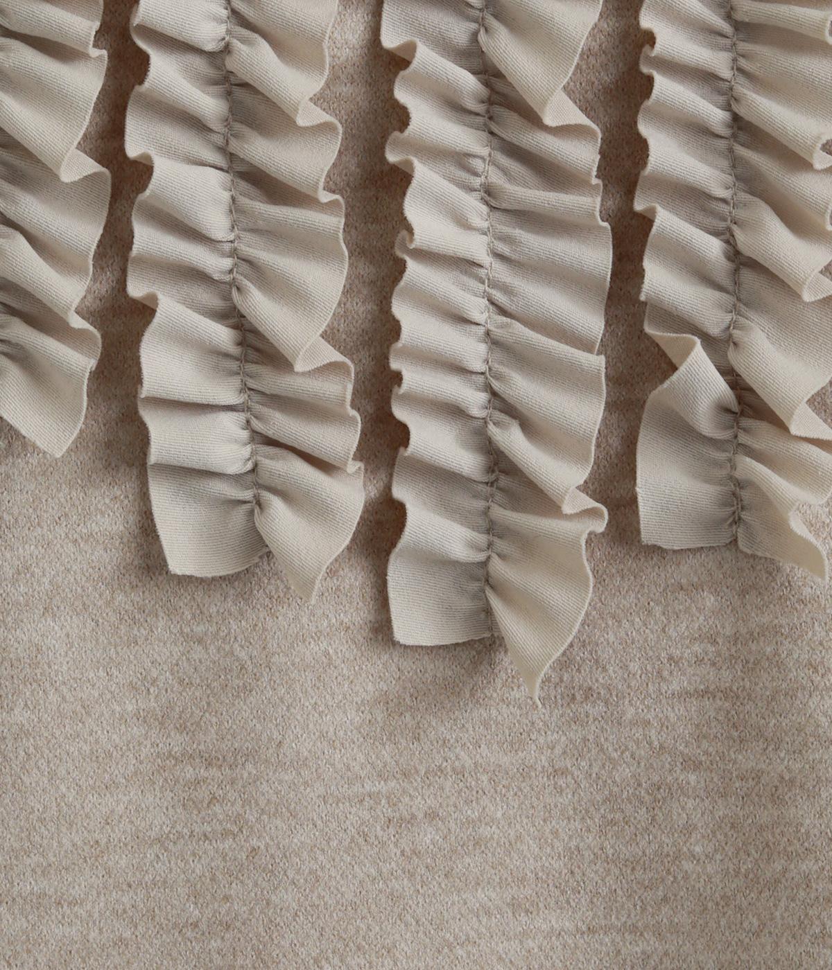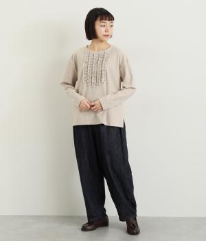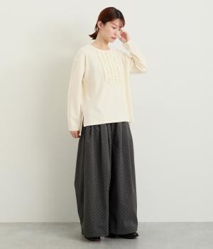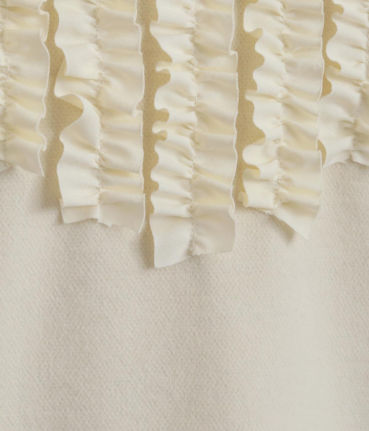 胸元に重ねた立体的なフリルが、装いを明るく見せるプルオーバー。ほどよいゆとりのシルエットが、リラックス感のある着心地を実現します。前後差のある裾とサイドスリットが、着るだけでこなれ感をプラス。どんなボトムともバランスよくまとまる、華やかな一枚です。