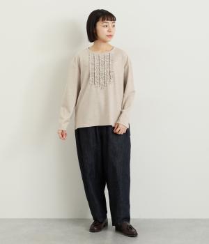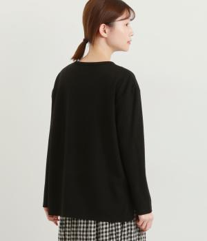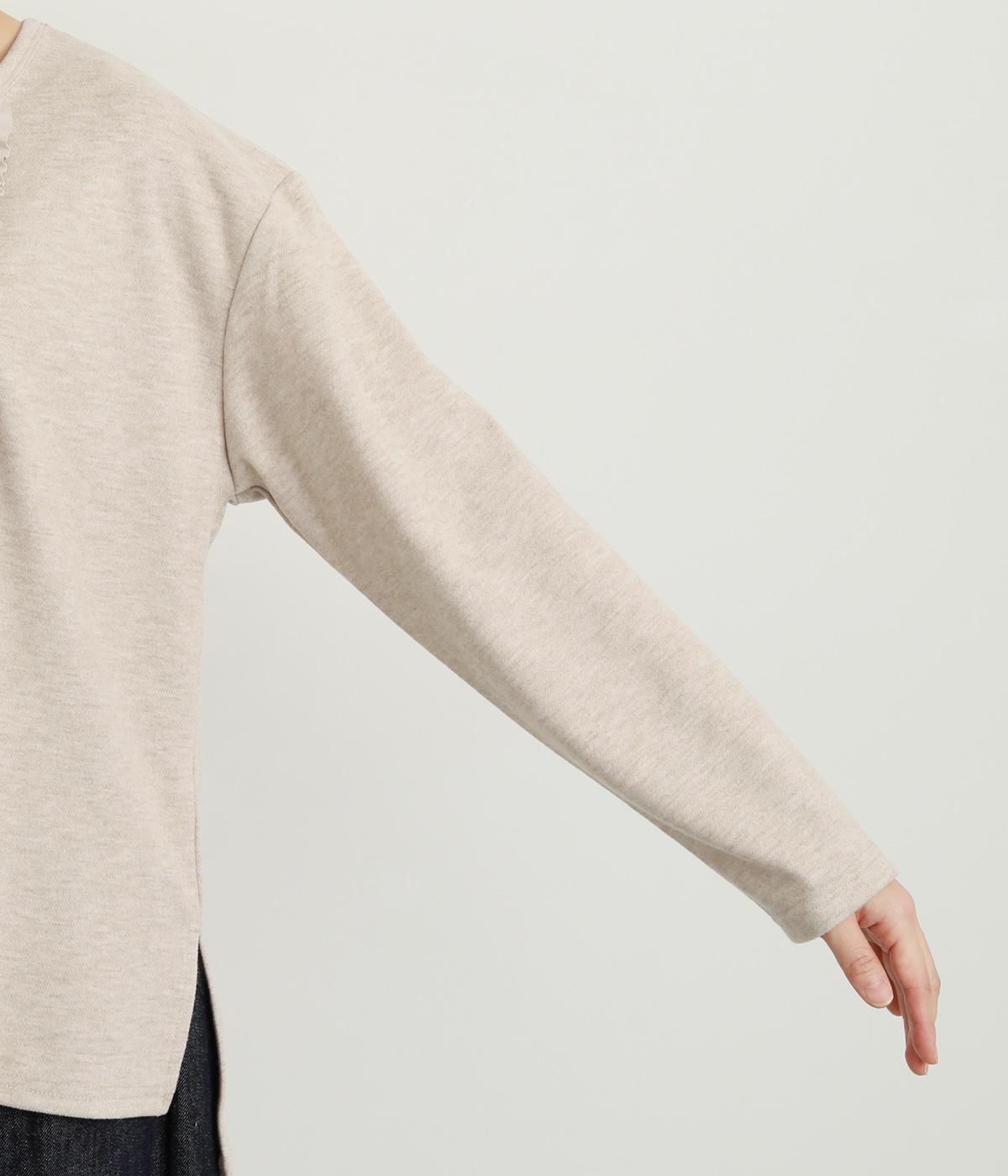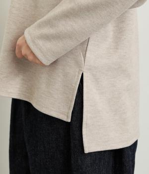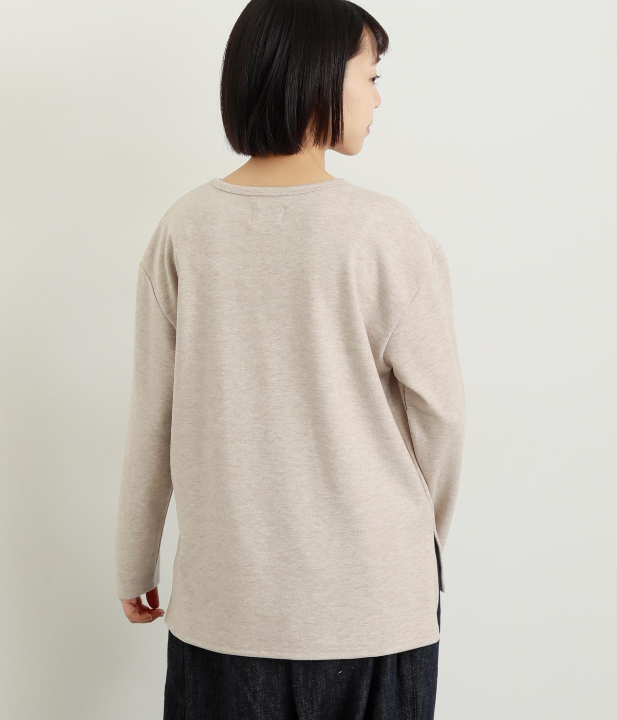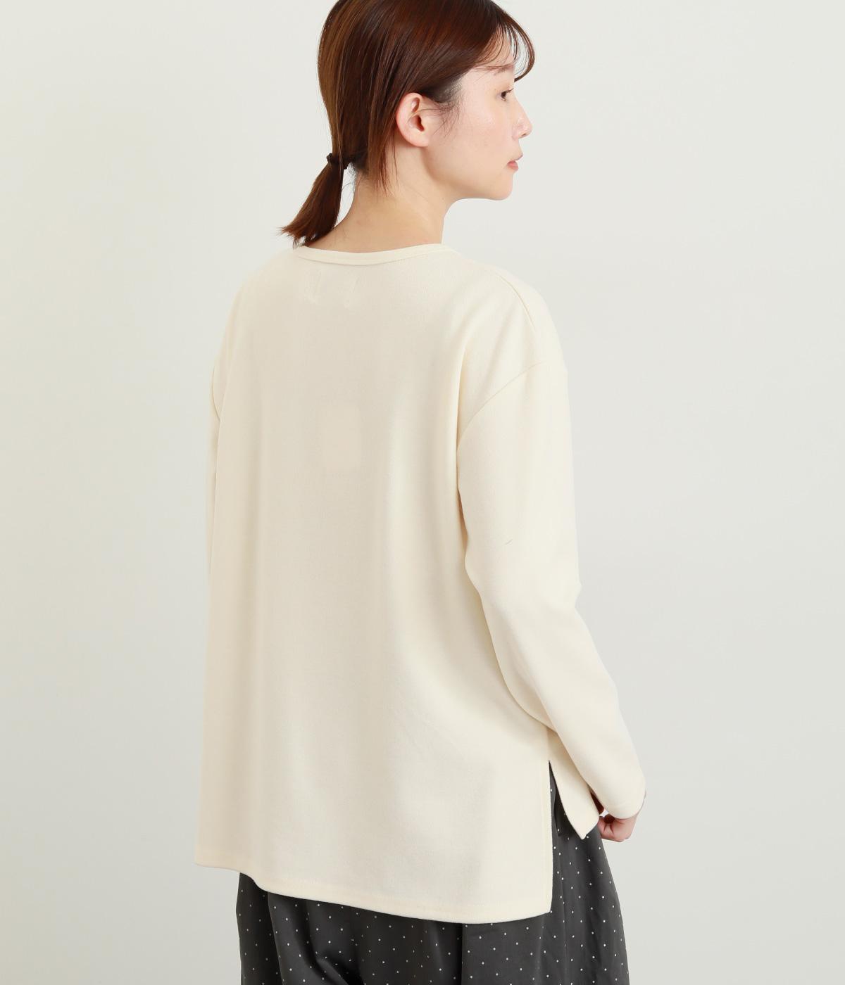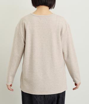 表面はほんのりと起毛し、ふわりとやわらかなタッチが魅力の生地。裏面はさらりとした編み立てで、心地よく快適な風合いです。伸びがよく、シワになりにくいのもうれしいポイントです。