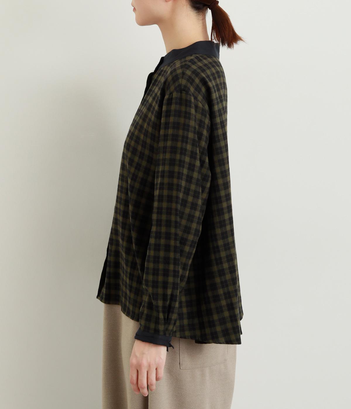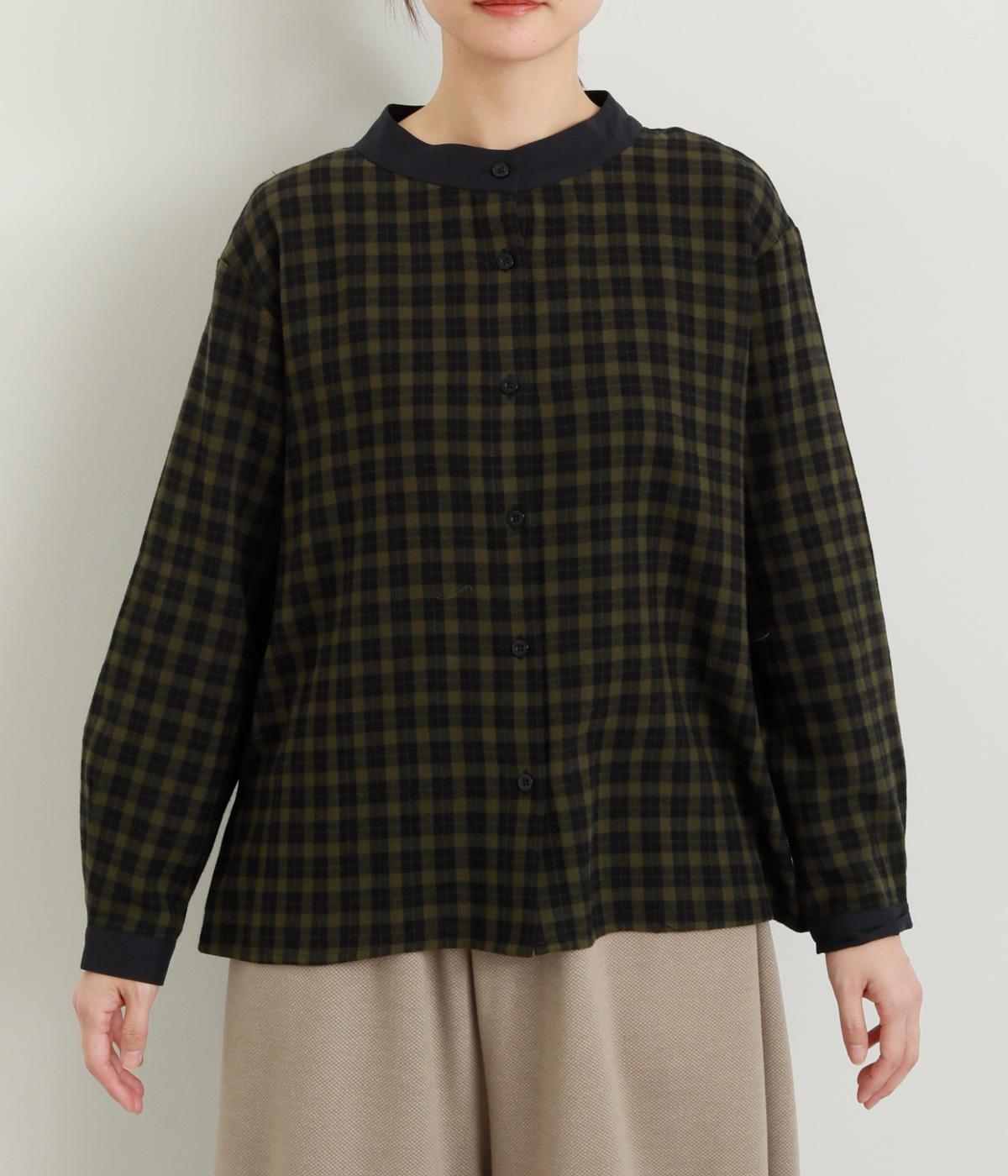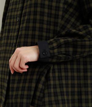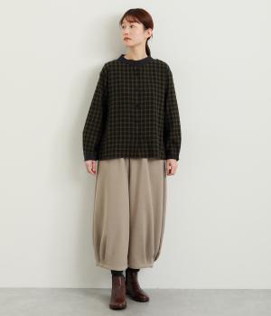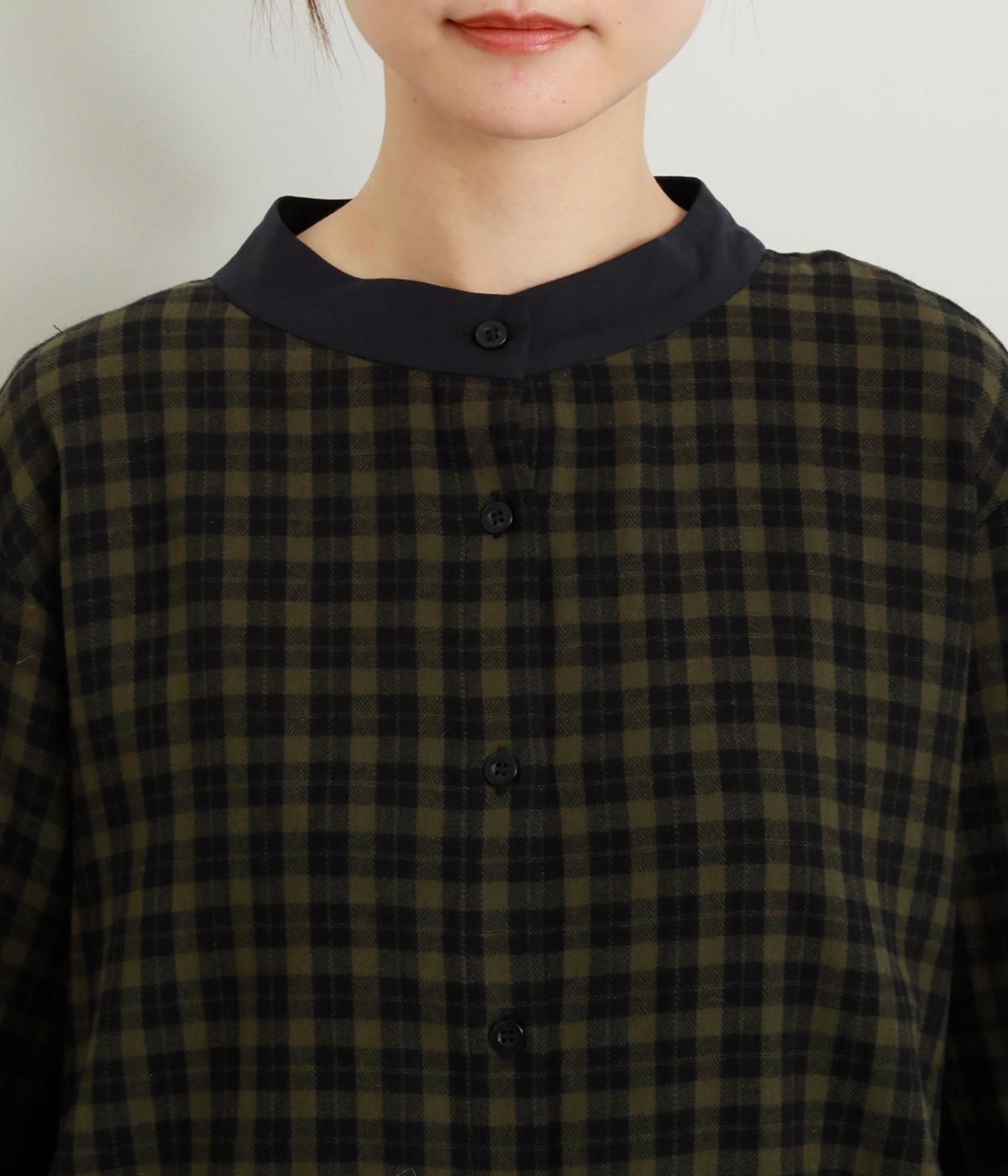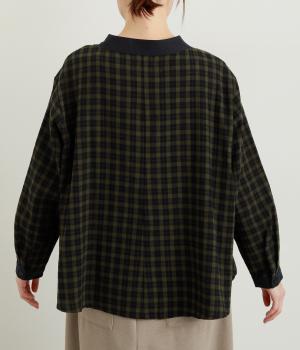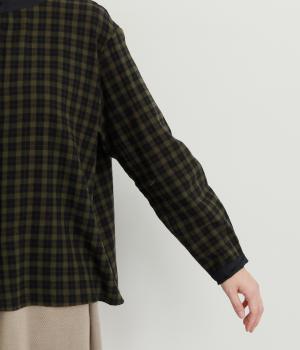 ナチュラルなチェック柄が、大人のかわいらしさを引き立てるブラウスです。ほどよく首から離れたちびハイネックが、上品な抜け感をプラス。襟と袖口にあしらった配色がさり気ないアクセントになり、表情のある仕上がりに。後ろ身頃はゆるやかに広がるフレアシルエットで、動くたびにきれいな立体感が生まれます。