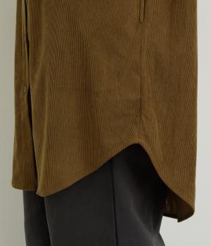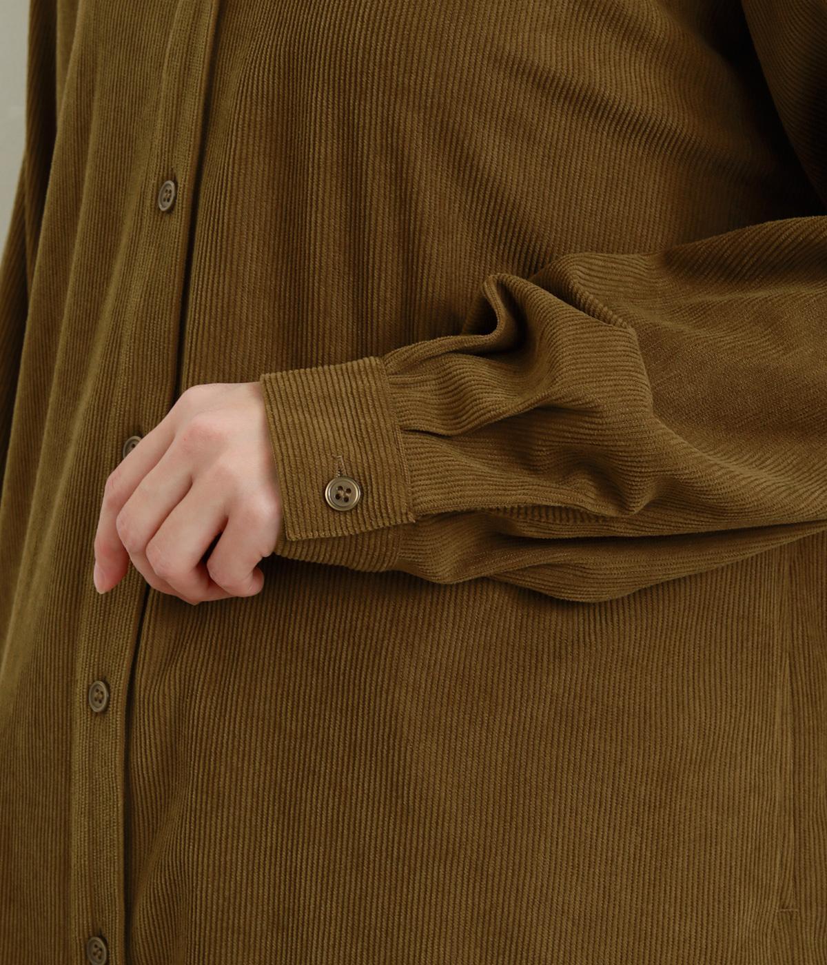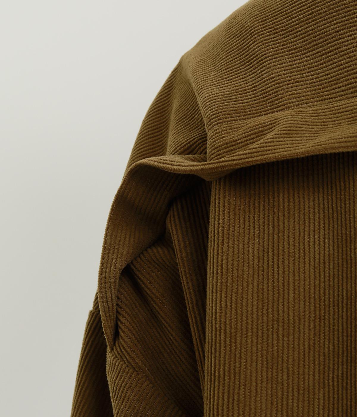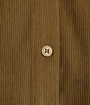 ほどよい太さの畝がやわらかい表情をつくる、薄手のコーデュロイ生地を使用しました。裏側は肌ばなれのよいつるりとした仕上がりで、軽やかに着用できる質感です。