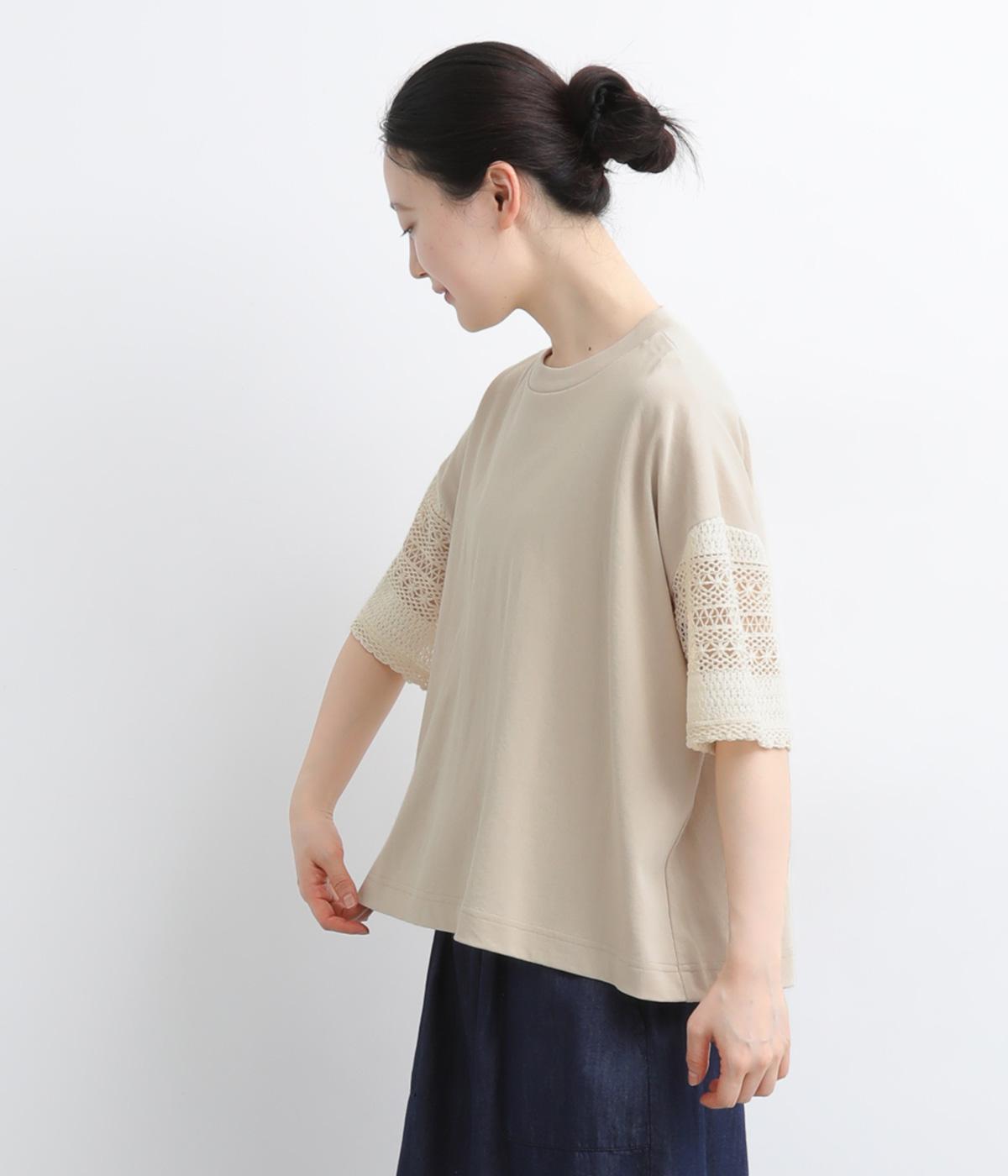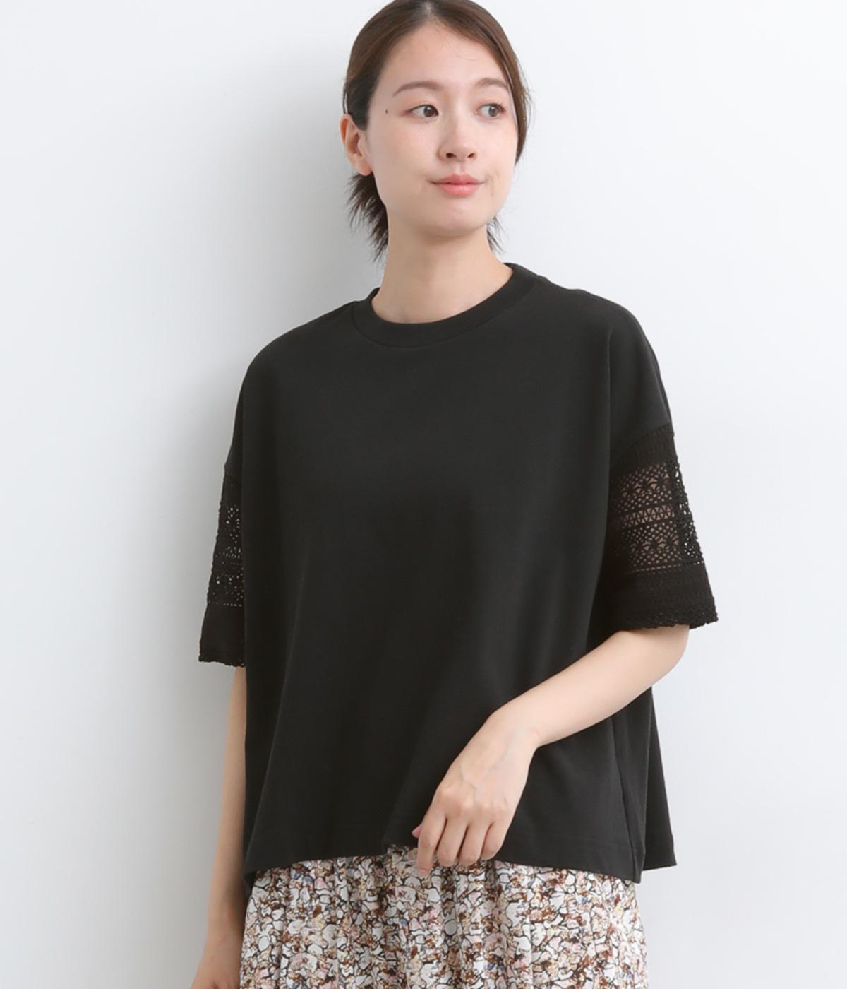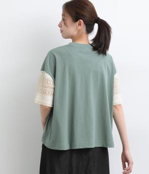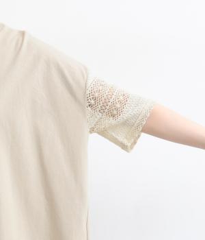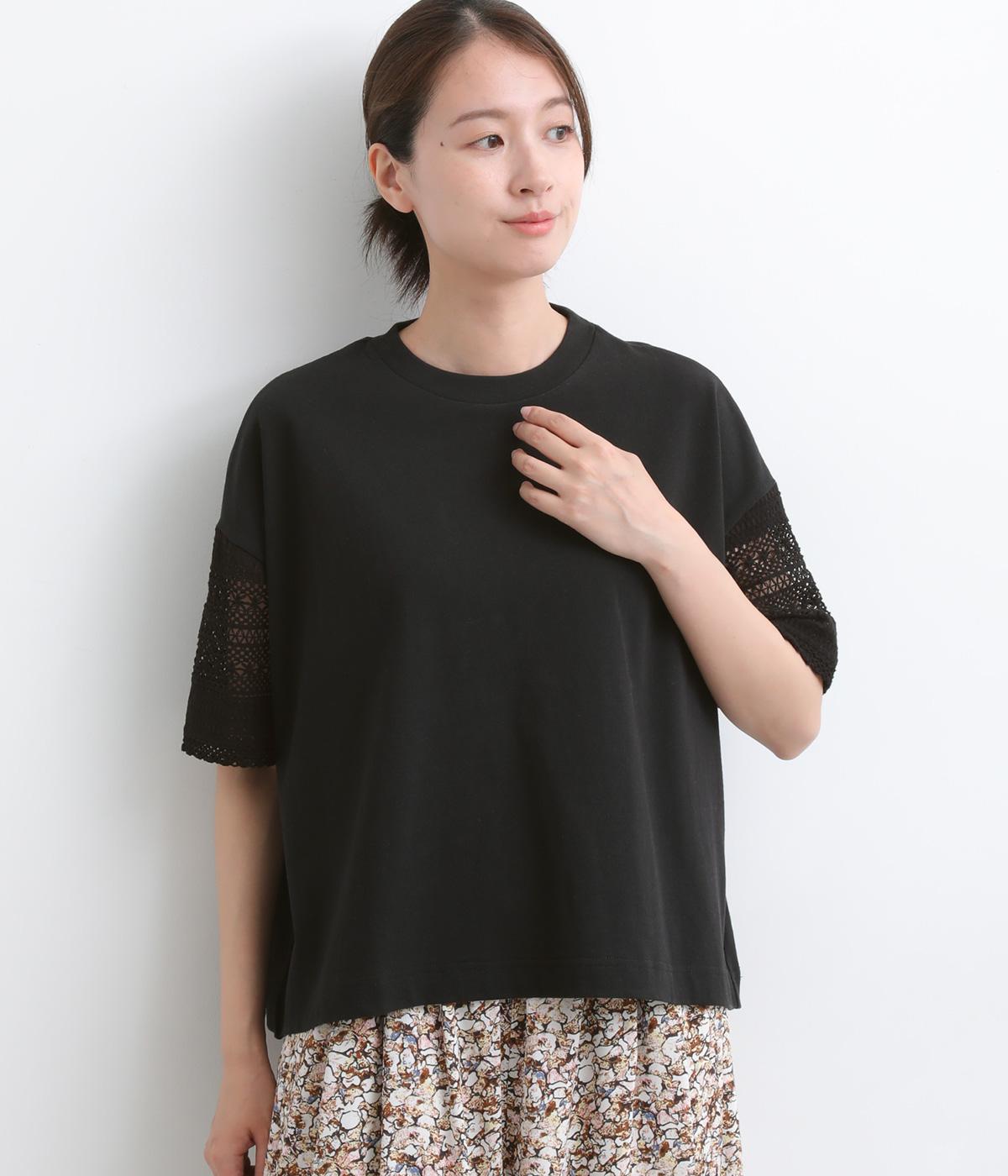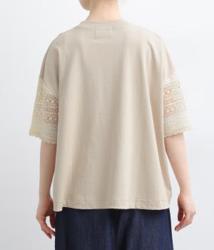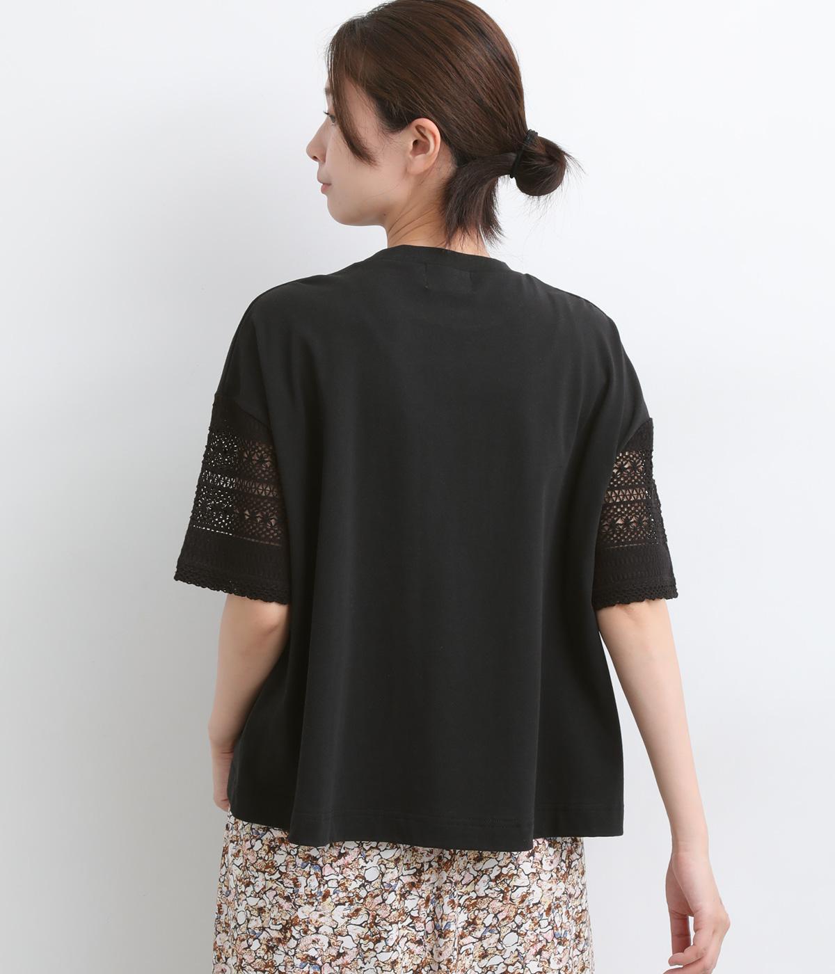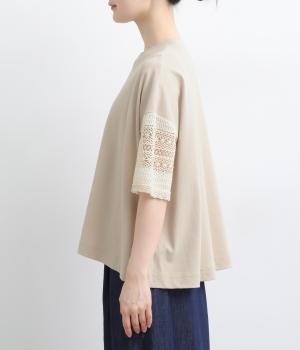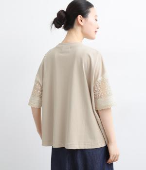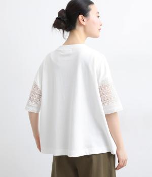 Tシャツらしいラフな着心地ながらコーディネートのポイントになる袖レースデザインを採用。後ろ裾を長めにしたゆるめのAラインが自然なドレープを生み、立体感のあるシルエットに。レース部分が透けて涼し気な抜け感を演出。