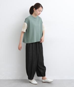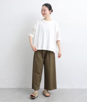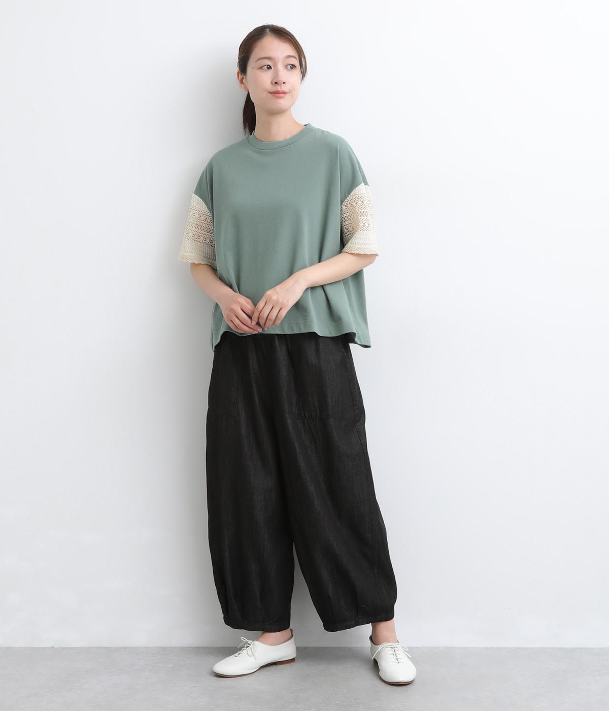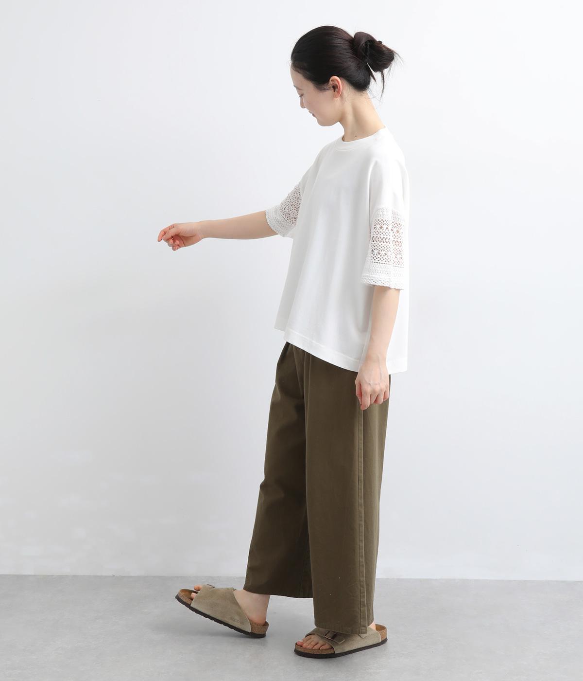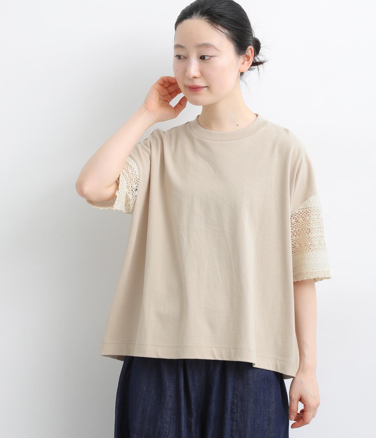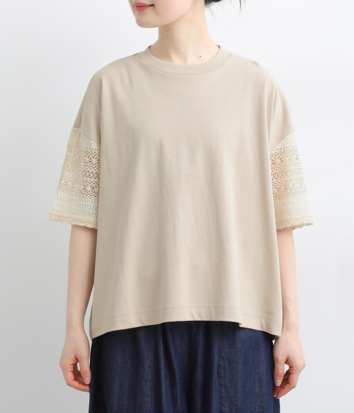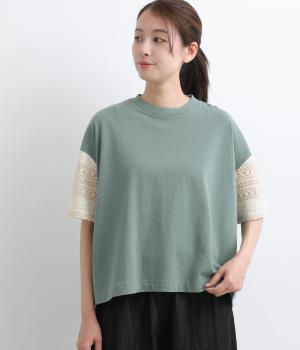Tシャツらしいラフな着心地ながらコーディネートのポイントになる袖レースデザインを採用。後ろ裾を長めにしたゆるめのAラインが自然なドレープを生み、立体感のあるシルエットに。レース部分が透けて涼し気な抜け感を演出。