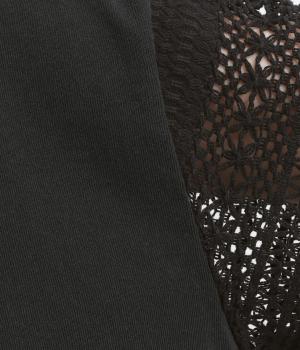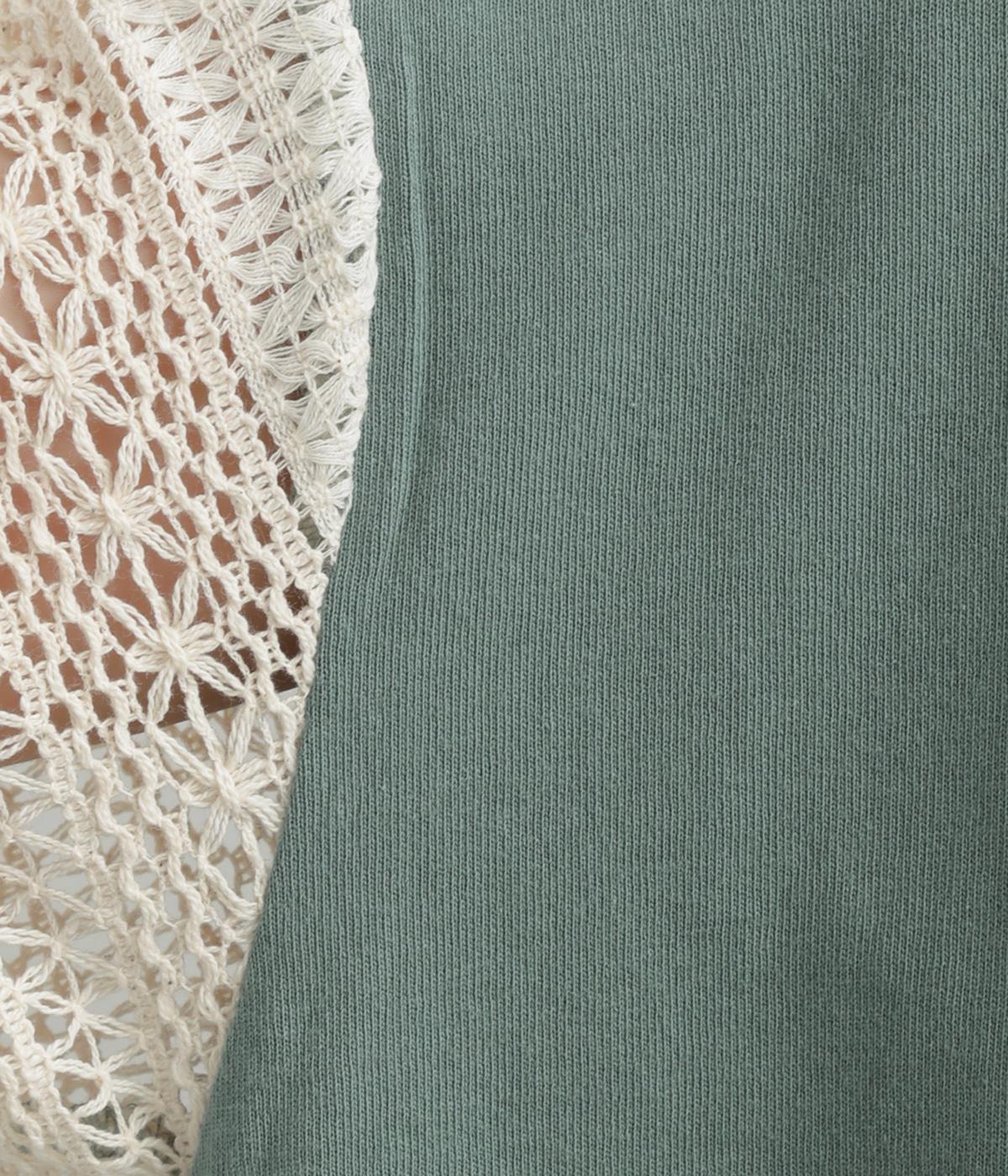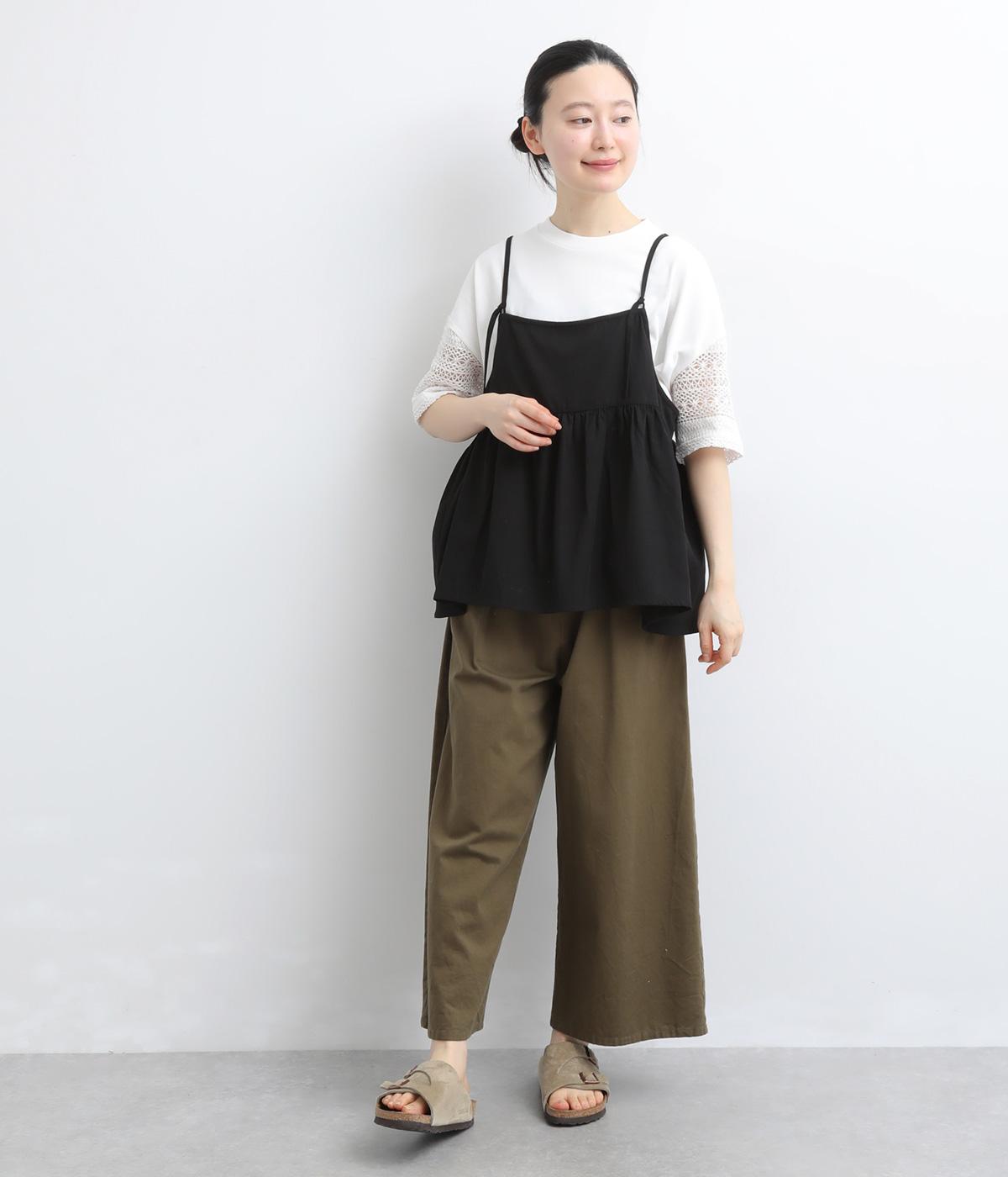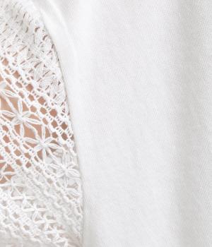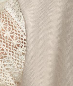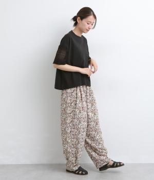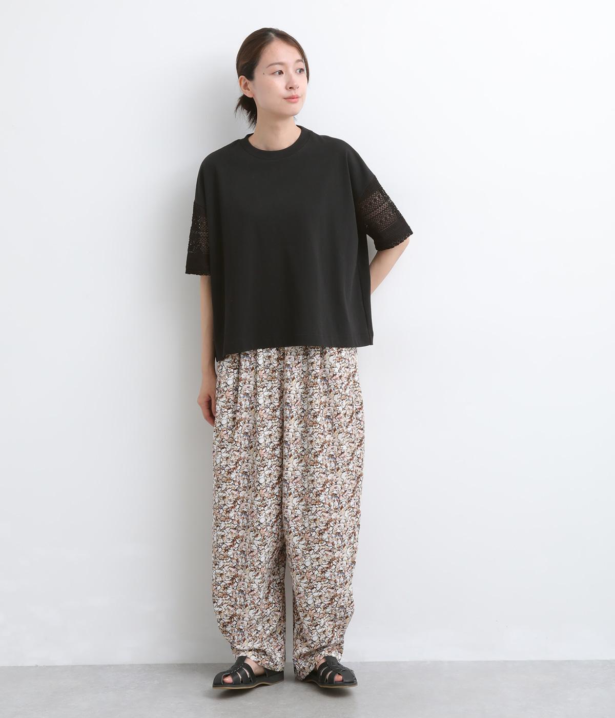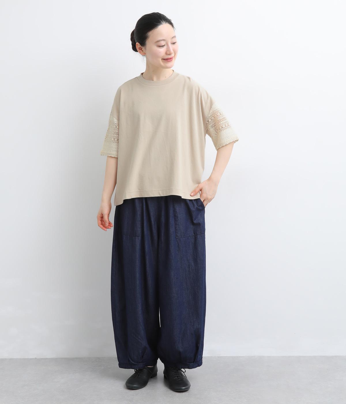 Tシャツらしいラフな着心地ながらコーディネートのポイントになる袖レースデザインを採用。後ろ裾を長めにしたゆるめのAラインが自然なドレープを生み、立体感のあるシルエットに。レース部分が透けて涼し気な抜け感を演出。