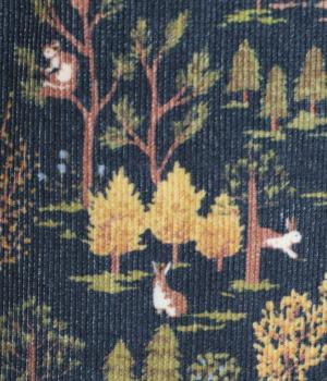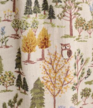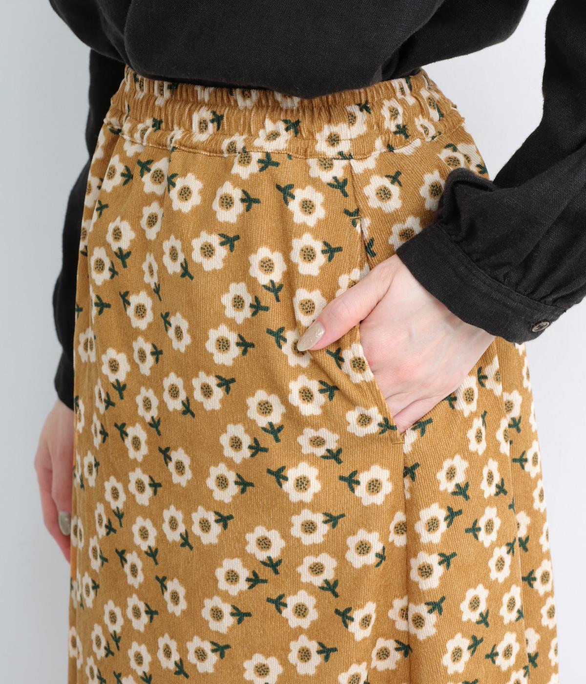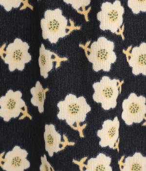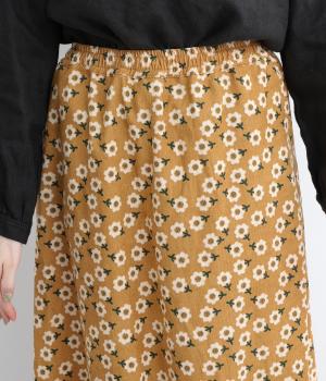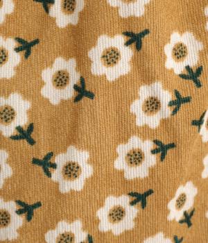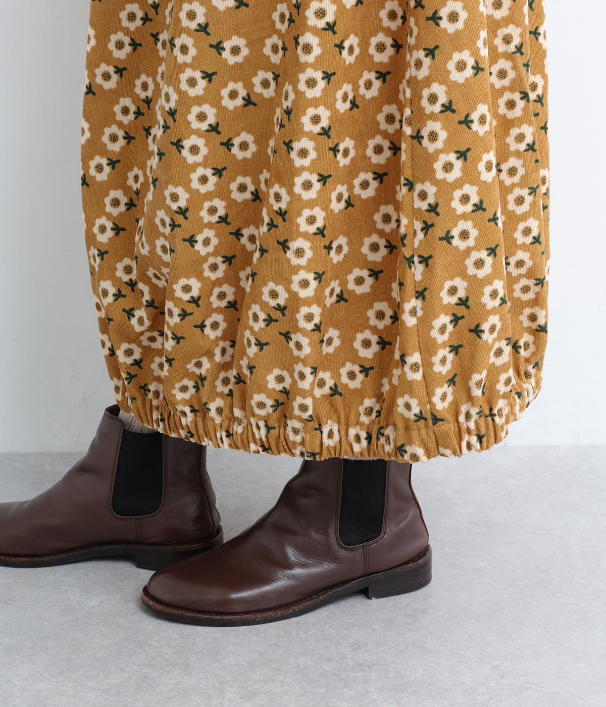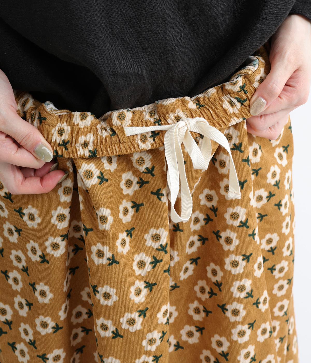 やわらかな肌触りと細畝が特徴的なコーデュロイ生地で仕立てました。あたたかみのある表情とにぎやかな総柄がポイントで、肉厚すぎずはきやすい仕上がりです。