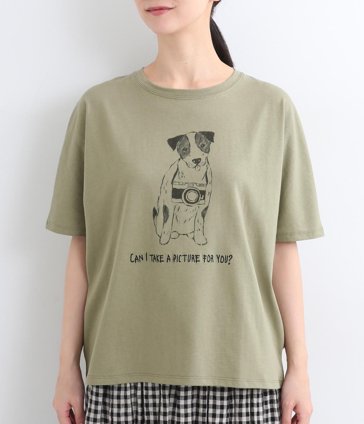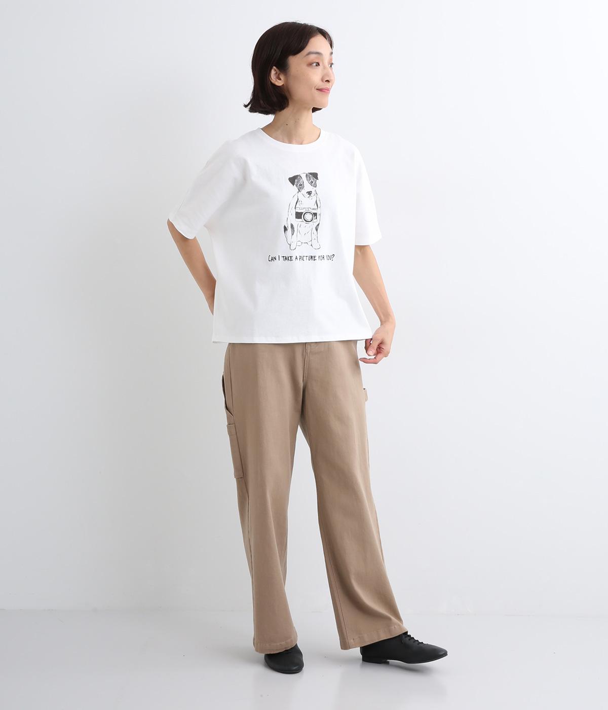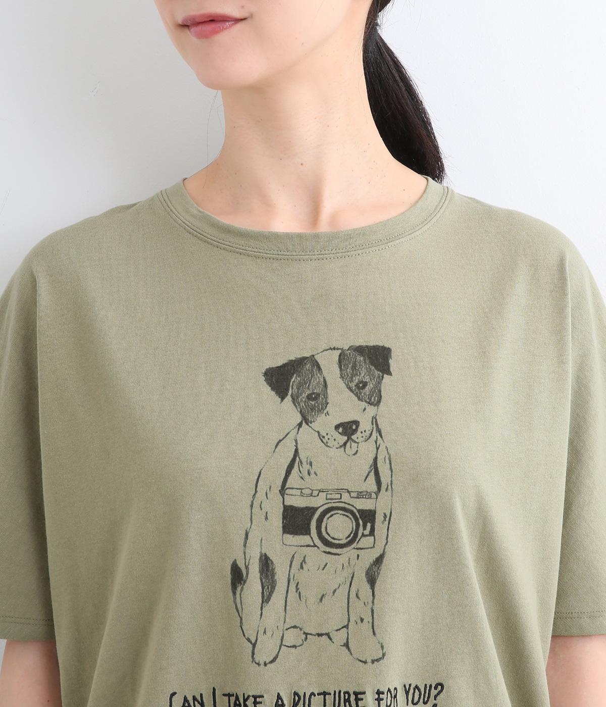 カメラをぶら下げたわんこプリントがあたたかみある表情のTシャツです。手書きのようなタッチのプリントがヴィンテージライク。身幅がゆったりしており、ドルマンスリーブになっているため、肌に寄り添うような優しい着心地です。