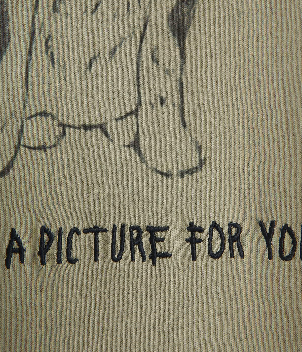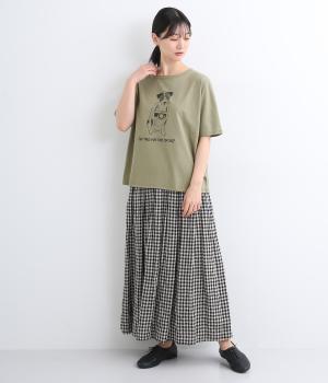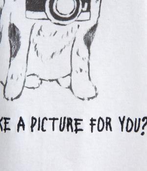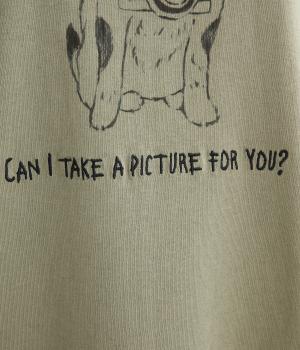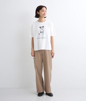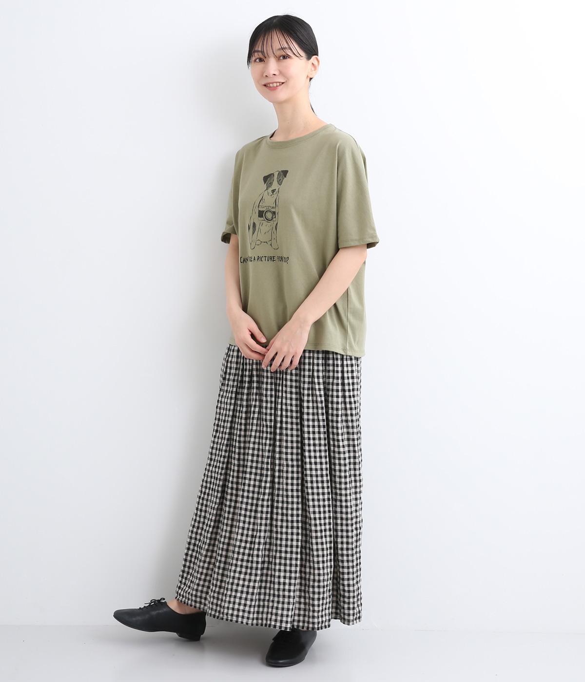 カメラをぶら下げたわんこプリントがあたたかみある表情のTシャツです。手書きのようなタッチのプリントがヴィンテージライク。身幅がゆったりしており、ドルマンスリーブになっているため、肌に寄り添うような優しい着心地です。