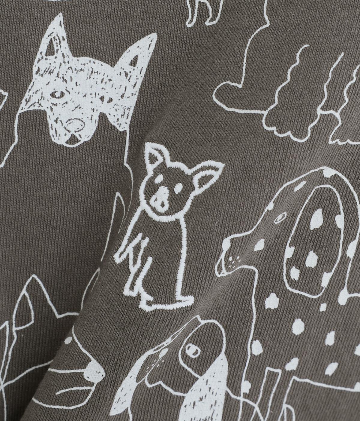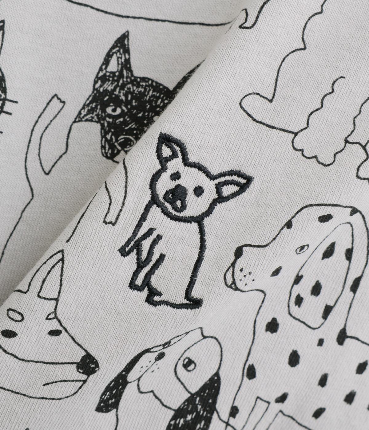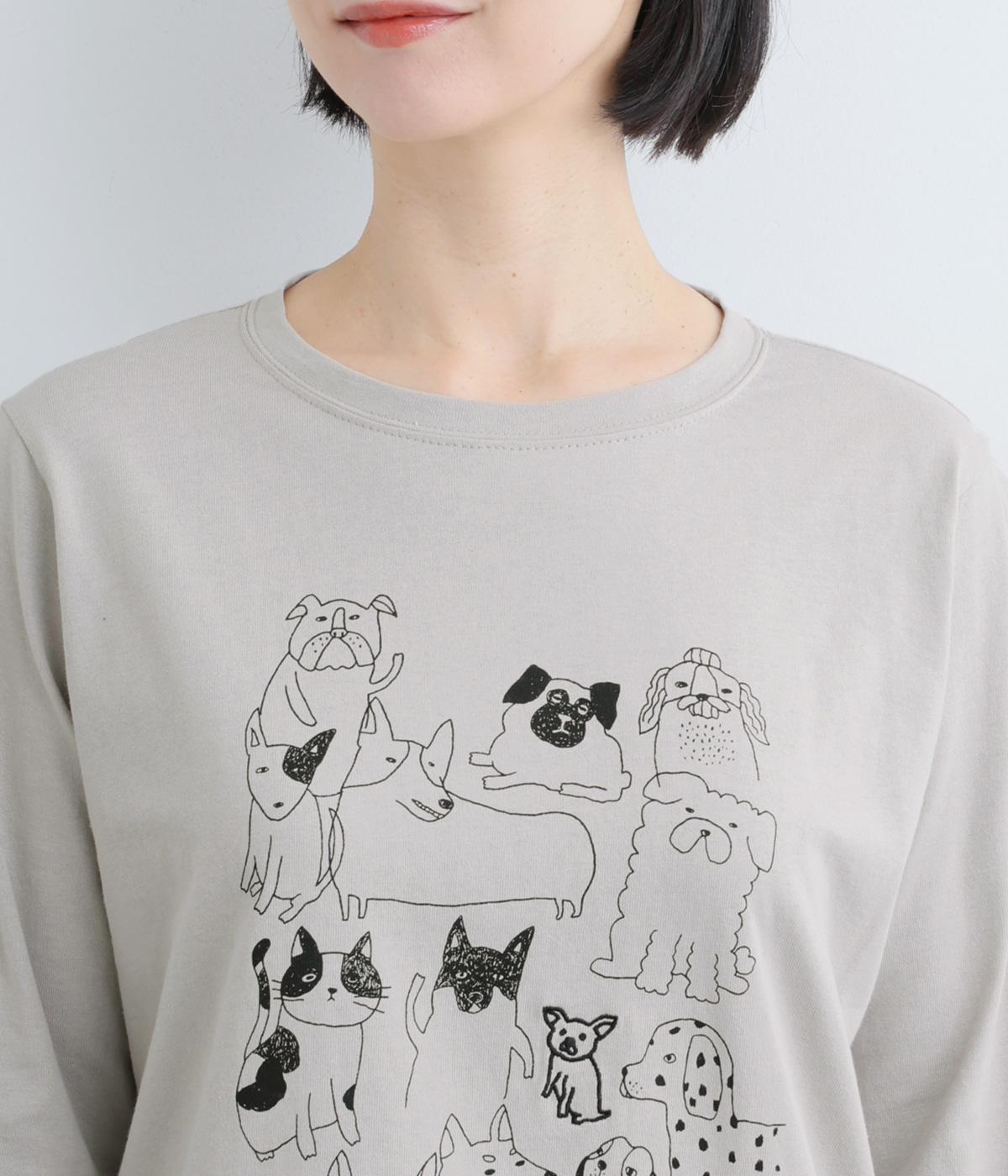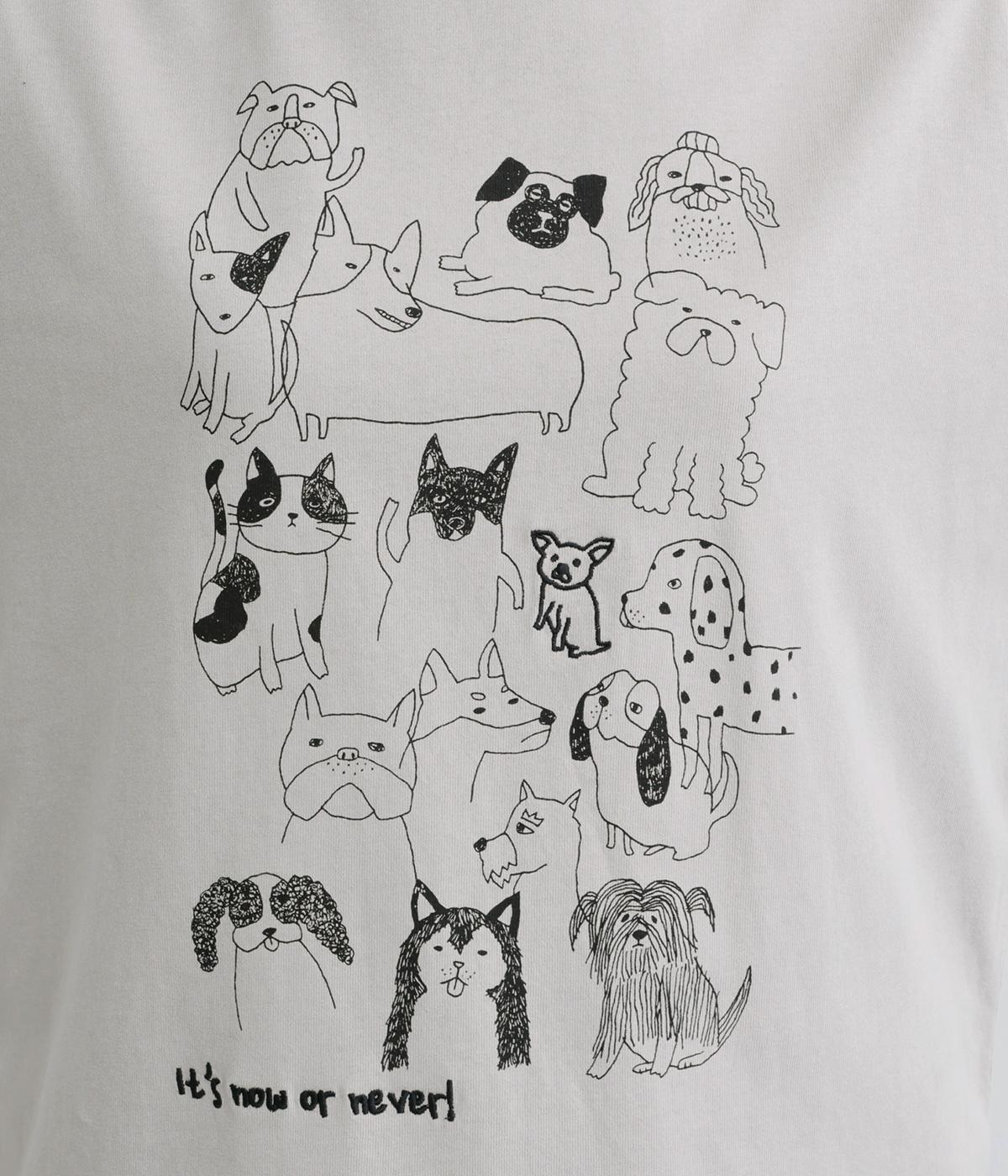 定番のスタイルに犬の絵がプリントされた遊び心のある一着。アクセントにもなる絵柄は落書き風でリラックス感溢れるタッチです。アーティスティックな雰囲気の犬と猫たちを主役に、シンプルに着こなしたいアイテムです。