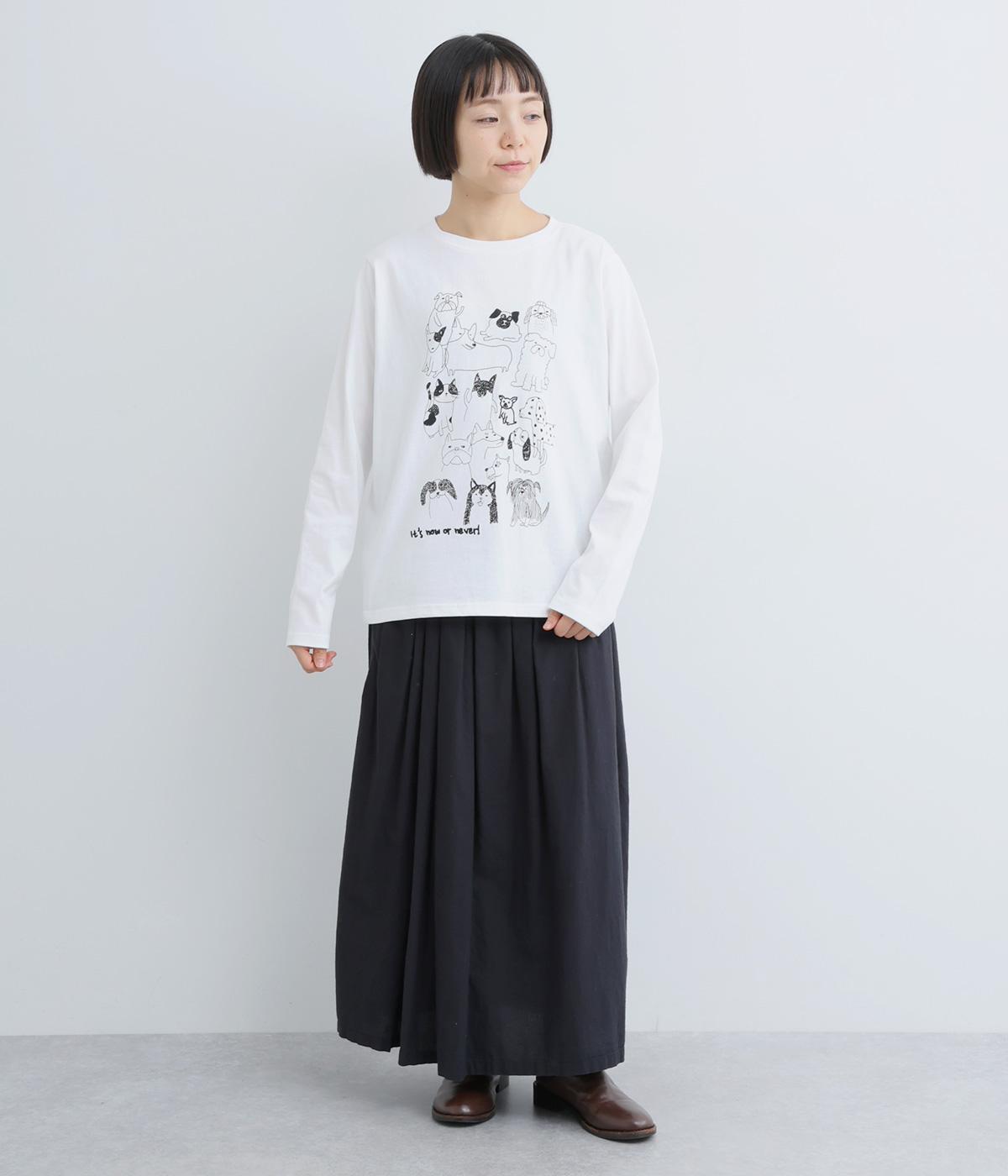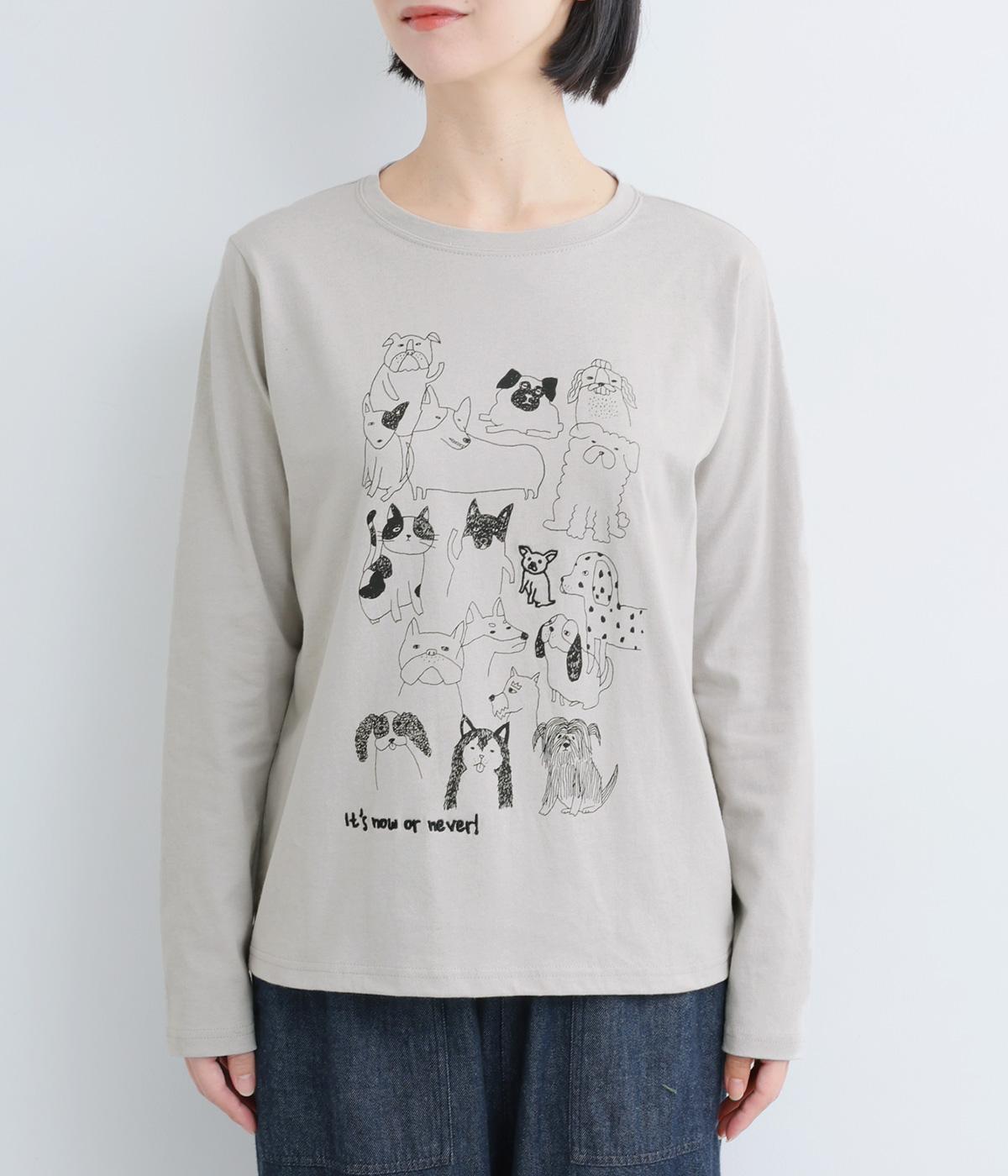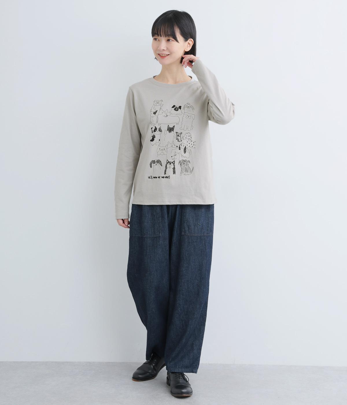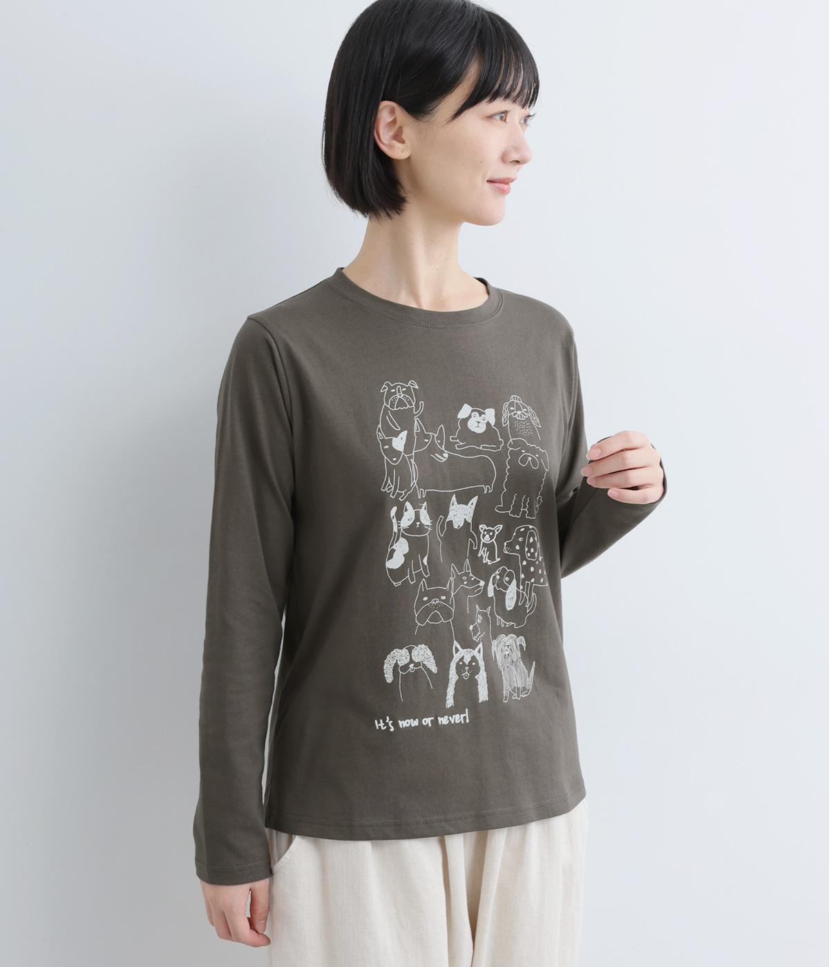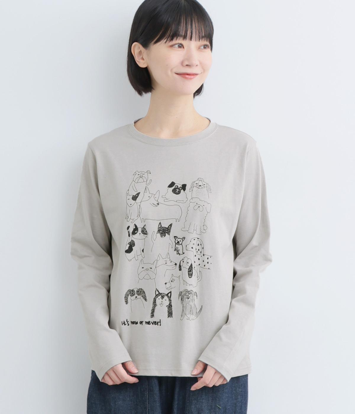 定番のスタイルに犬の絵がプリントされた遊び心のある一着。アクセントにもなる絵柄は落書き風でリラックス感溢れるタッチです。アーティスティックな雰囲気の犬と猫たちを主役に、シンプルに着こなしたいアイテムです。